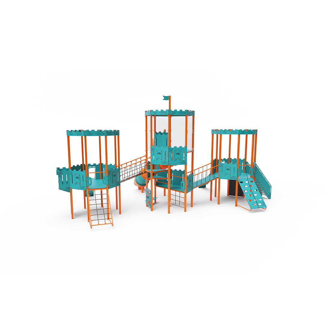 Großes Kombinationsset – Ein Achteck mit Rutsche als zentralem Turm wird durch zwei achteckige Seilrutschen ergänzt, die durch Seilbrücken und eine feste Brücke verbunden sind. Das Set beinhaltet Stufen, vertikale Seilnetze, eine schräge Kletterwand, ein Kletterseil, Kleinfeldspiele, einen Abakus und eine Zeichentafel. Wer sich nicht traut, die Rutsche hinunterzurutschen, kann dies tun. Die Stahlkonstruktion ist dank Feuerverzinkung und widerstandsfähiger Pulverbeschichtung witterungsbeständig. Das verwendete HPL-Material ist chemikalienbeständig, UV-beständig, farbecht, ungiftig, recycelbar und bruchfest. Es besteht keine Verletzungsgefahr durch scharfe Kanten oder Splitter. Die Seile bestehen aus Polyesterfasern, die um eine zentrale Verstärkung gewickelt sind. Diese Konstruktion erhöht die Festigkeit und Widerstandsfähigkeit der Seile gegen mechanische Belastung. Das Polyester selbst ist resistent gegen Mikroorganismen und Witterungseinflüsse, trocknet nach Regen schnell, ist farbecht und zeichnet sich durch hohe Festigkeit aus. Alle Verbindungen sind aus Edelstahl und mit Kunststoffkappen versehen, um Haltbarkeit und Sicherheit zu erhöhen.