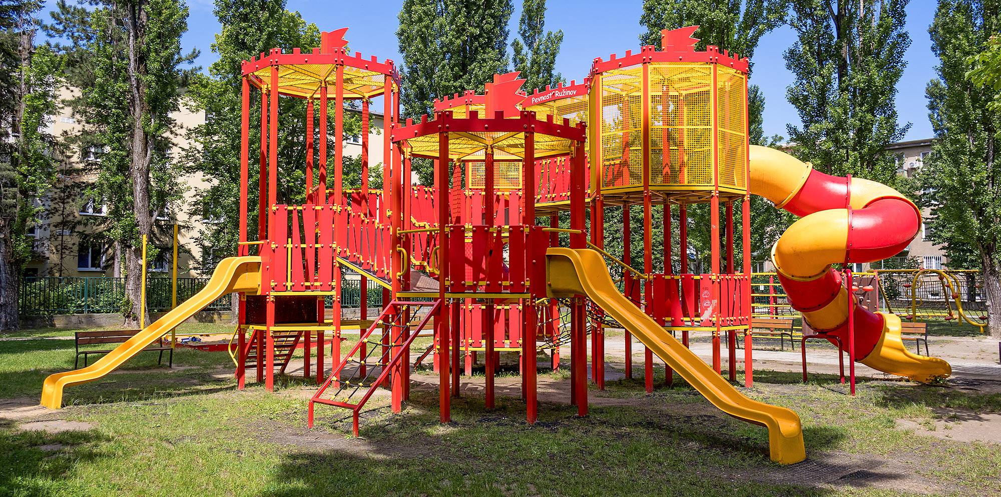 Großes Kletterturm-Set – Die achteckigen Türme sind durch eine feste Brücke mit Geländer, eine schräge Seilbrücke, eine Seilbrücke und einen festen Brückenverschluss miteinander verbunden. Das Set beinhaltet Stufen, Kletterwände, Seilnetze, schräge Seilklettergerüste, Leitern, zwei Rutschen und zwei Rodel. Das rot-gelbe Design lockt Kinder schon von Weitem zum Spielen an. Die Stahlkonstruktion ist dank Feuerverzinkung und widerstandsfähiger Pulverbeschichtung witterungsbeständig. Der verwendete HDPE-Kunststoff ist chemikalienbeständig, UV-beständig, farbecht, ungiftig, recycelbar und bruchfest. Es besteht keine Verletzungsgefahr durch scharfe Kanten oder Splitter. Die Seile bestehen aus Polyesterfasern, die um eine zentrale Verstärkung gewickelt sind. Diese Konstruktion erhöht die Festigkeit und Widerstandsfähigkeit der Seile gegen mechanische Belastung. Das Polyester selbst ist resistent gegen Mikroorganismen und Witterungseinflüsse, trocknet nach Regen schnell, ist farbecht und zeichnet sich durch hohe Festigkeit aus. Alle Verbindungen sind aus Edelstahl und mit Kunststoffkappen versehen, um Haltbarkeit und Sicherheit zu erhöhen.