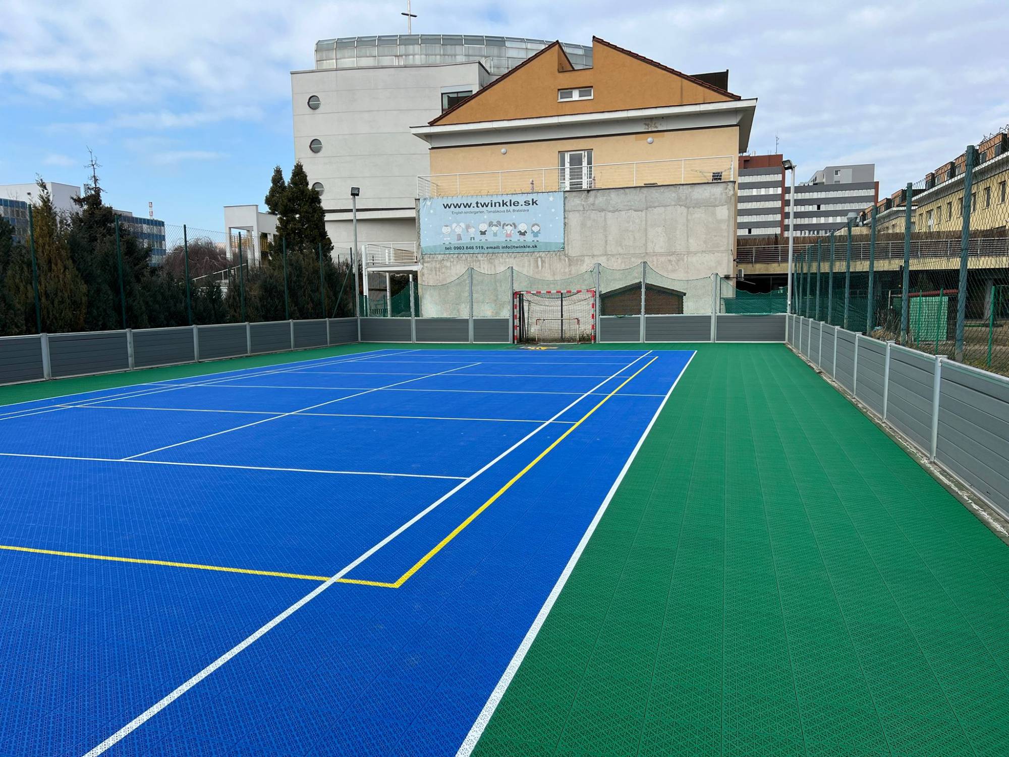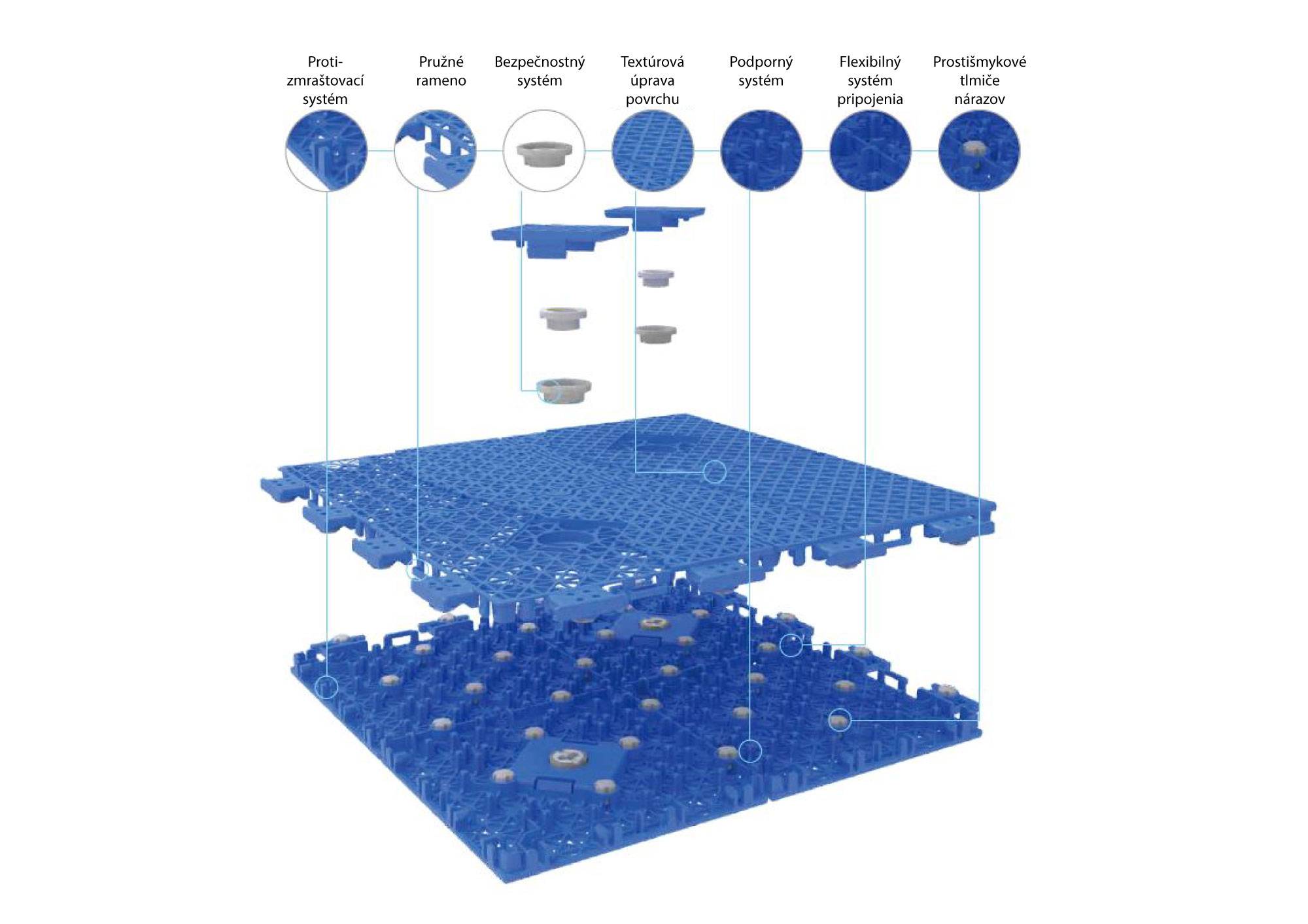 Multifunktionale Sportfläche für Inline- und Hockeybälle, geeignet für den Innen- und Außenbereich. Die strukturierte Oberfläche sorgt für optimale Haftung und minimiert Lichtreflexionen. Jedes Segment ist durch vier gebogene Teleskopgelenke verbunden, die die Haftung am Untergrund sowie die Wärmeausdehnung und -kontraktion optimieren. Das System ist einfach zu montieren und verbindet die einzelnen Segmente gleichzeitig fest. Jedes Segment verfügt über mehr als vier flexible Arme und elastische Säulen, die ein Durchbiegen der Oberfläche durch Temperaturerhöhungen verhindern. Das Anti-Falten-System mit mehr als acht Lamellen und Quersäulen pro Segment verhindert Risse durch Temperaturabfall. Die Oberfläche wird alle drei Meter mit einem Segment mit speziellem Muster verankert, das eine feste Verbindung zum Untergrund gewährleistet. Diese Bodenverankerung gewährleistet eine bessere Stoßdämpfung, höhere Montagegenauigkeit und Sicherheit gegen Verrutschen und Diebstahl.