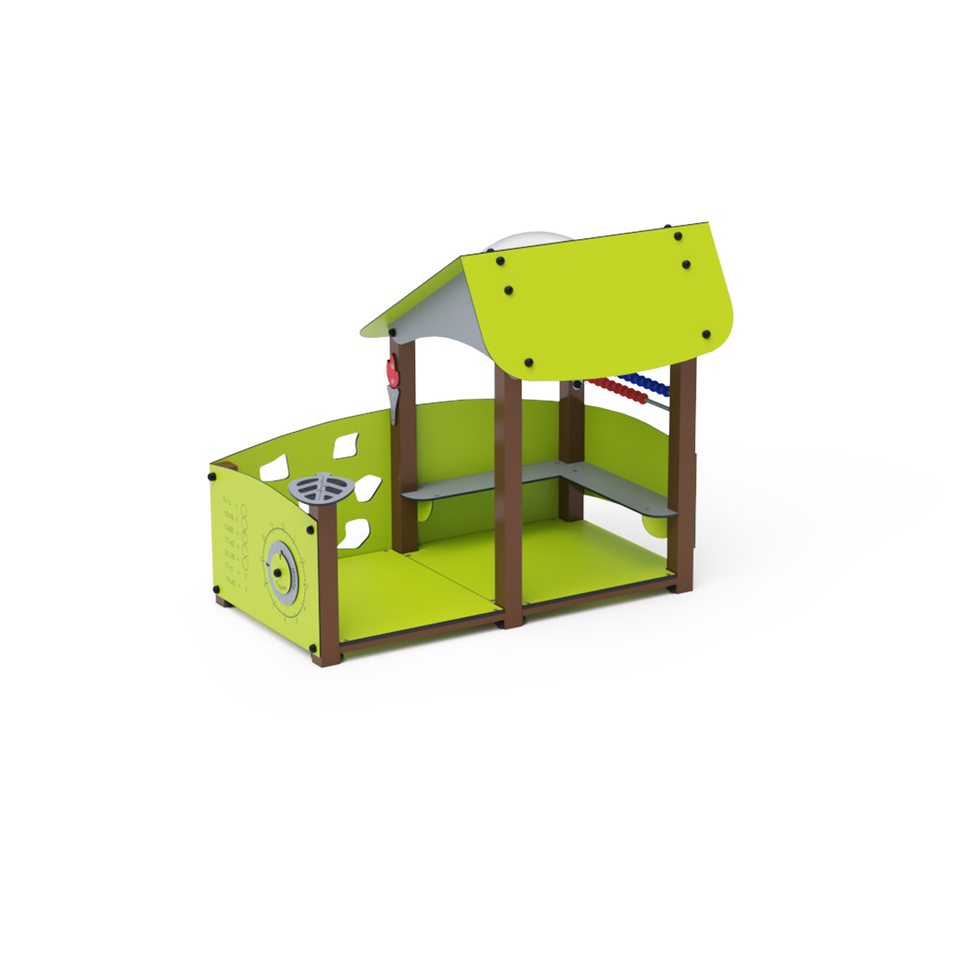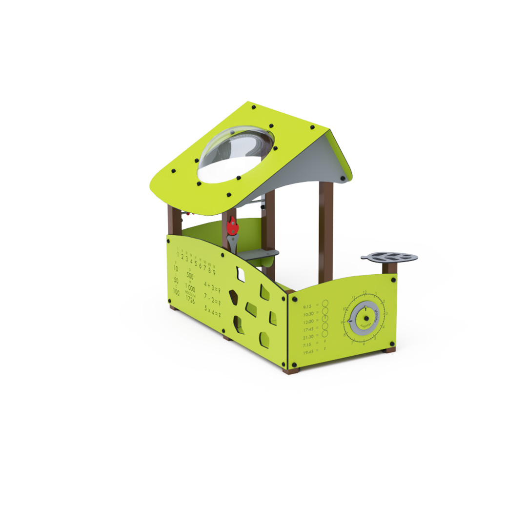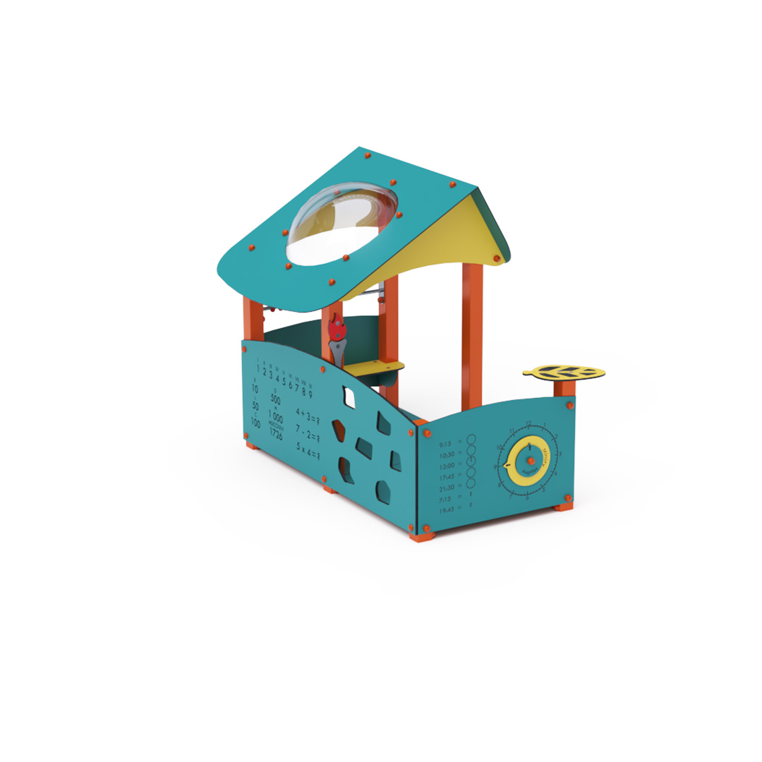 Ein Lernhaus voller Spaß, das Kindern nicht nur Neues beibringt, sondern sie auch unterhält. Das Haus mit seinem schrägen Dach ist mit Lerntafeln mit Zahlen und einer Uhr, einer Mini-Kletterwand und einem kleinen Abakus ausgestattet.