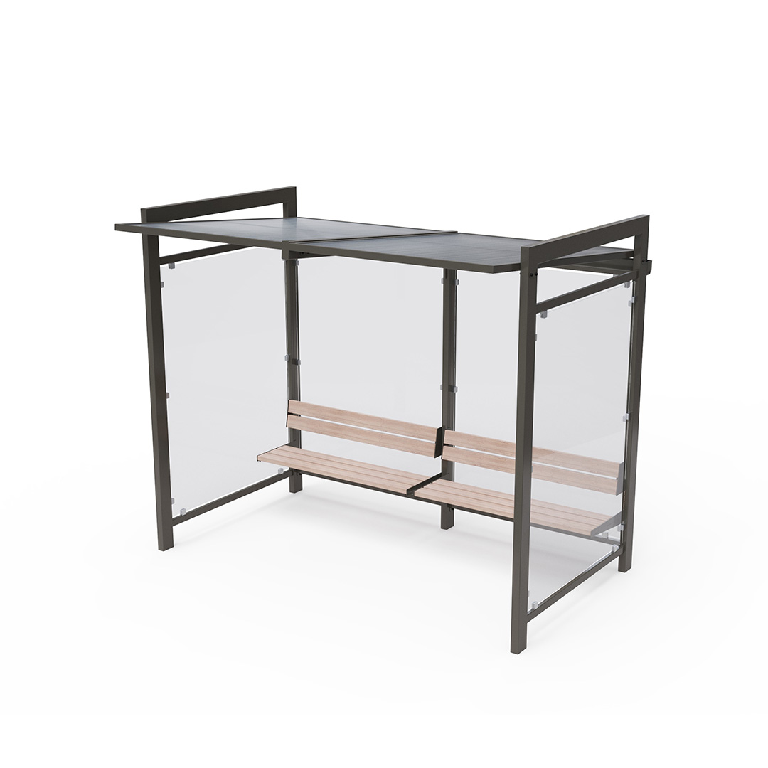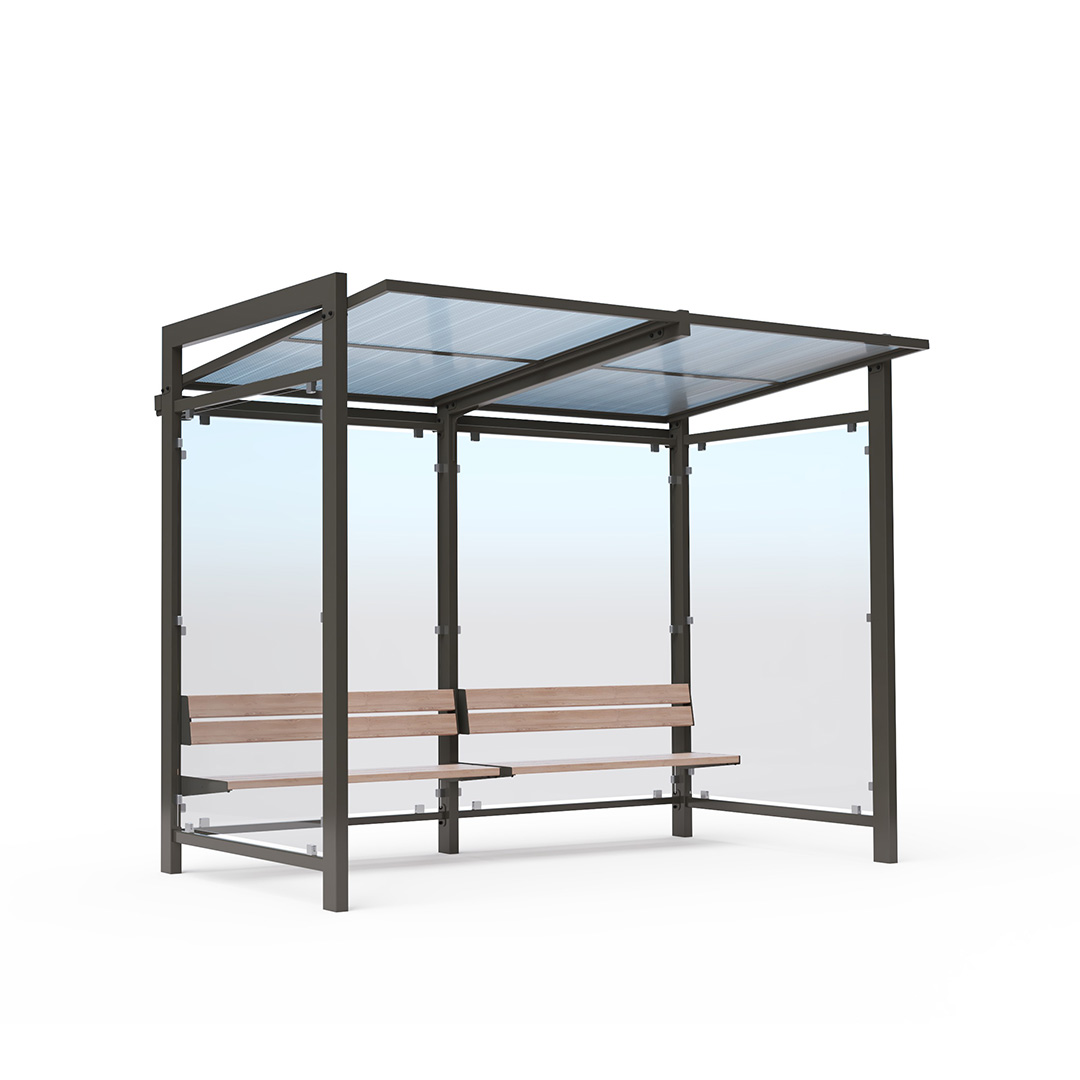 Design-Bushaltestelle, dreiseitig geschlossen. Die Konstruktion besteht aus verzinktem und pulverbeschichtetem Stahl, Befestigungselemente und Griffe aus Edelstahl. Das Dach ist aus Polycarbonat-Hohlkammerplatten gefertigt, die Verkleidung aus Sicherheitsglas. Die Sitzlatten sind aus Lärchenholz. Das Wasser läuft in ein Zelt an der Rückseite der Haltestelle ab. Möglichkeit zur individuellen Gestaltung der Flagge nach Bedarf.