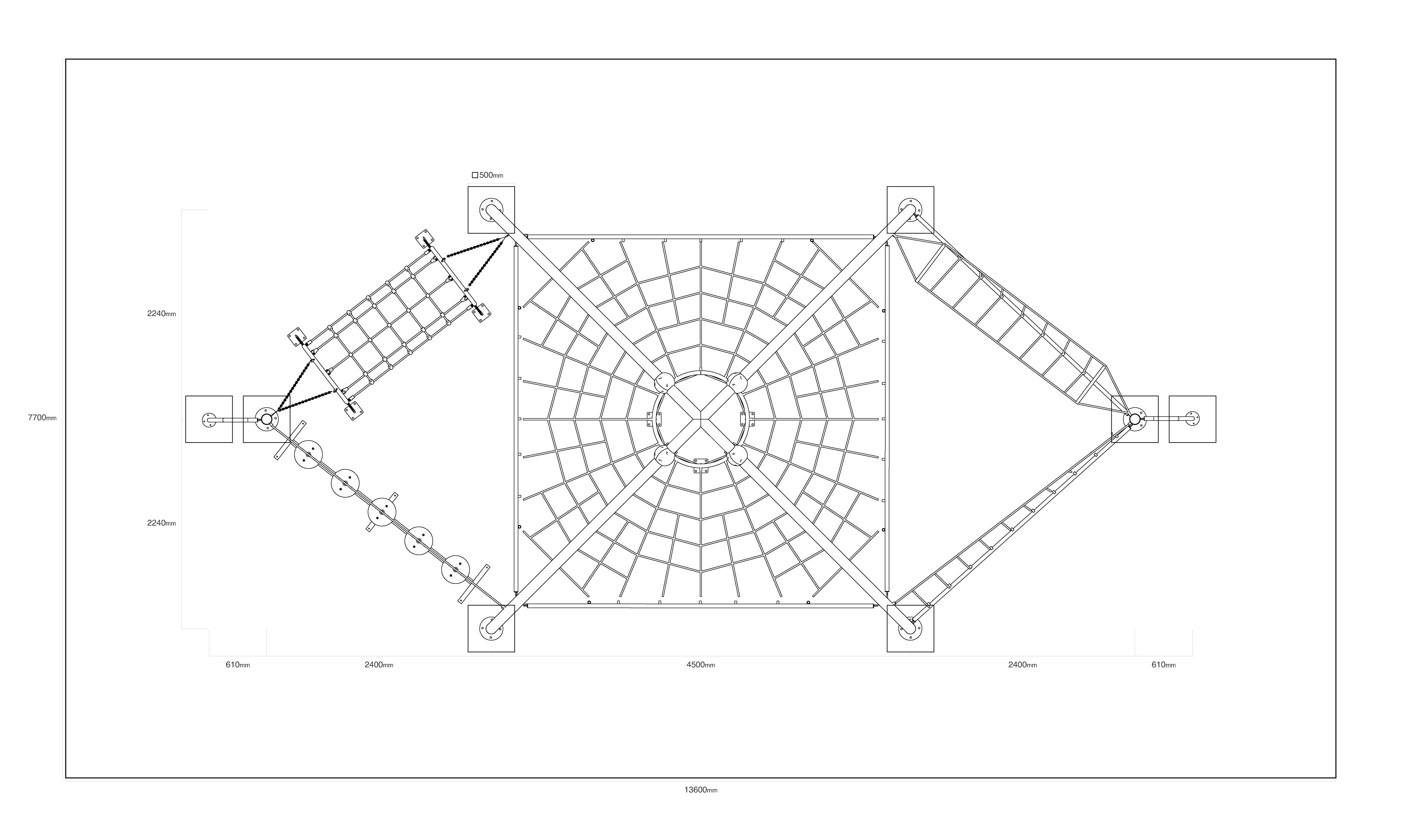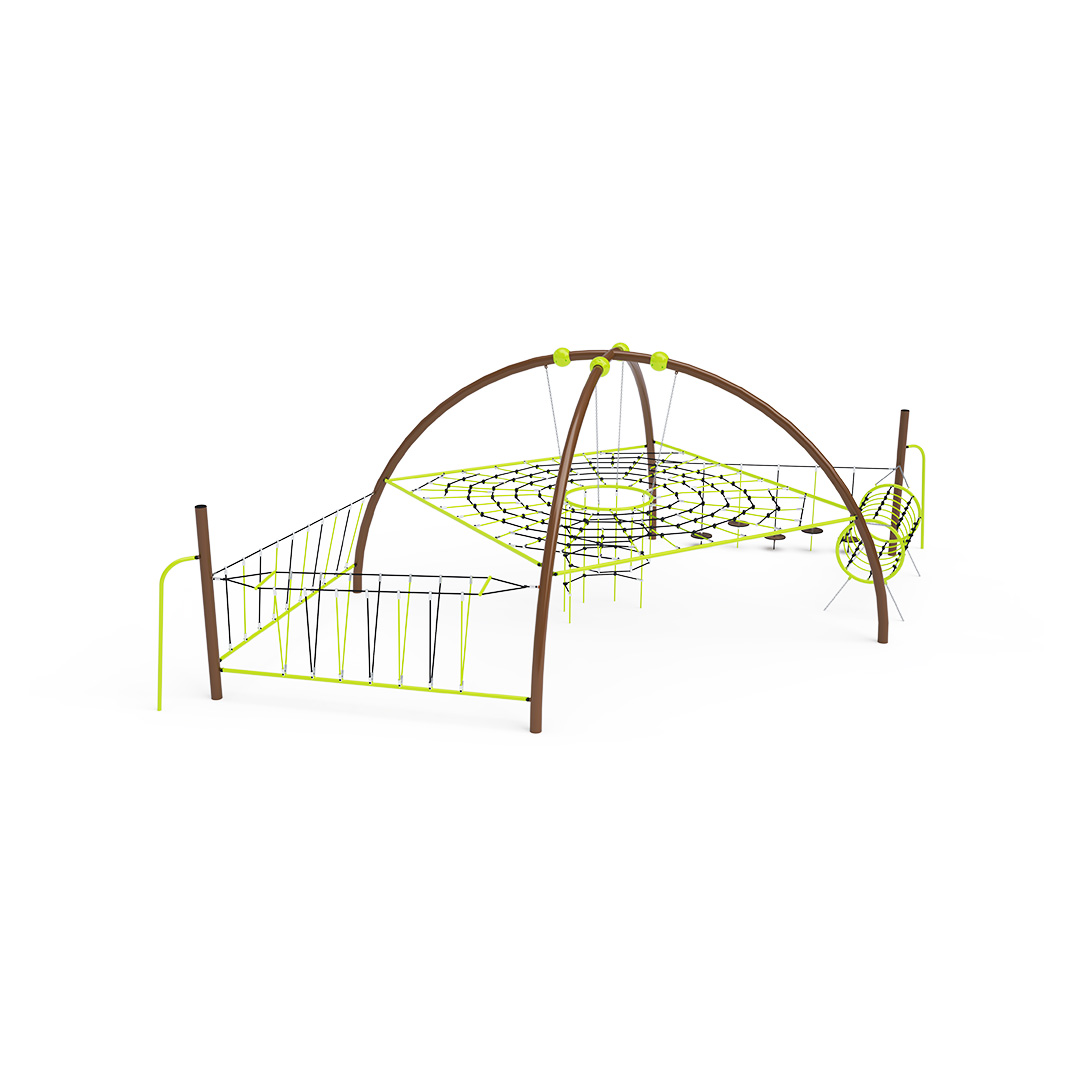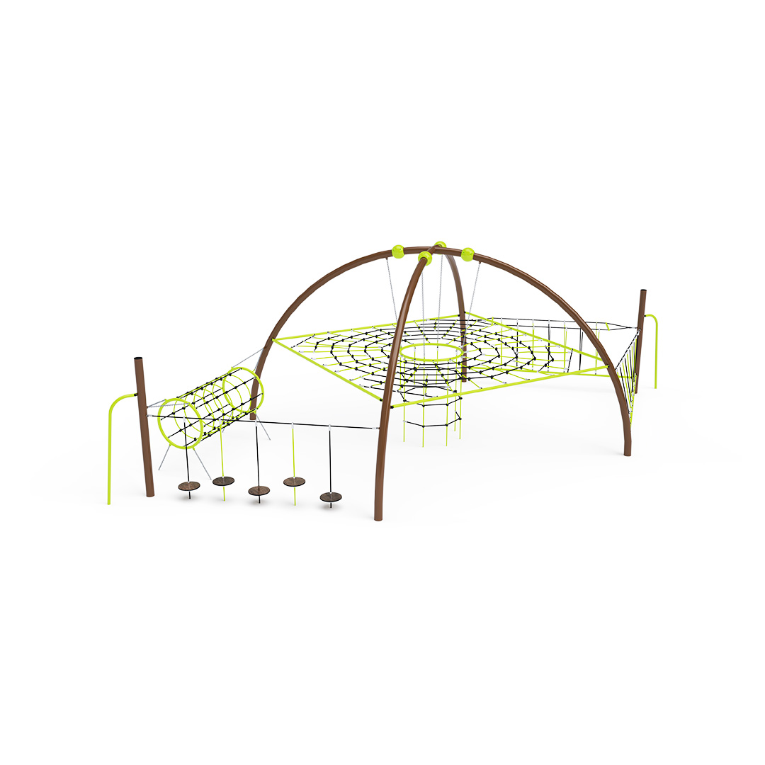 Das kombinierte Seilklettergerüst bietet vielfältige Spielmöglichkeiten. Es besteht aus einem Seiltunnel, Balancierstufen, zwei Seilwänden, einem horizontalen Seiltunnel und einem großen Seilboden. Die Spielelemente sind aus verzinktem Stahl mit hochwertiger Oberflächenbehandlung gefertigt. Die Verbindungen bestehen aus Edelstahl und sind mit Kunststoffkappen versehen, um die Sicherheit und Langlebigkeit zu erhöhen. Die Seile bestehen aus Polyesterfasern, die um den Kern gewickelt sind. Diese Konstruktion erhöht die Festigkeit und Widerstandsfähigkeit gegen mechanische Belastung. Polyester selbst besitzt viele positive Eigenschaften: Es ist resistent gegen Mikroorganismen, witterungsbeständig, trocknet schnell nach Regen, ist farbecht und zeichnet sich durch hohe Festigkeit aus.