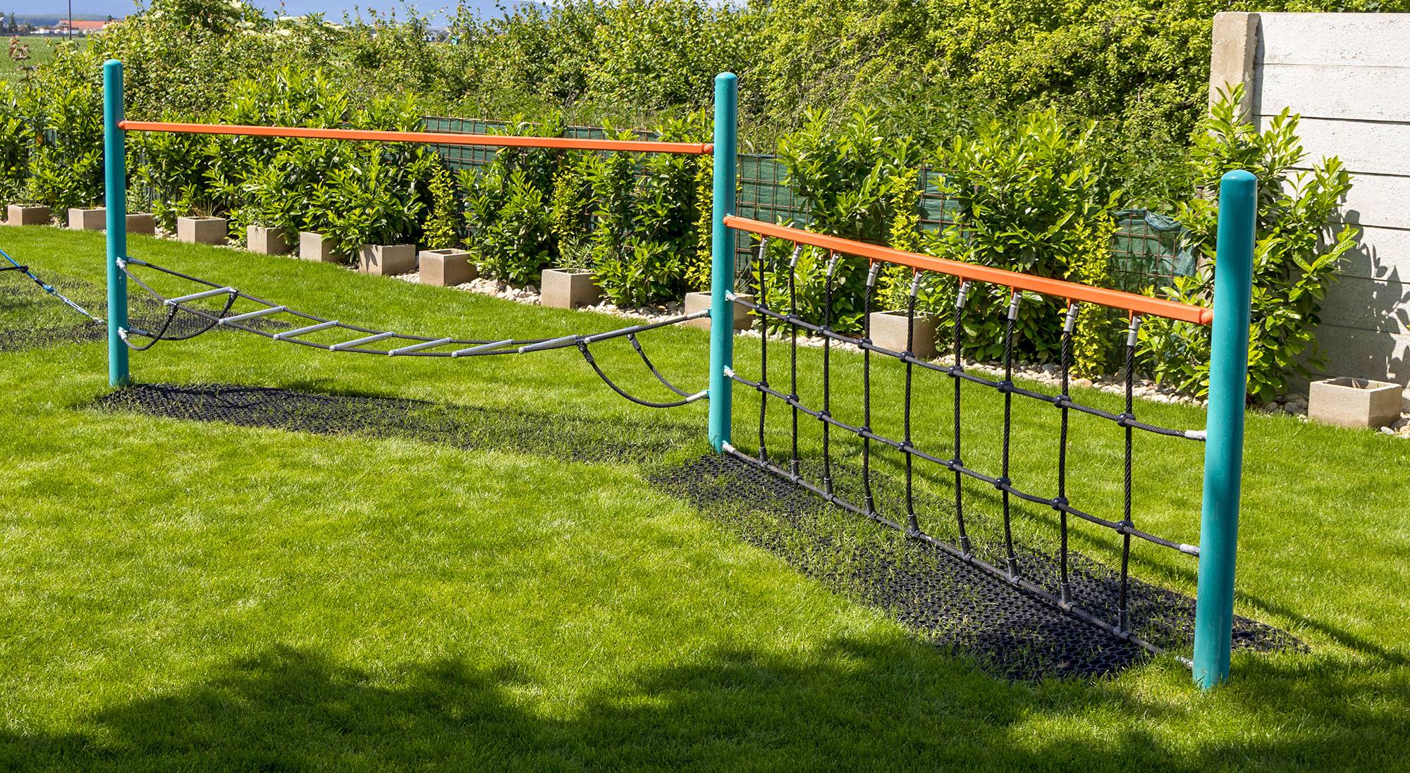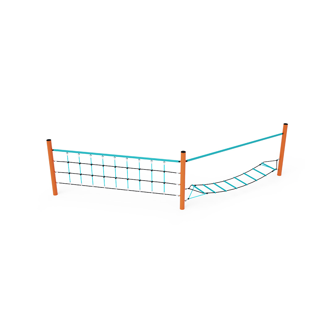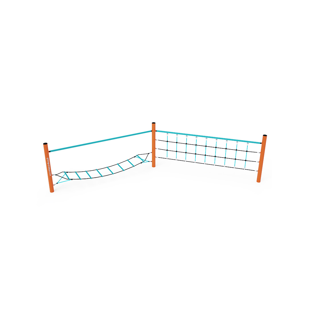 Ein Affenparcours, der aus zwei Teilen besteht. Der erste Teil, ein horizontales Hängenetz, bietet Kindern mit seiner Instabilität jede Menge Spaß. Es ist gar nicht so einfach, die schrägen Stufen zu begehen. Der zweite Teil, ein vertikales Seilnetz, stellt die Handkraft jedes Kindes auf die Probe. Das Spielelement ist aus feuerverzinktem Stahl mit hochwertiger Oberflächenveredelung gefertigt. Die Verbindungsstücke bestehen aus Edelstahl und sind mit Kunststoffkappen versehen, um Sicherheit und Langlebigkeit zu gewährleisten. Die Seile sind aus Polyesterfasern gefertigt, die um den Kern gewickelt sind. Diese Konstruktion erhöht die Festigkeit und Widerstandsfähigkeit der Seile gegen mechanische Belastung. Polyester besitzt viele positive Eigenschaften. Es ist resistent gegen Mikroorganismen und Witterungseinflüsse, trocknet schnell nach Regen, ist farbecht und zeichnet sich durch hohe Festigkeit aus.