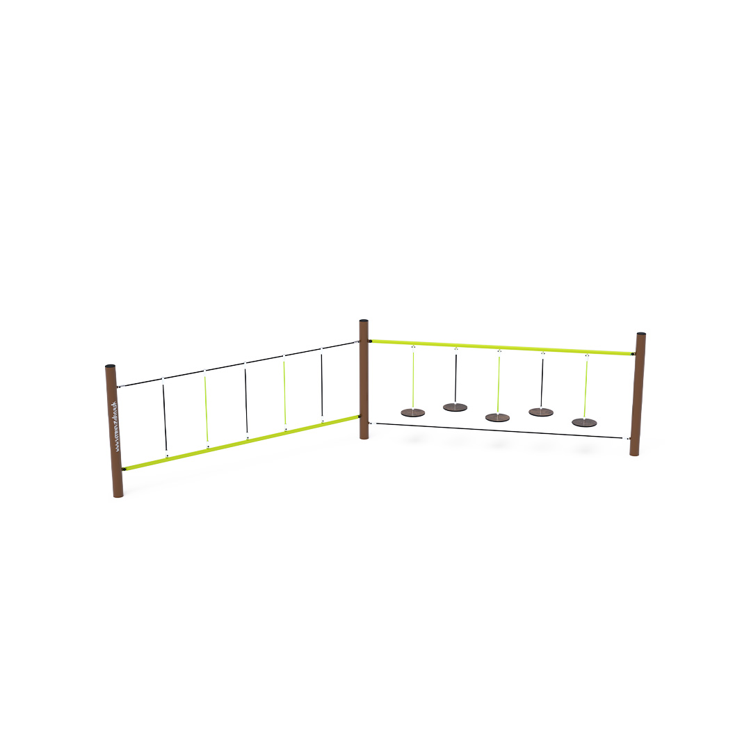 Ein Affenparcours, der aus zwei Teilen besteht. Ein Teil eignet sich zum seitlichen Festhalten. Obwohl das Kind auf einer stabilen Stange steht, muss es sich am Seil festhalten, das nun nicht mehr so stark ist. Der zweite Teil mit hängenden „Steinen“ testet die Konzentrationsfähigkeit und gleichzeitig die Koordination des gesamten Körpers. Von einem frei hängenden Stein zum nächsten zu gelangen, ist gar nicht so einfach. Das Spielelement ist aus feuerverzinktem Stahl mit einer hochwertigen Oberflächenbehandlung gefertigt. Die Verbindungsstücke sind aus Edelstahl und mit Kunststoffkappen versehen, um die Sicherheit und Haltbarkeit zu erhöhen. Die Seile bestehen aus Polyesterfasern, die um den Kern gewickelt sind. Diese Konstruktion erhöht die Festigkeit und Widerstandsfähigkeit des Seils gegen mechanische Belastung. Polyester besitzt viele positive Eigenschaften. Es ist resistent gegen Mikroorganismen und Witterungseinflüsse, trocknet schnell nach Regen, ist farbecht und zeichnet sich durch hohe Festigkeit aus.
