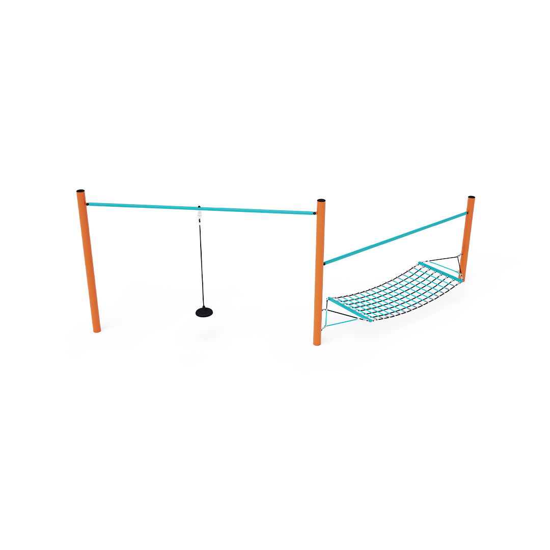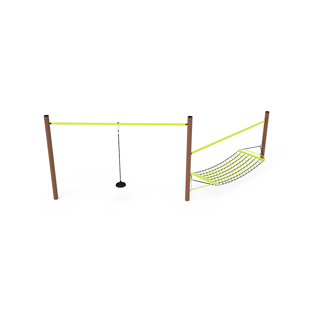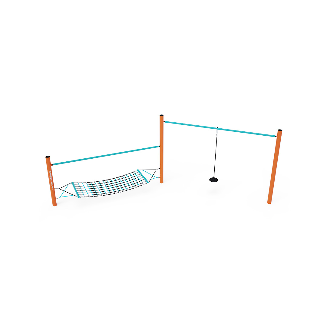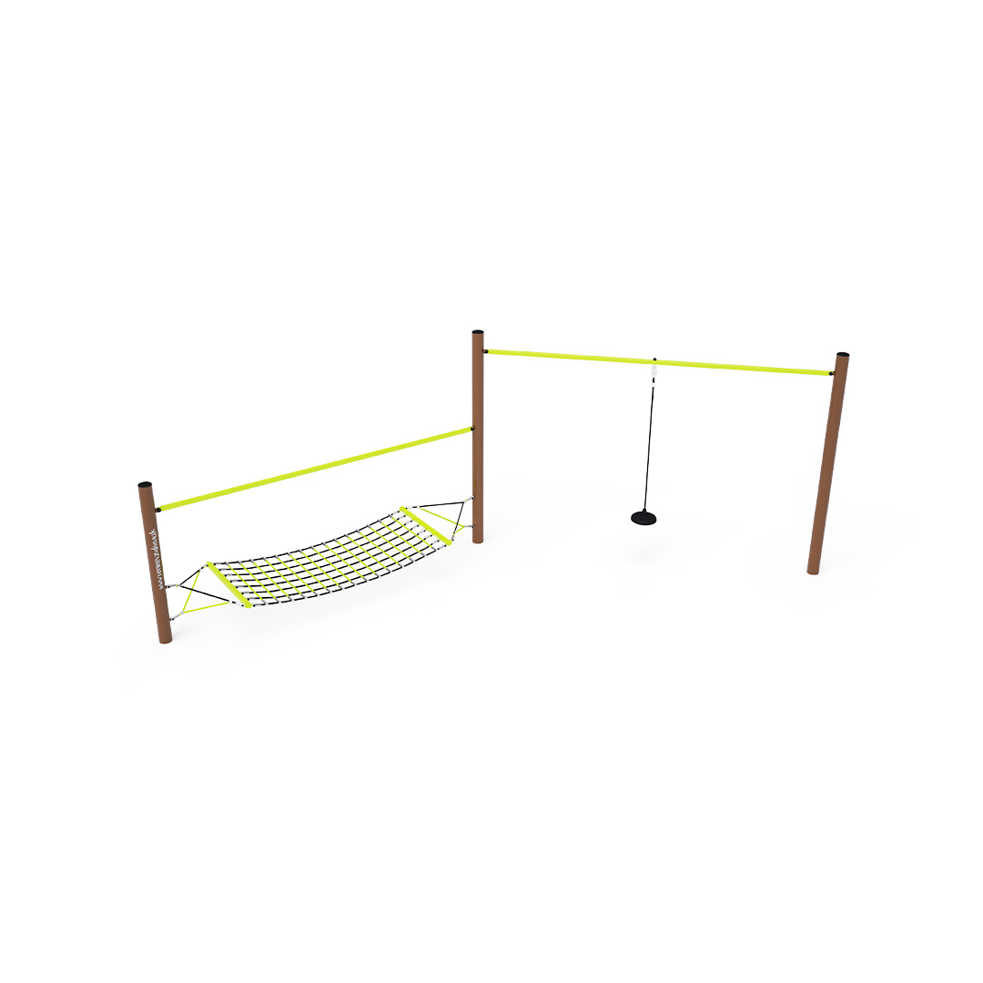 Ein Affenparcours, der aus zwei Teilen besteht. Ein Teil eignet sich zum Balancieren und Entspannen. Der zweite Teil ist ein frei hängendes Seil mit breitem Ende – ein einfaches, aber vielseitiges Element. Das Spielelement ist aus feuerverzinktem Stahl mit hochwertiger Oberflächenveredelung gefertigt. Die Verbindungen bestehen aus Edelstahl und sind mit Kunststoffkappen versehen, um die Sicherheit und Langlebigkeit zu erhöhen. Die Seile bestehen aus Polyesterfasern, die um den Kern gewickelt sind. Diese Konstruktion erhöht die Festigkeit und Widerstandsfähigkeit des Seils gegen mechanische Belastung. Polyester besitzt viele positive Eigenschaften. Es ist resistent gegen Mikroorganismen und Witterungseinflüsse, trocknet schnell nach Regen, ist farbecht und zeichnet sich durch hohe Festigkeit aus.