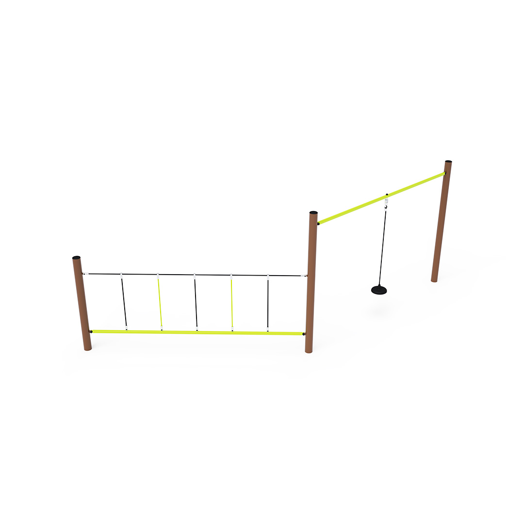 Ein Affenparcours, der aus zwei Teilen besteht. Der erste Teil ist ein Seil mit einer Verlängerung am Ende – ein einfaches, aber vielseitiges Spielelement. Der zweite Teil eignet sich zum seitlichen Ziehen. Obwohl das Kind auf einer stabilen Stange steht, muss es sich am Seil festhalten, das dadurch weniger reißfest ist. Das Spielelement ist aus feuerverzinktem Stahl mit hochwertiger Oberflächenveredelung gefertigt. Die Verbindungsstücke bestehen aus Edelstahl und sind mit Kunststoffkappen versehen, um die Sicherheit und Langlebigkeit zu erhöhen. Die Seile bestehen aus Polyesterfasern, die um den Kern gewickelt sind. Diese Konstruktion erhöht die Festigkeit und Widerstandsfähigkeit des Seils gegen mechanische Belastung. Polyester besitzt viele positive Eigenschaften. Es ist resistent gegen Mikroorganismen und Witterungseinflüsse, trocknet schnell nach Regen, ist farbecht und zeichnet sich durch hohe Festigkeit aus.