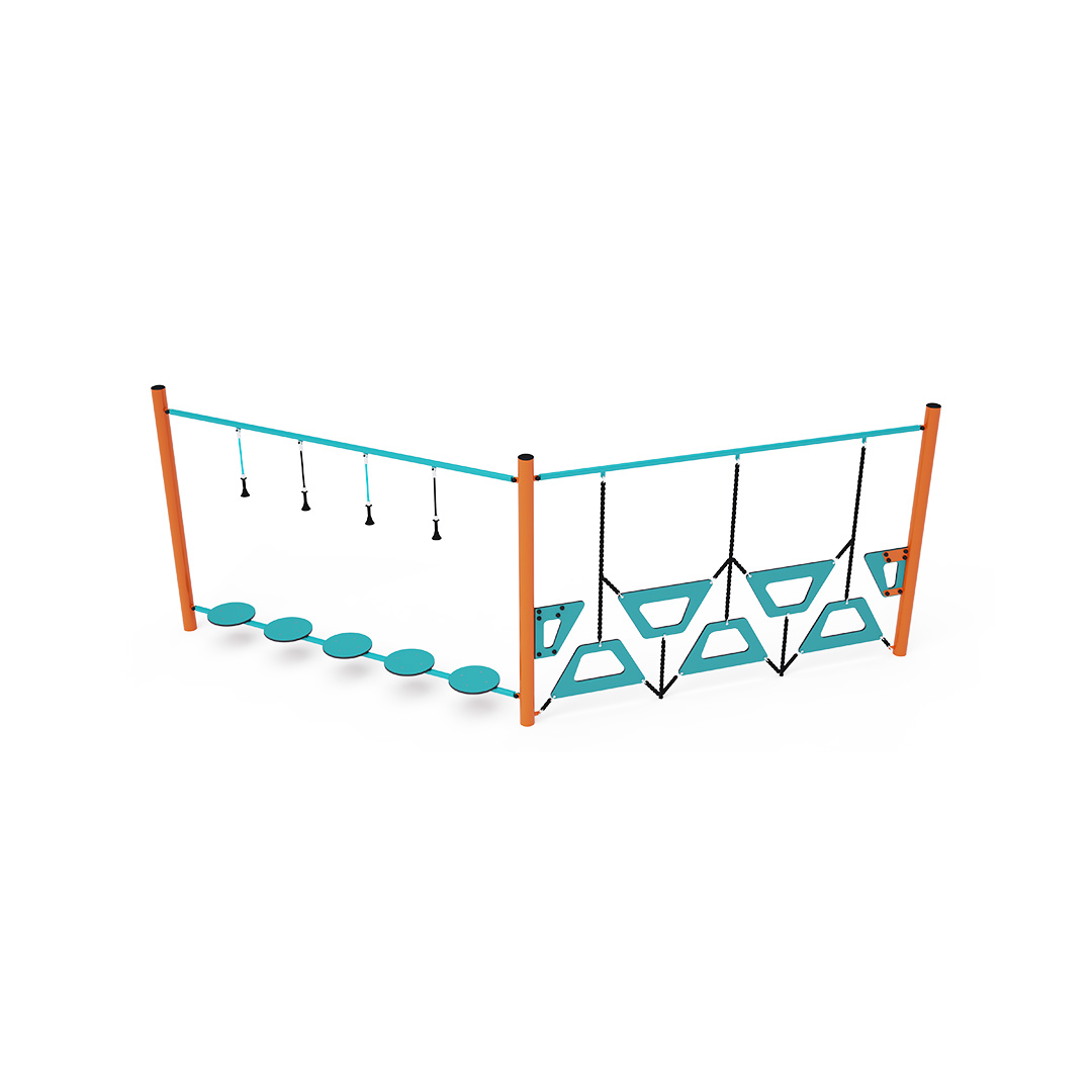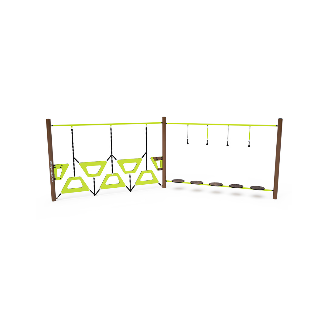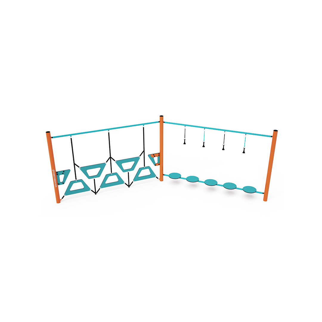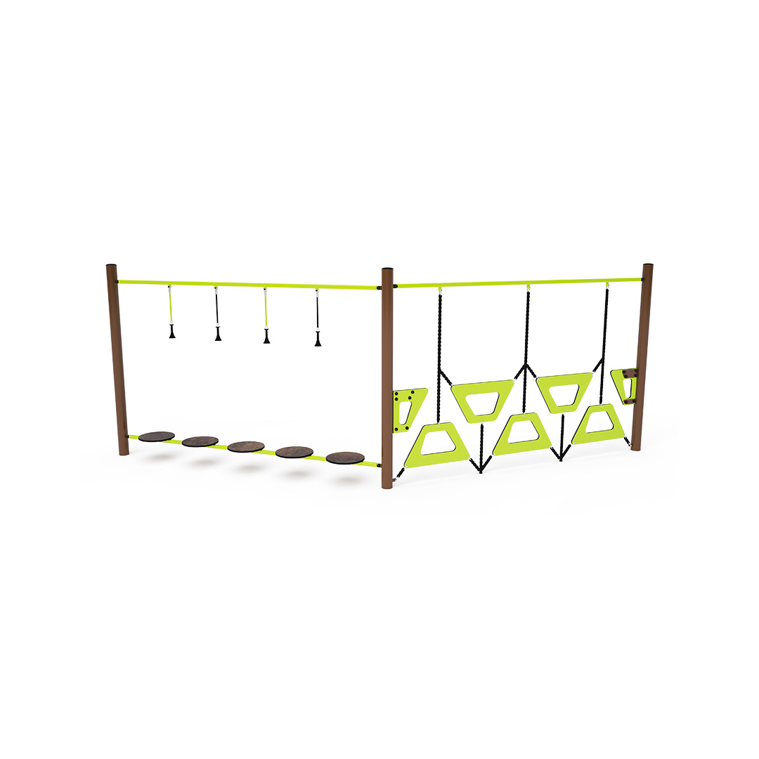Ein Affenparcours, der aus zwei Elementen besteht: HPL-Balancestufen mit zusätzlichen vertikalen Seilen und einer trapezförmigen Wand. Die Bewältigung dieses Spielelements ist nicht nur unterhaltsam, sondern auch anspruchsvoll. Das Spielelement ist aus verzinktem Stahl mit einer hochwertigen Pulverbeschichtung gefertigt. Die Verbindungsstücke bestehen aus Edelstahl und sind mit Kunststoffkappen versehen, um die Sicherheit und Langlebigkeit zu erhöhen. Die Seile bestehen aus Polyesterfasern mit einem Stahlkern, der um die Mitte gewickelt ist. Diese Konstruktion erhöht die Festigkeit und Widerstandsfähigkeit der Seile gegen mechanische Belastung. Polyester selbst besitzt viele positive Eigenschaften. Es ist resistent gegen Mikroorganismen und Witterungseinflüsse, trocknet schnell nach Regen, ist farbecht und zeichnet sich durch hohe Festigkeit aus.