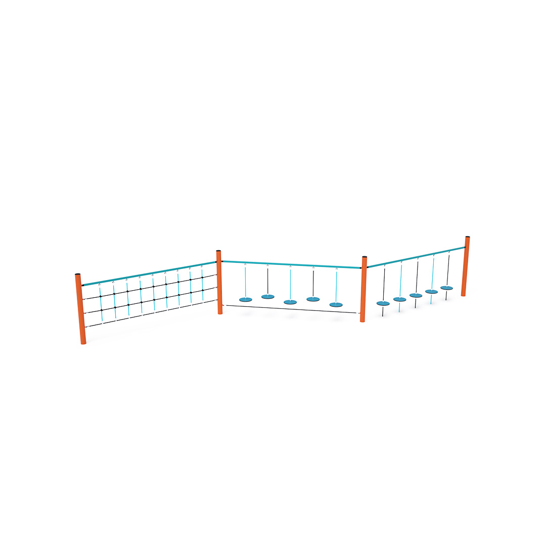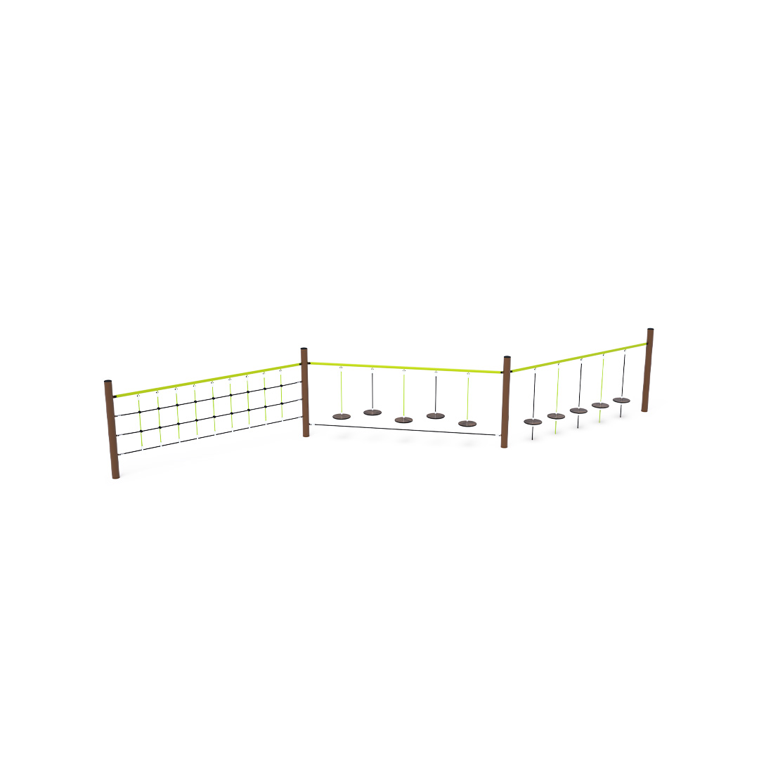 Ein Affenparcours, der aus drei Teilen besteht. Der erste Teil besteht aus vertikal hängenden Fußstützen, der zweite aus einem vertikalen Seilnetz, das die Handkraft der Kinder testet. Der dritte Teil mit hängenden „Steinen“ fördert Konzentration und Koordination. Von einem frei hängenden Stein zum nächsten zu gelangen, ist gar nicht so einfach. Die Spielelemente sind aus feuerverzinktem Stahl mit hochwertiger Oberflächenveredelung gefertigt. Die Verbindungsstücke bestehen aus Edelstahl und sind mit Kunststoffkappen versehen, um Sicherheit und Langlebigkeit zu gewährleisten. Die Seile bestehen aus Polyesterfasern, die um den Kern gewickelt sind. Diese Konstruktion erhöht die Festigkeit und Widerstandsfähigkeit der Seile gegen mechanische Belastung. Polyester besitzt viele positive Eigenschaften. Es ist resistent gegen Mikroorganismen, witterungsbeständig, trocknet schnell nach Regen, ist farbecht und zeichnet sich durch hohe Festigkeit aus.