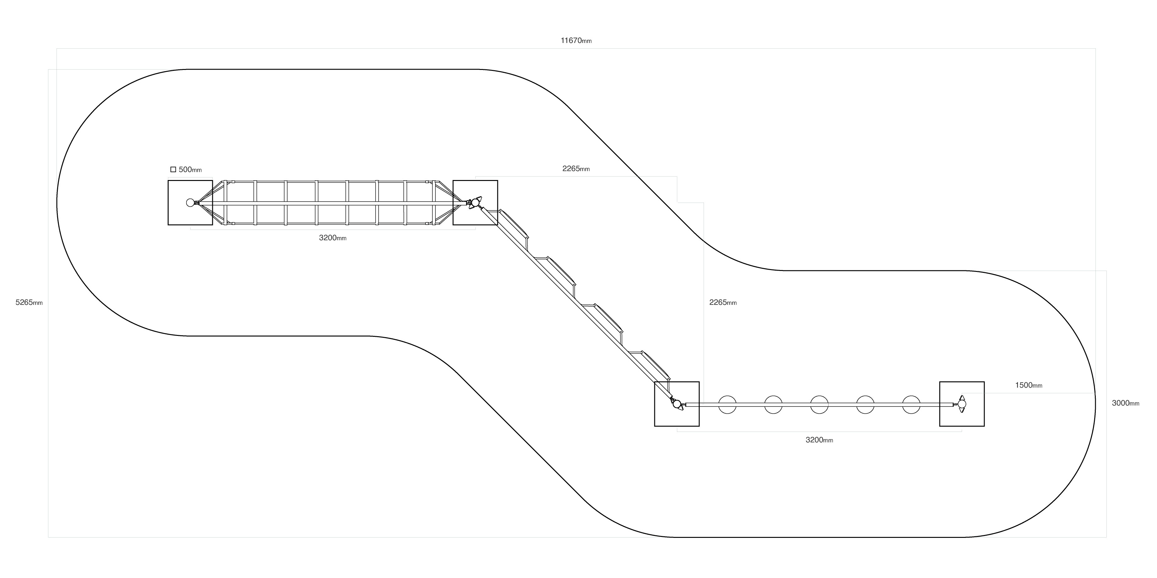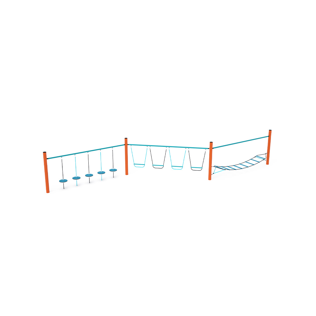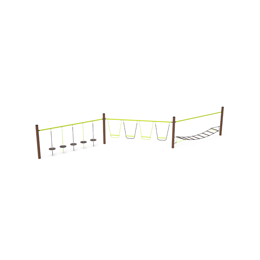 Ein Affenparcours, der aus drei Teilen besteht. Der erste Teil, ein horizontales Hängenetz, bietet Kindern mit seiner Instabilität viel Spaß. Der zweite Teil besteht aus vertikal angebrachten Fußstützen. Kinder erleben, wie lustig und anstrengend es ist, nicht festen Boden unter den Füßen zu haben. Der Teil mit den „hängenden Steinen“ fördert Konzentration und Koordination. Die Spielelemente sind aus feuerverzinktem Stahl mit hochwertiger Oberflächenveredelung gefertigt. Die Verbindungsstücke bestehen aus Edelstahl und sind mit Kunststoffkappen versehen, um Sicherheit und Langlebigkeit zu gewährleisten. Die Seile bestehen aus Polyesterfasern, die um den Kern gewickelt sind. Diese Konstruktion erhöht die Festigkeit und Widerstandsfähigkeit der Seile gegen mechanische Belastung. Polyester besitzt viele positive Eigenschaften. Es ist resistent gegen Mikroorganismen, witterungsbeständig, trocknet schnell nach Regen, ist farbecht und zeichnet sich durch hohe Festigkeit aus.