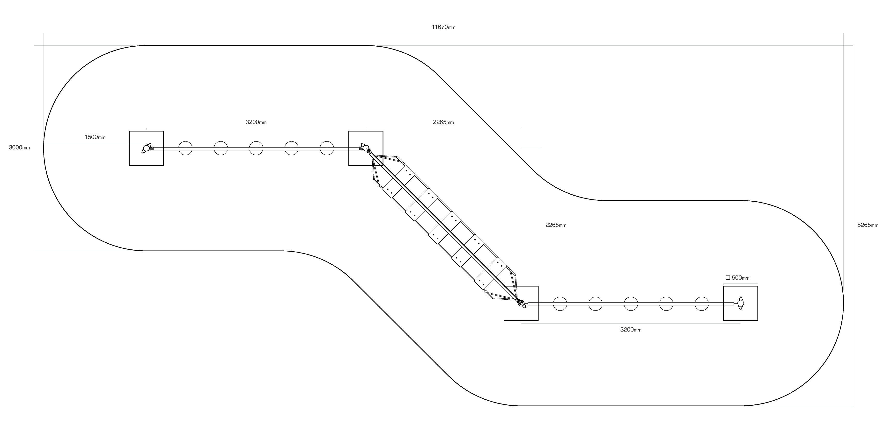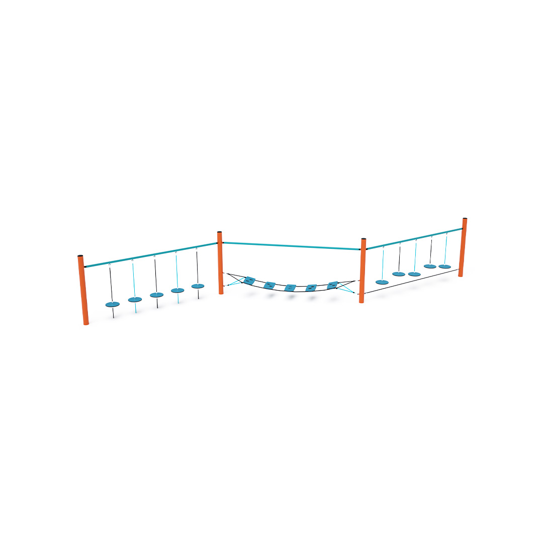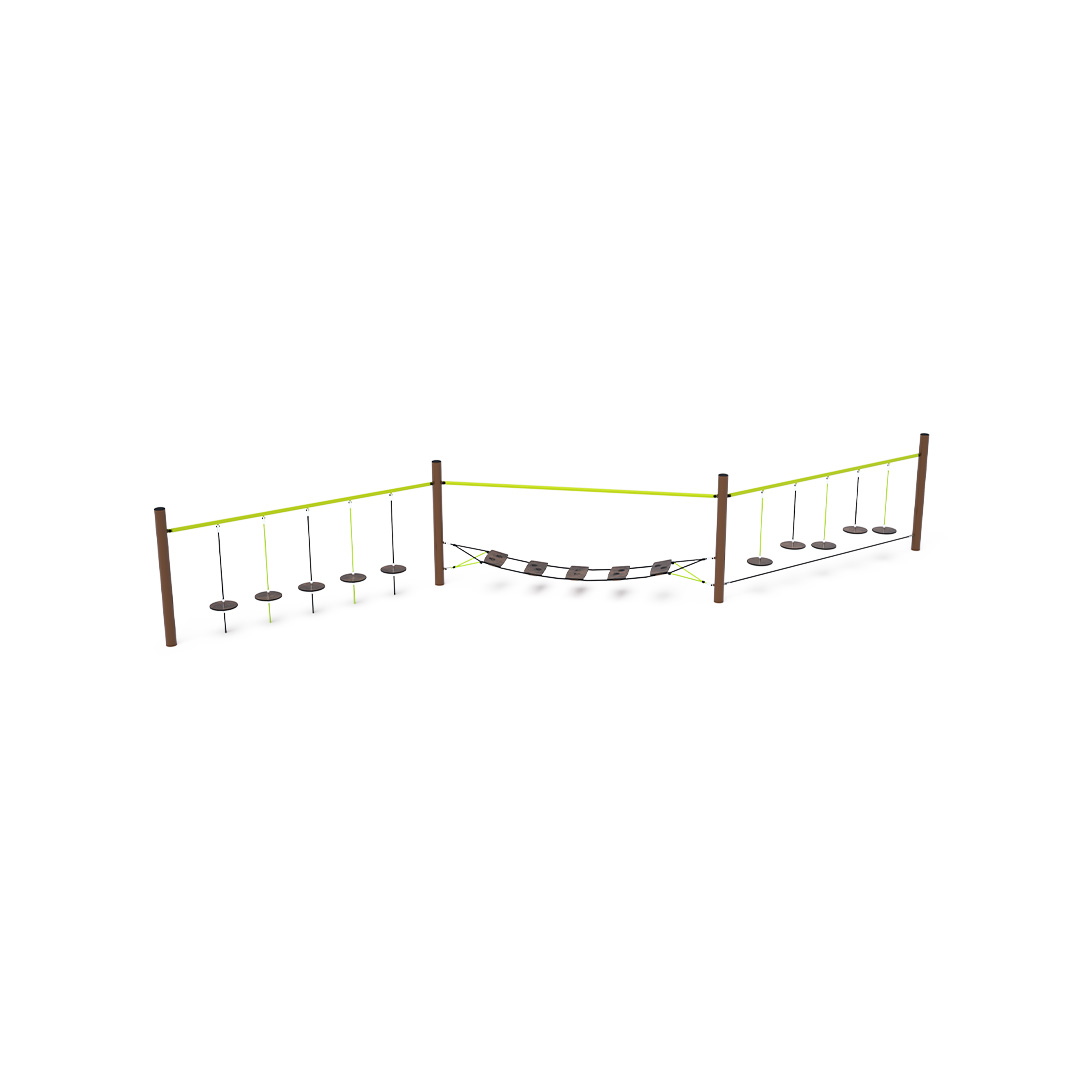 Ein Affenparcours, der aus drei Teilen besteht. Der erste Teil mit hängenden „Steinen“ testet die Konzentrationsfähigkeit und gleichzeitig die Körperkoordination. Der zweite Teil besteht aus HPL-Balancematten, die nicht nur den Gleichgewichtssinn der Kinder trainieren, sondern ihnen auch zeigen, welche Spuren verschiedene Tiere hinterlassen. Der dritte Teil besteht aus frei hängenden Stufen, die nebeneinander angeordnet sind. Dieses Spielelement zu bewältigen, macht nicht nur Spaß, sondern erfordert auch Anstrengung. Das Spielelement ist aus feuerverzinktem Stahl mit einer hochwertigen Oberflächenveredelung gefertigt. Die Verbindungsstücke sind aus Edelstahl und mit Kunststoffkappen versehen, um die Sicherheit und Haltbarkeit zu erhöhen. Die Seile bestehen aus Polyesterfasern, die um den Kern gewickelt sind. Diese Konstruktion erhöht die Festigkeit und Widerstandsfähigkeit der Seile gegen mechanische Belastung. Polyester besitzt viele positive Eigenschaften. Es ist resistent gegen Mikroorganismen, witterungsbeständig, trocknet schnell nach Regen, ist farbecht und zeichnet sich durch hohe Festigkeit aus.