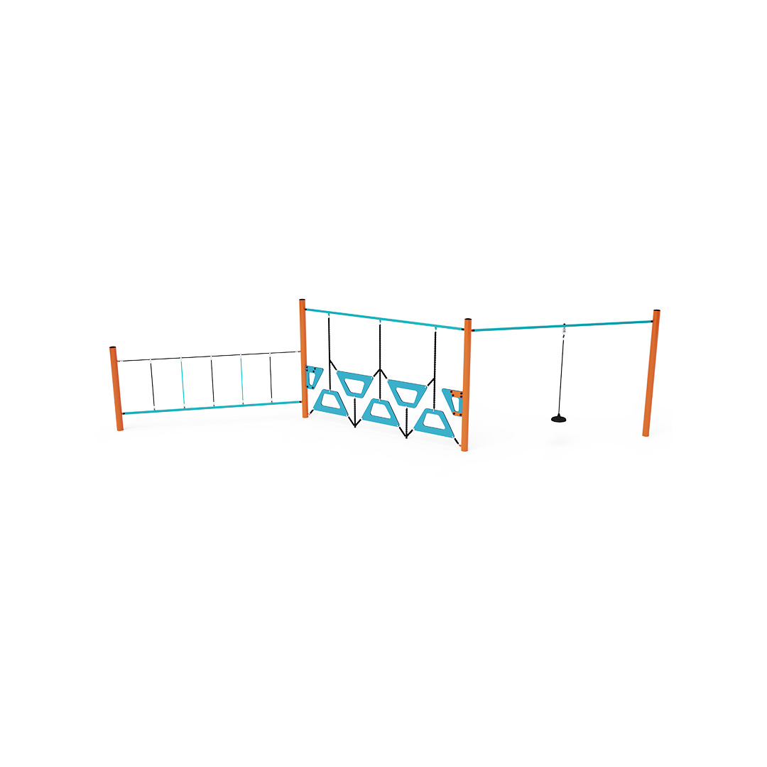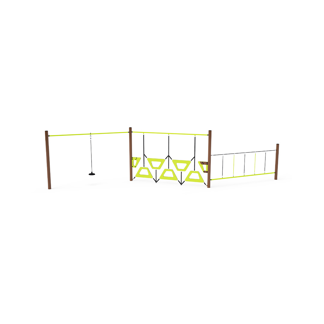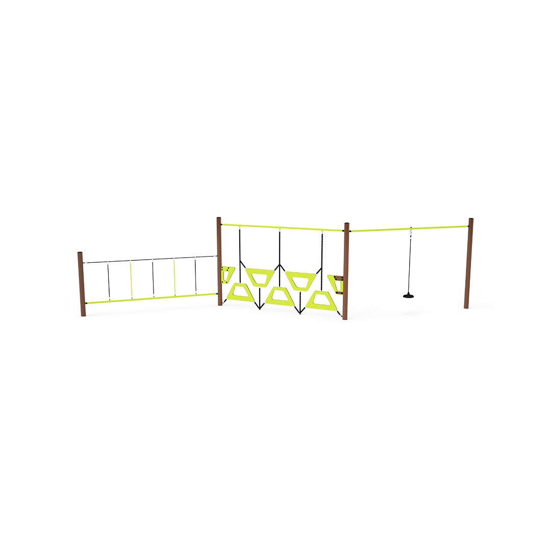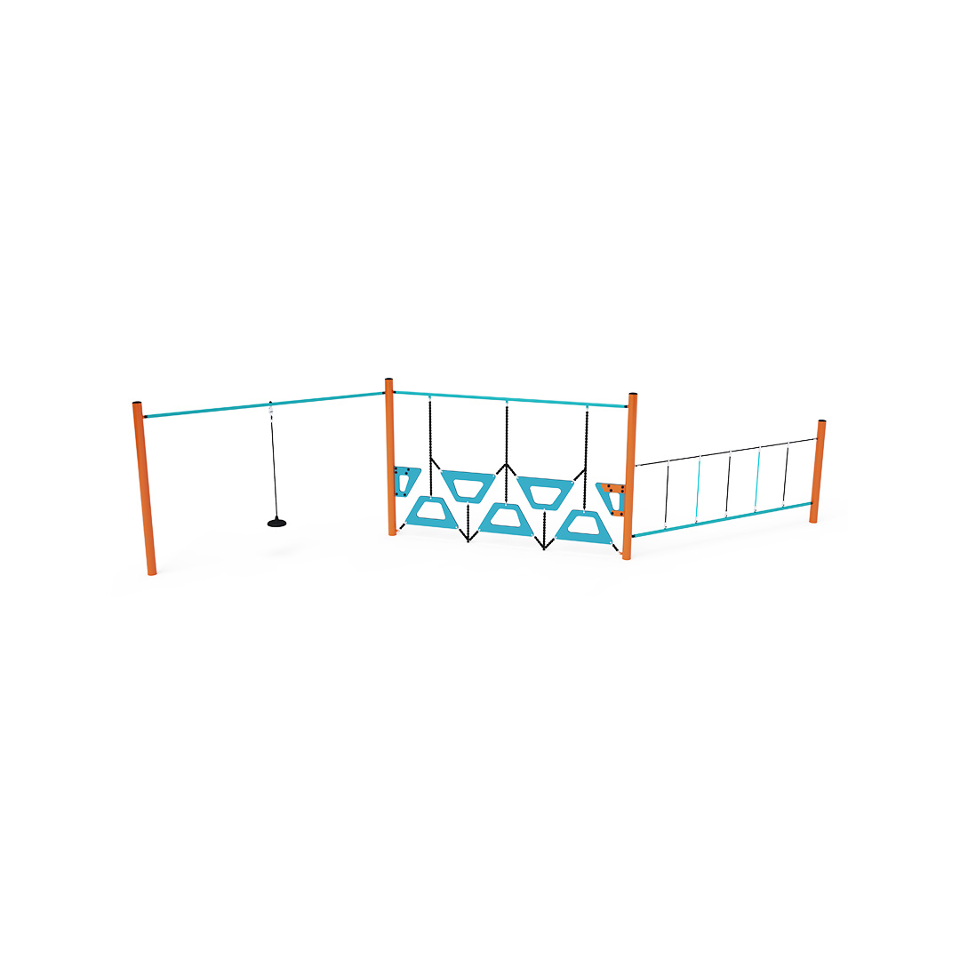Ein Affenparcours, der aus drei Teilen besteht. Der erste Teil ist ein hängendes Seil – ein einfaches, aber vielseitiges Element. Der zweite Teil besteht aus frei nebeneinander hängenden Fußstützen. Der dritte Teil dient zum Ziehen an den Seiten. Obwohl das Kind auf einer stabilen Stange steht, muss es sich am Seil festhalten, das nicht mehr so stark ist. Dieses Spielelement zu überwinden, macht nicht nur Spaß, sondern erfordert auch Kraft. Das Spielelement ist aus feuerverzinktem Stahl mit einer hochwertigen Oberflächenveredelung gefertigt. Die Verbindungen bestehen aus Edelstahl und sind mit Kunststoffkappen versehen, um die Sicherheit und Haltbarkeit zu erhöhen. Die Seile bestehen aus Polyesterfasern, die um den Kern gewickelt sind. Diese Konstruktion erhöht die Festigkeit und Widerstandsfähigkeit des Seils gegen mechanische Belastung.