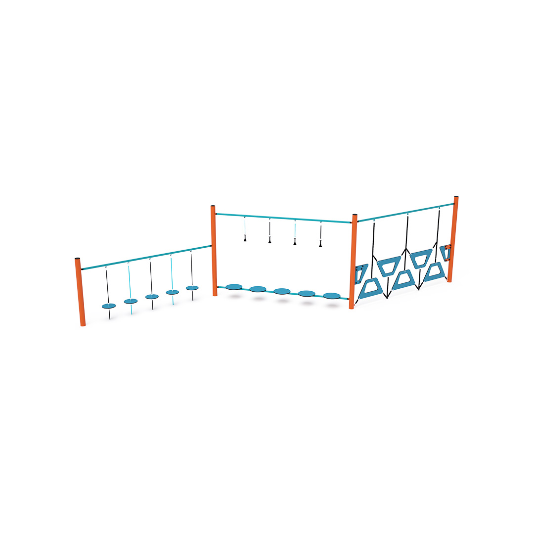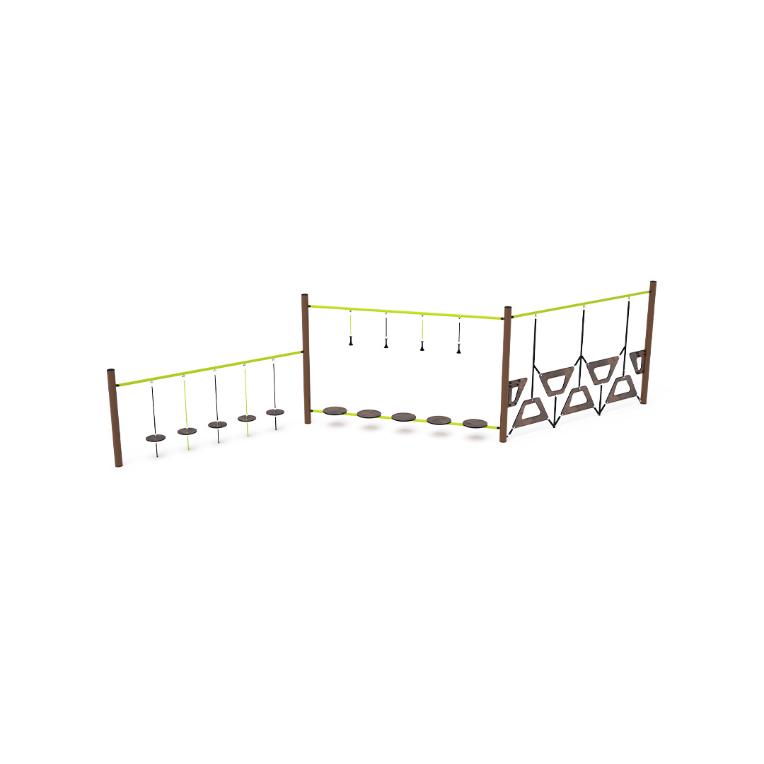 Ein Affenparcours, bestehend aus drei Elementen: einer trapezförmigen Wand, Balancierstufen mit frei hängenden Griffen und Balancierscheiben. Von einem frei hängenden Stein zum nächsten zu gelangen, ist alles andere als einfach. Die Bewältigung dieses Spielelements ist nicht nur unterhaltsam, sondern auch anstrengend. Das Spielelement ist aus verzinktem Stahl mit einer hochwertigen Pulverbeschichtung gefertigt. Die Verbindungsstücke bestehen aus Edelstahl und sind mit Kunststoffkappen versehen, um die Sicherheit und Langlebigkeit zu erhöhen. Die Seile bestehen aus Polyesterfasern mit einem Stahlkern, der um die Mitte gewickelt ist. Diese Konstruktion erhöht die Festigkeit und Widerstandsfähigkeit der Seile gegen mechanische Belastung. Polyester selbst besitzt viele positive Eigenschaften. Es ist resistent gegen Mikroorganismen und Witterungseinflüsse, trocknet schnell nach Regen, ist farbecht und zeichnet sich durch hohe Festigkeit aus.