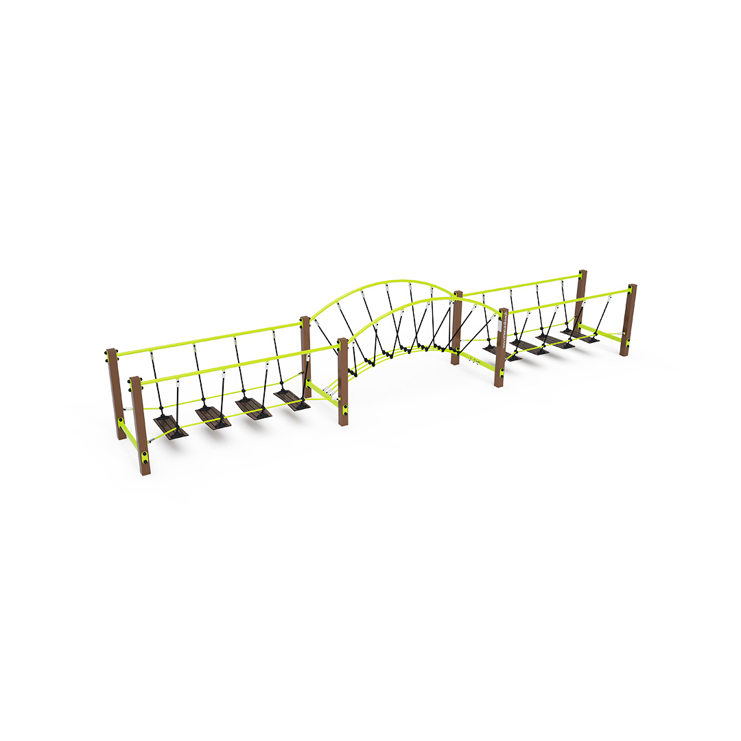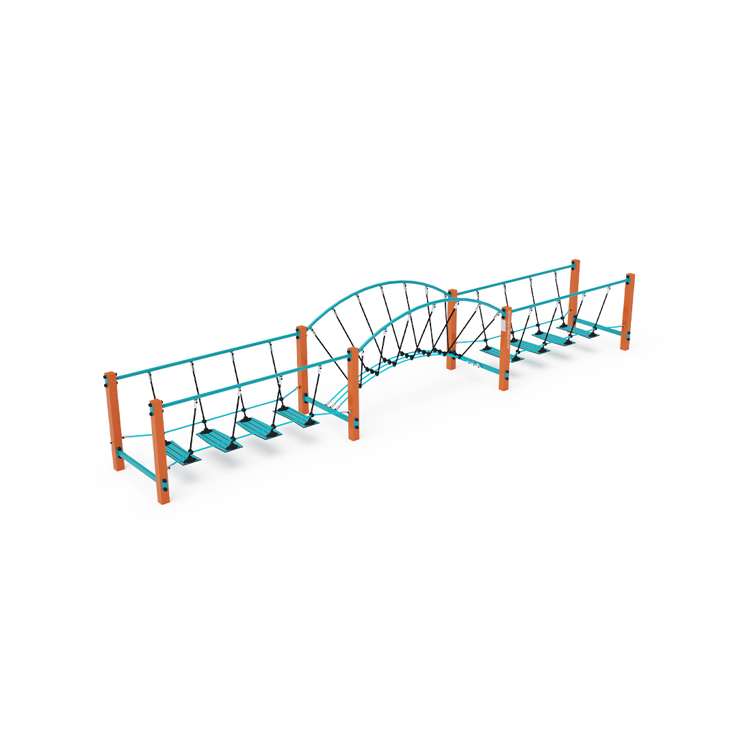 Die wartungsfreie Kombinations-Balancebrücke mit rutschfesten HPL-Trittflächen, die an Polyesterseilen hängen, ist ein Spielgerät, mit dem Kinder ihre Koordination, Stabilität und ihr Gleichgewicht trainieren können. Sie besteht aus feuerverzinktem Stahl mit Pulverbeschichtung. Die Seile sind aus Polyesterfasern gefertigt, die um den Kern gewickelt sind. Diese Seilkonstruktion erhöht die Festigkeit und Widerstandsfähigkeit gegen mechanische Belastungen. Polyester selbst besitzt viele positive Eigenschaften: Es ist resistent gegen Mikroorganismen und Witterungseinflüsse, trocknet schnell nach Regen, ist farbecht und zeichnet sich durch hohe Festigkeit aus. Die Verbindungselemente sind aus Edelstahl. Eine Rasenfläche kann als Landefläche genutzt werden, wir empfehlen jedoch die Verwendung einer Rasenmatte.