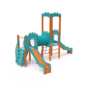 Im Zentrum des Spielplatzes befindet sich ein Spielturm mit zwei Türmen, die durch einen Tunnel verbunden sind und Kindern viel Platz zum Erkunden und Toben bieten. Ergänzt wird das Angebot durch Hängeschaukeln für klassischen Spaß und Balancierschaukeln, die die Interaktion der Kinder fördern. Für Kletterbegeisterte gibt es eine Kletteranlage aus Stahl, die Motorik, Kraft und Mut trainiert.