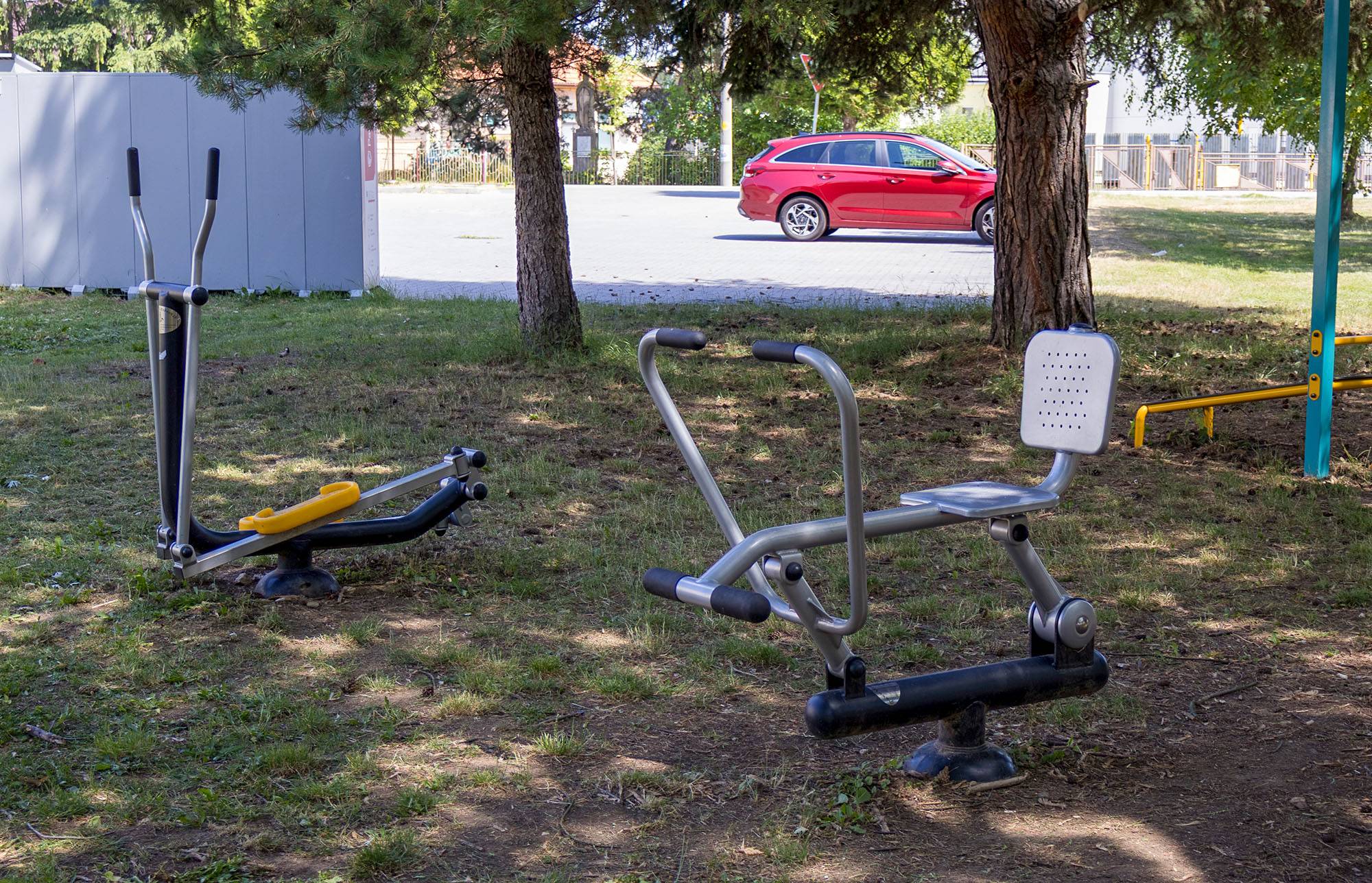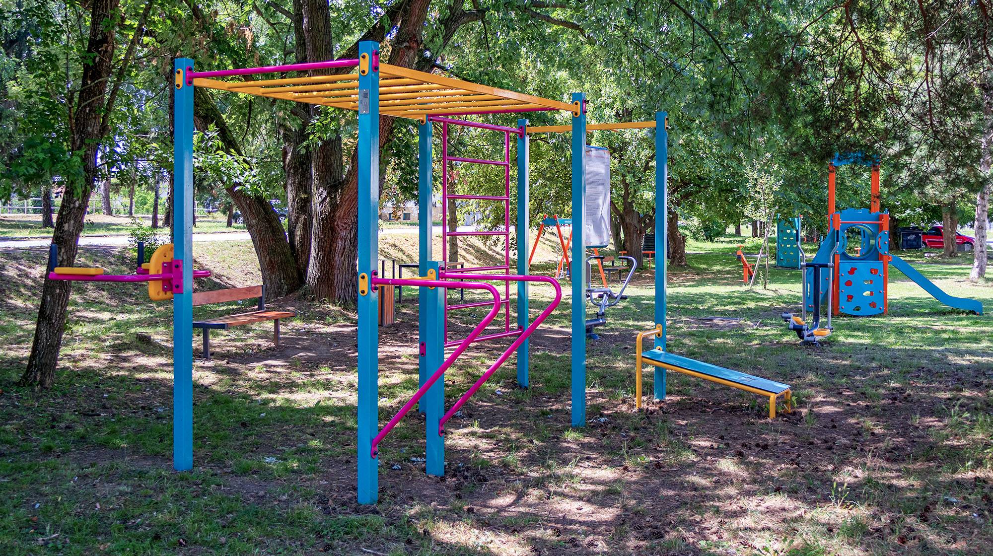 Neben den Spielgeräten für Kinder bietet der Spielplatz auch einen Street-Workout-Bereich für junge und erwachsene Besucher. Ergänzt wird dieser durch zwei Outdoor-Fitnessgeräte – einen Ellipsentrainer und ein Rudergerät –, die für leichte Bewegung oder ein kurzes Workout sorgen.