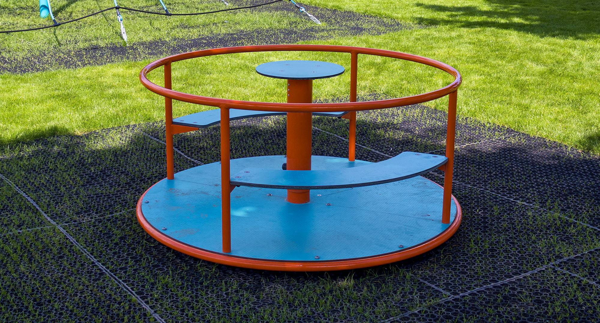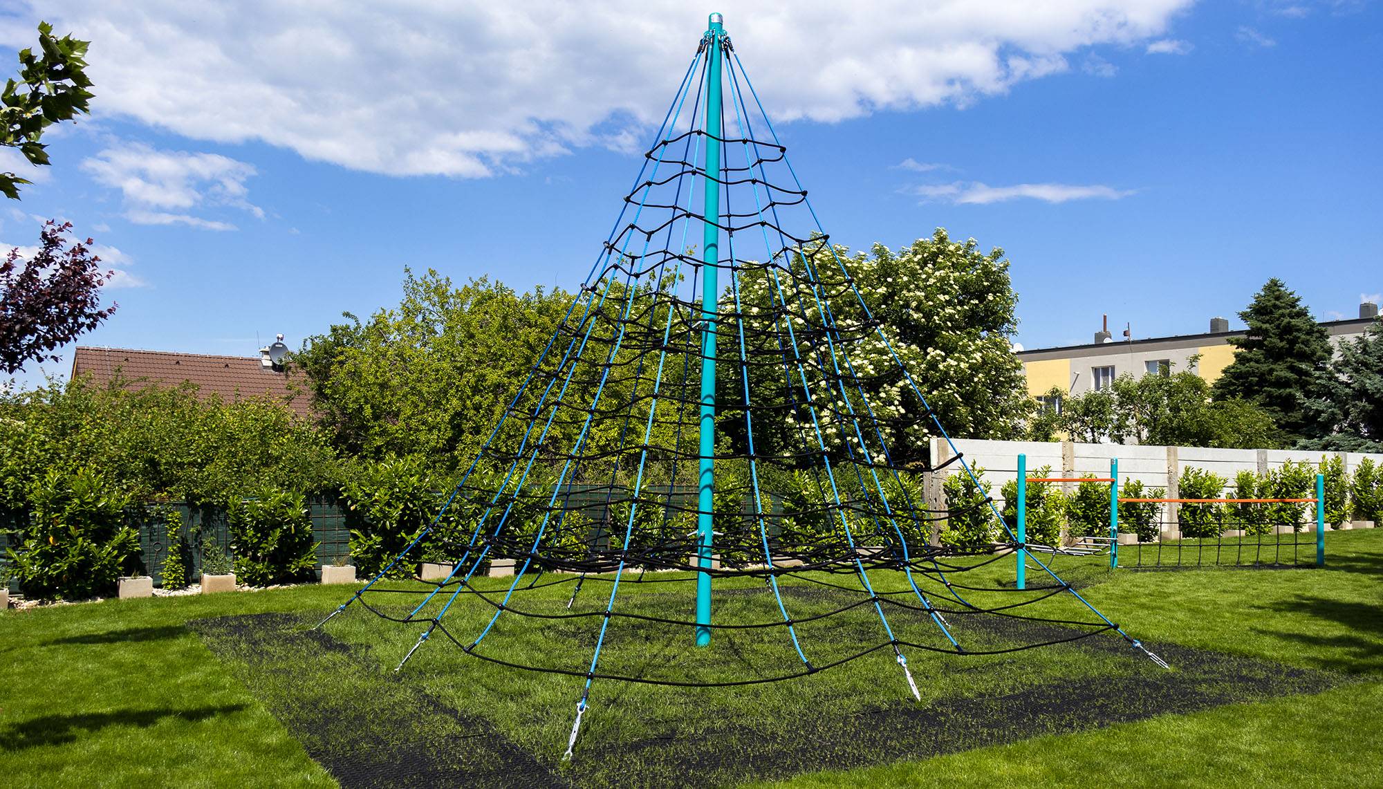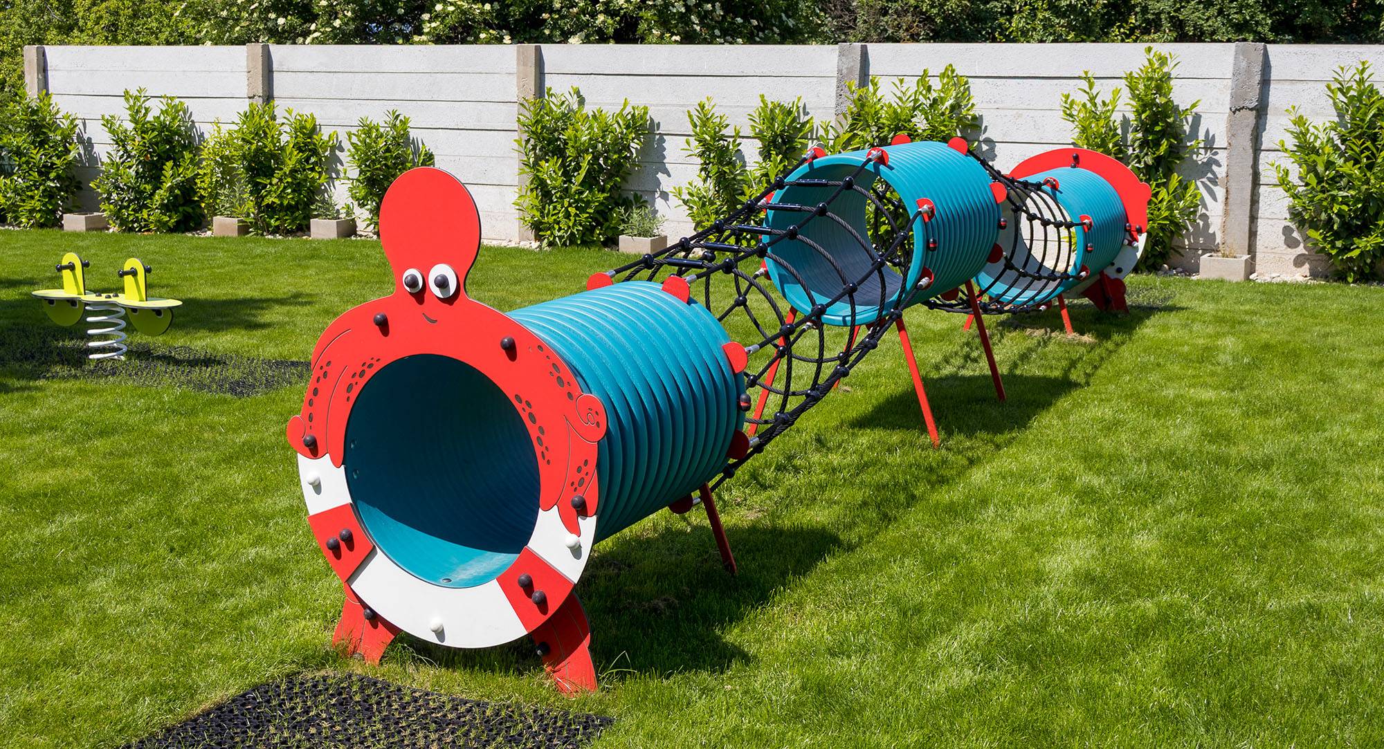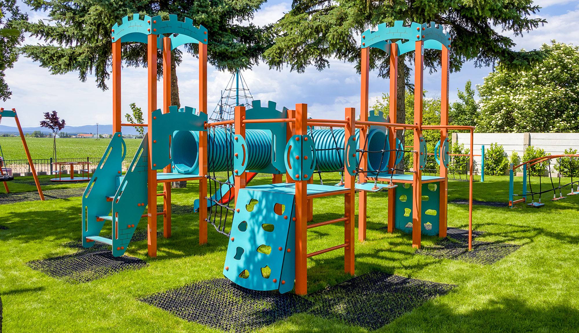 Der Spielplatz selbst ist mit verschiedenen Spielgeräten für Kinder unterschiedlichen Alters ausgestattet. Es gibt eine Seilpyramide, einen Affenparcours, ein Lernhaus, eine Hängeschaukel, ein Karussell, einen Tunnel, Balancierschaukeln, eine Balancierbrücke, einen imposanten Vier-Turm-Bausatz und ein Lernspielfeld – Schere, Stein, Papier. Diese Spielelemente sind farbenfroh, optisch ansprechend und aus hochwertigen, zertifizierten Materialien gefertigt.