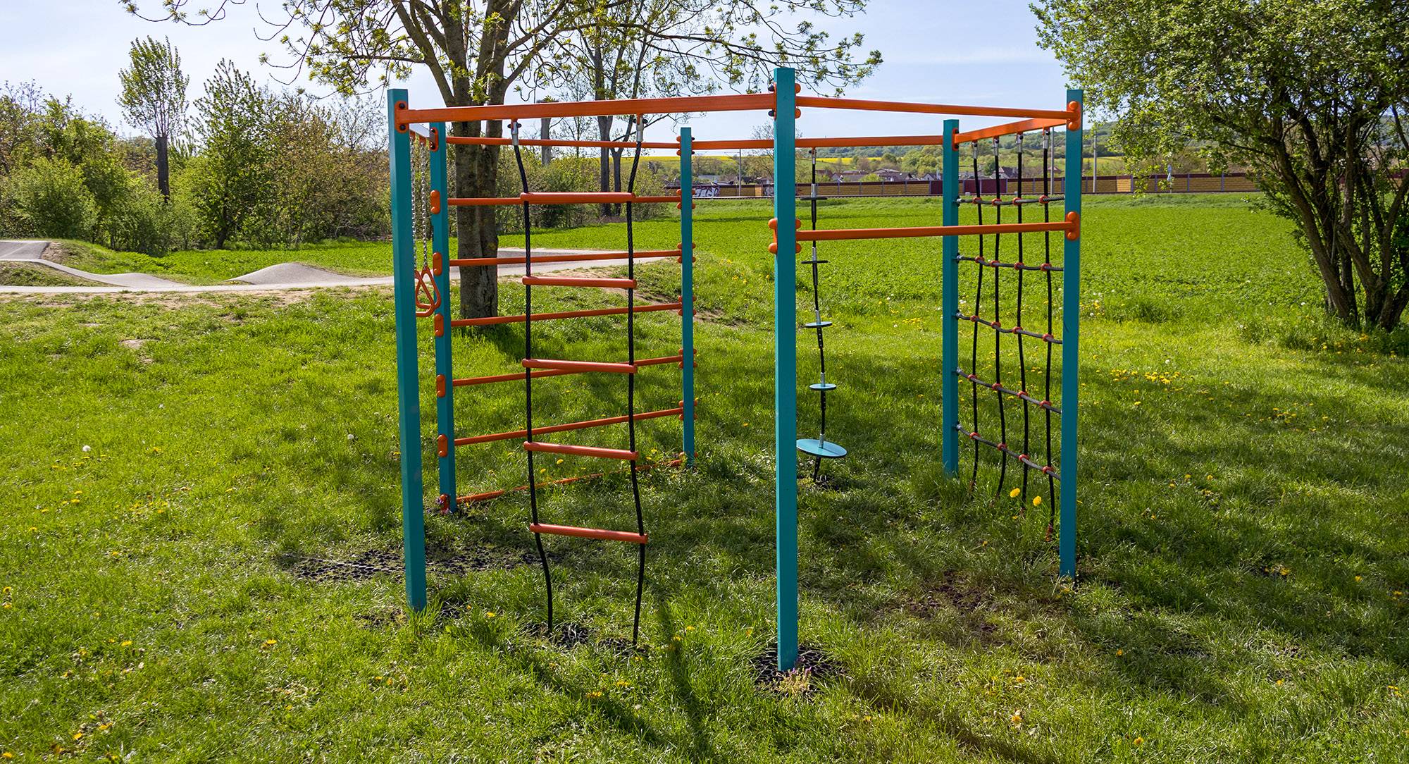Eine solche Anlage, bestehend aus einer langen Stange, Turnringen, einem Seil mit Balancierplatten, einem Kletternetz, einer Leiter und einem Doppeltrapez, ist besonders beliebt auf öffentlichen Spielplätzen und Schulgeländen, wo Kinder aktiv Zeit im Freien verbringen können.