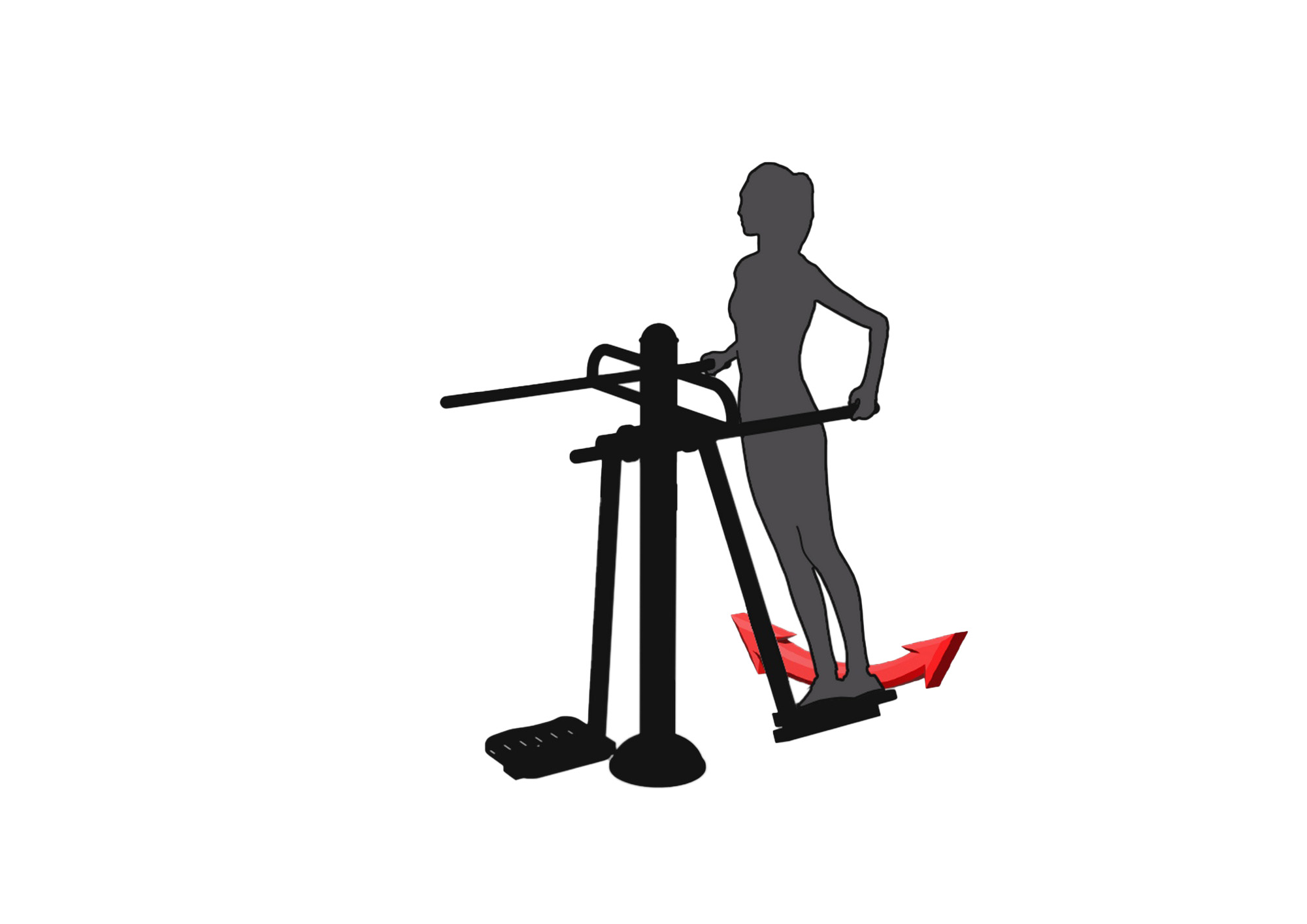 So geht's: Fassen Sie die Griffe und stützen Sie sich ab, während Sie Ihren Oberkörper ruhig halten. Stellen Sie beide Füße auf die Pendelplattform. Schwingen Sie Ihre Hüfte sanft von einer Seite zur anderen, während Ihr Oberkörper still bleibt. Schwingen Sie nur so weit, wie es sich für Sie angenehm anfühlt. Führen Sie die Bewegungen langsam und kontrolliert aus. Steigern Sie die Anzahl der Wiederholungen schrittweise, sobald sich Ihre Fitness verbessert.