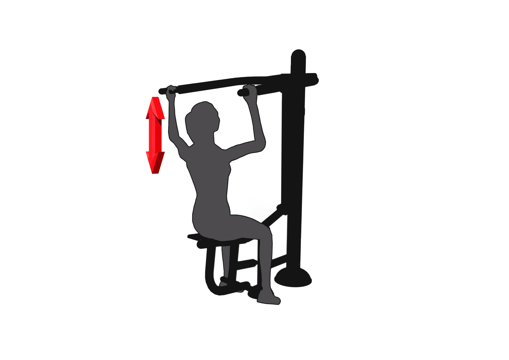 Ako cvičiť - sadnite si na sedák s vystretým chrbtom a tvár nasmerujte k zariadeniu. Pevne uchopte obe rukoväte. Pomaly ťahajte rukoväte dole, až kým ruky nebudete mať na úrovni hrudníka. Rukoväte pomaly vráťte do pôvodnej polohy. Nádych vykonajte pri pohybe rúk nadol, výdych pri pohybe nahor. Vykonávajte plynulé a kontrolované pohyby. Počet opakovaní postupne zvyšujte podľa zlepšovania kondície.