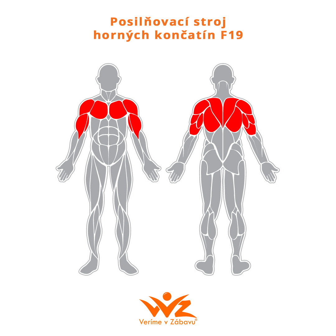 F19 Posilňovací stroj horných končatín - slúži na precvičenie, spevnenie a nárast svalovej hmoty hornej časti tela: svaly chrbta, ramien, pŕs a horných končatín.