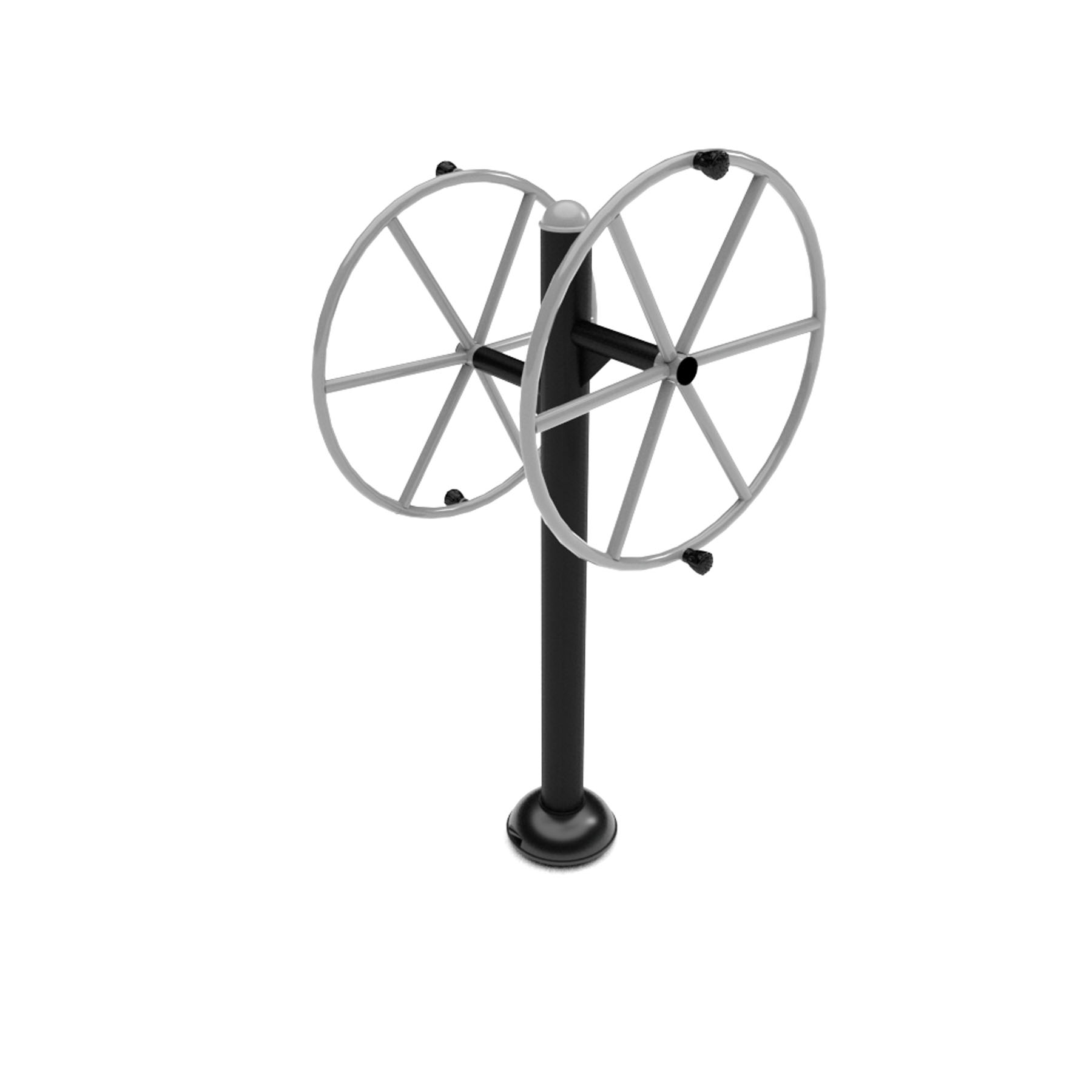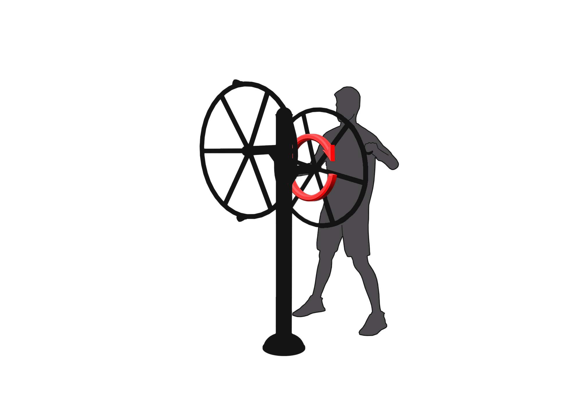 So geht die Übung: Stellen Sie sich mit dem Gesicht zum Rad und dem Körper zum Gerät. Greifen Sie beide Griffe mit beiden Händen. Drehen Sie die Räder gleichzeitig im oder gegen den Uhrzeigersinn. Um die Übung effektiver zu gestalten, wechseln Sie die Drehrichtung. Führen Sie die Bewegungen fließend und kontrolliert aus. Steigern Sie die Anzahl der Wiederholungen schrittweise, sobald sich Ihre Fitness verbessert.