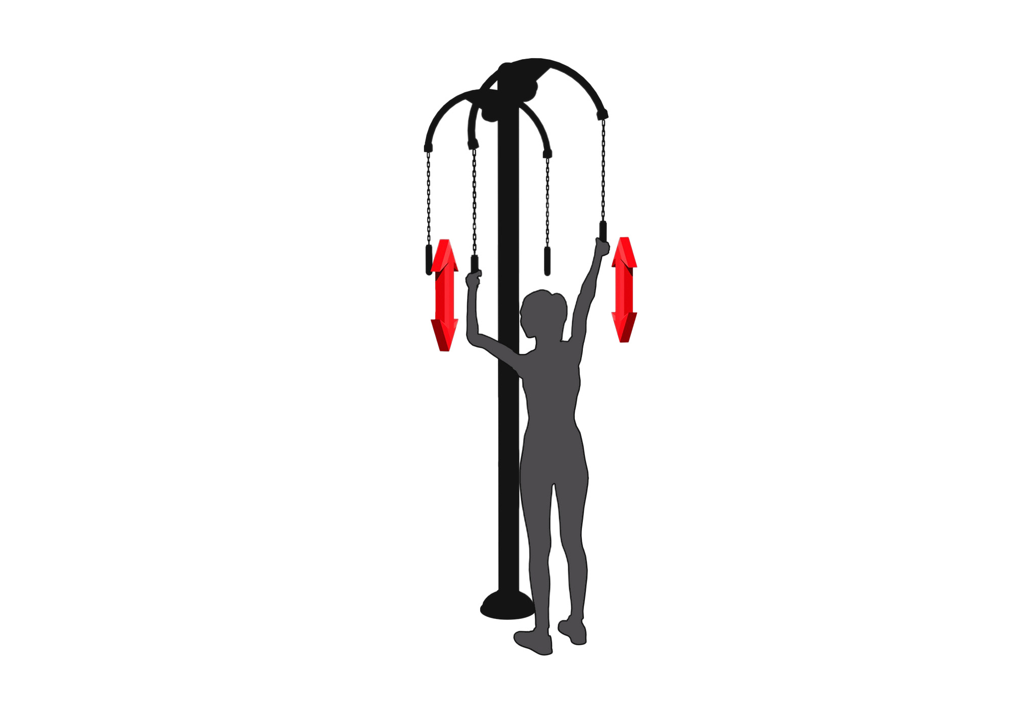 <p><span style="color: #f37221;"><strong>So führen Sie die Übung durch<span style="color: #000000;"> -</span></strong></span>Stellen Sie sich schulterbreit hin, sodass Ihre Brust mittig zwischen den beiden Griffen ist, und greifen Sie diese. Ziehen Sie das Gerät abwechselnd in verschiedene Richtungen, immer mit einer Hand. Führen Sie die Bewegungen fließend und kontrolliert aus. Steigern Sie die Anzahl der Wiederholungen, sobald sich Ihre Fitness verbessert.</p>