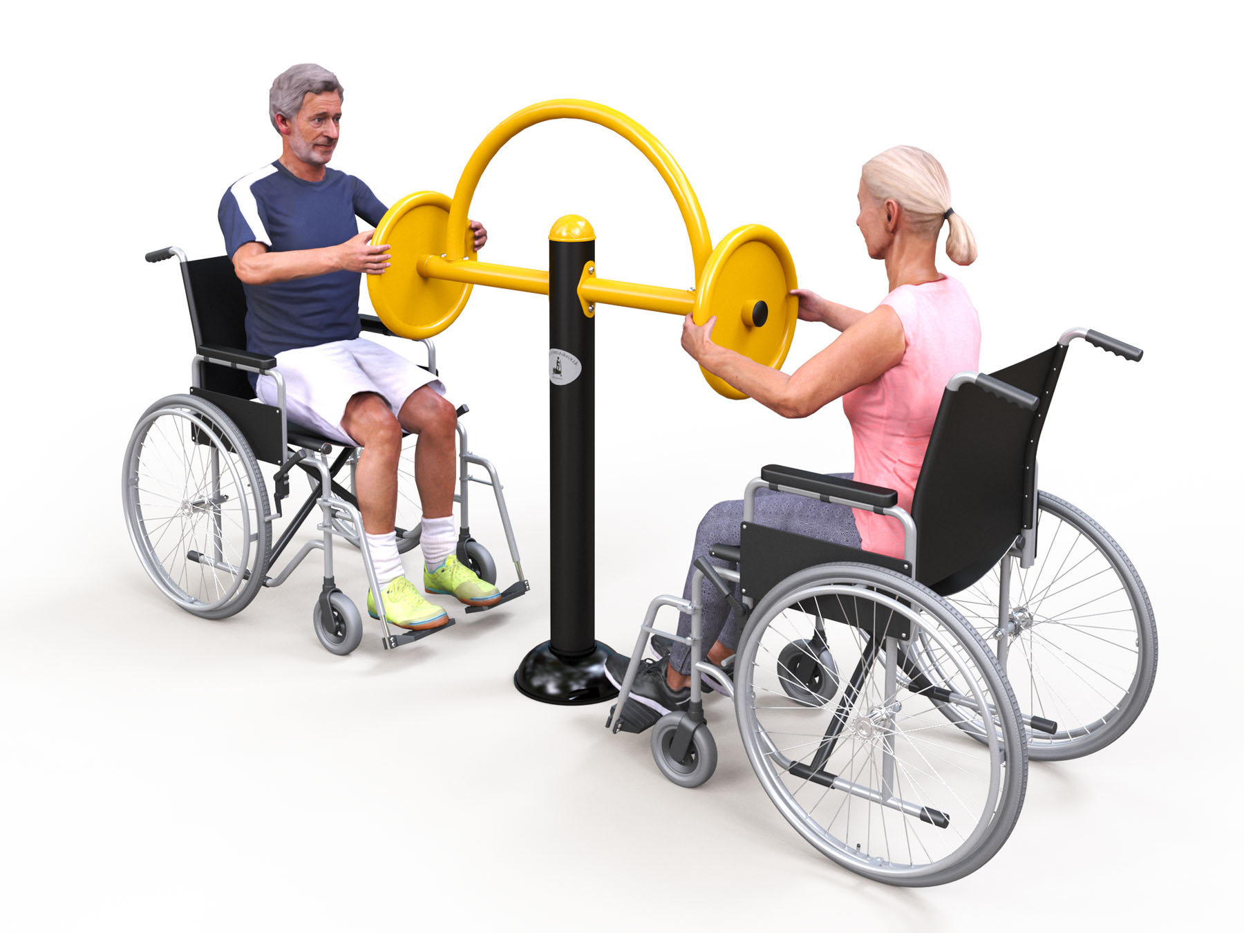 HF01 Outdoor-Fitnessgerät für Menschen mit Behinderung – dient dem Training der Muskeln und Gelenke der oberen Extremitäten von den Schultern über die Ellbogen bis zum Handgelenk. Die Mindestfläche für die Aufstellung des Geräts beträgt 4100 x 3400 mm.