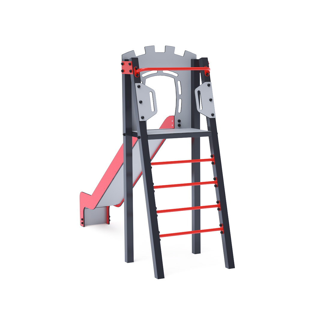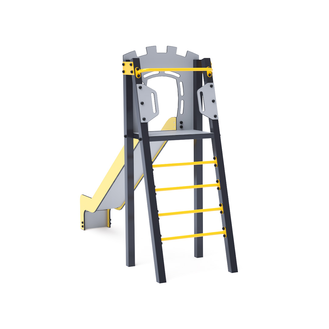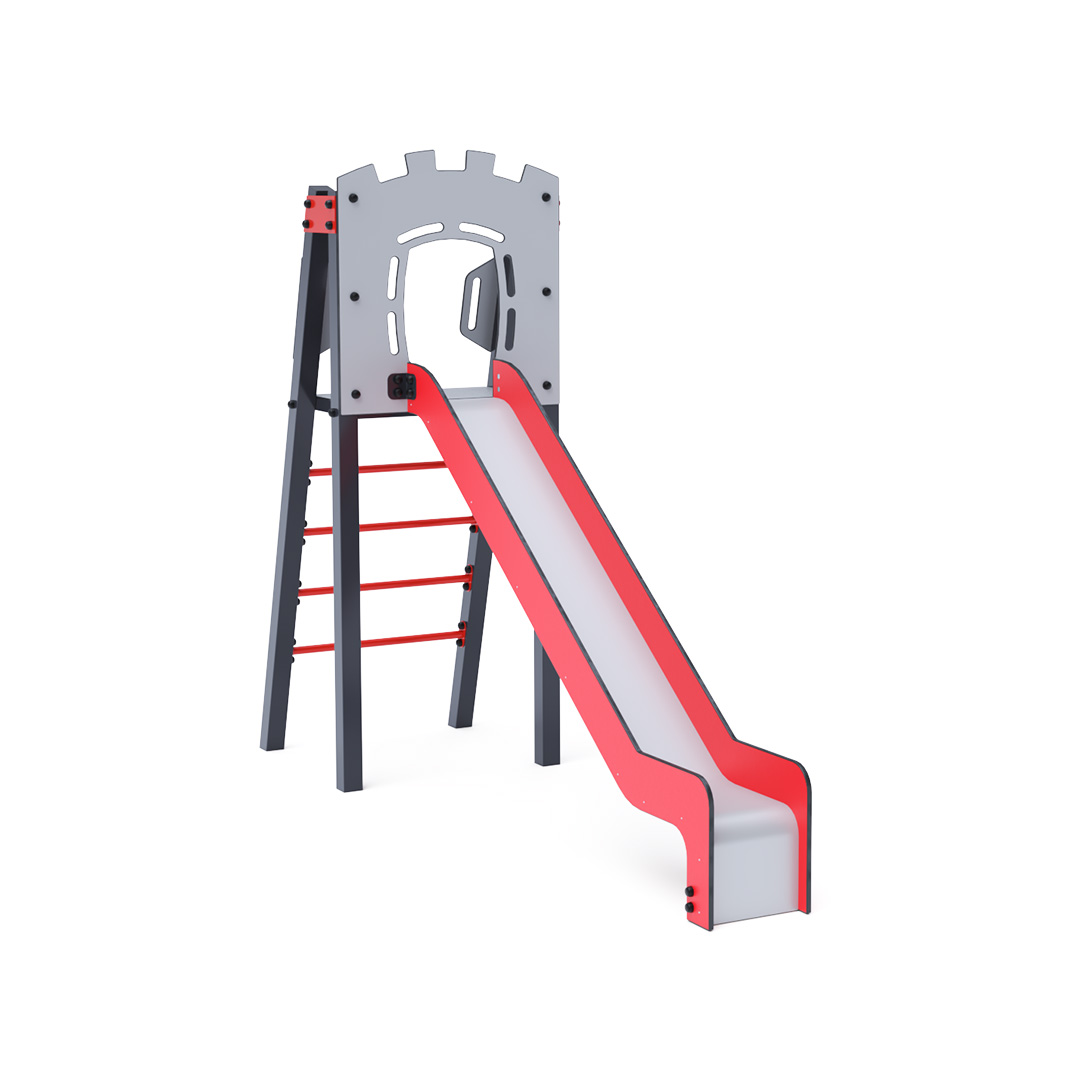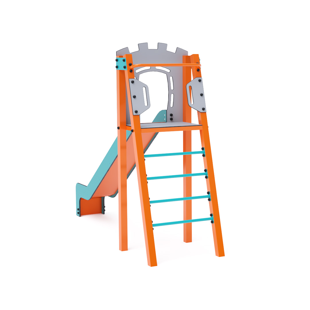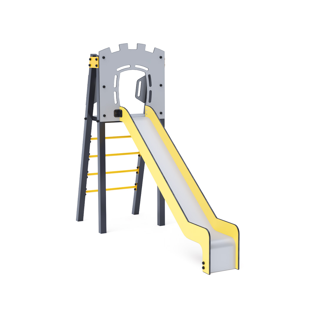 Zertifizierter, wartungsfreier A-förmiger Turm mit geriffeltem Ausgang und Rutsche. Ein Basisset, das auch auf kleinem Raum Platz findet und dennoch ein vollwertiges Spielgerät bietet.