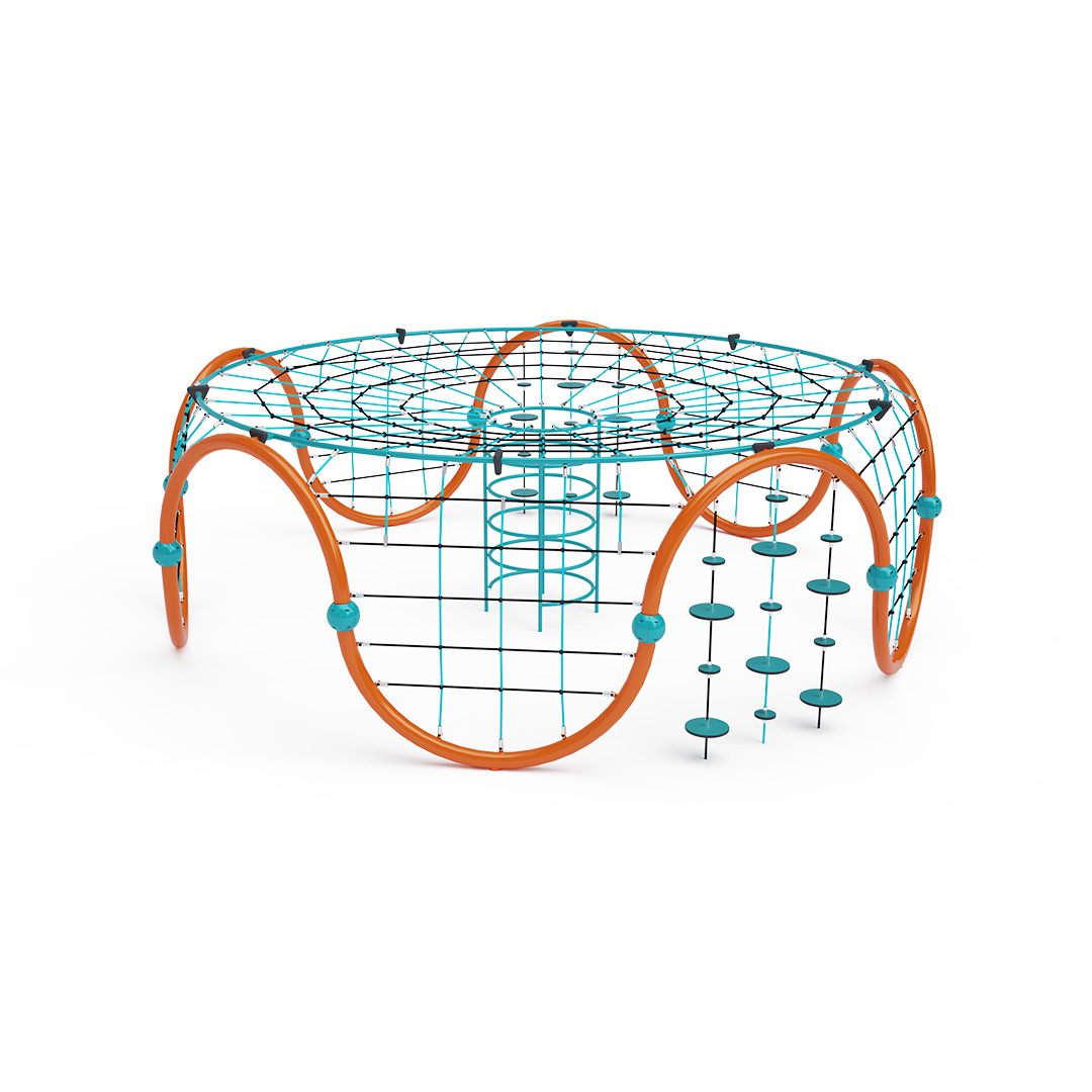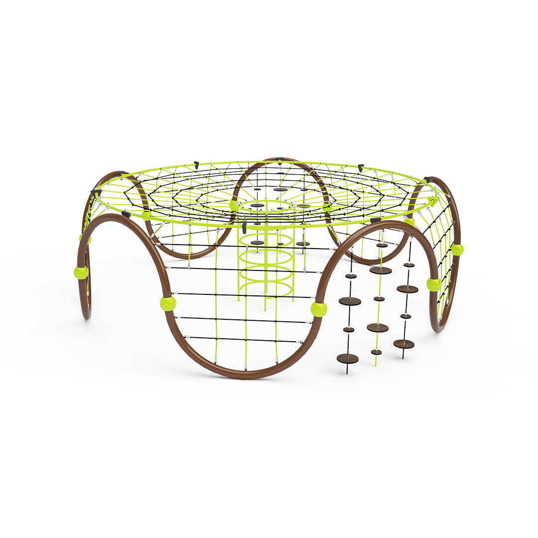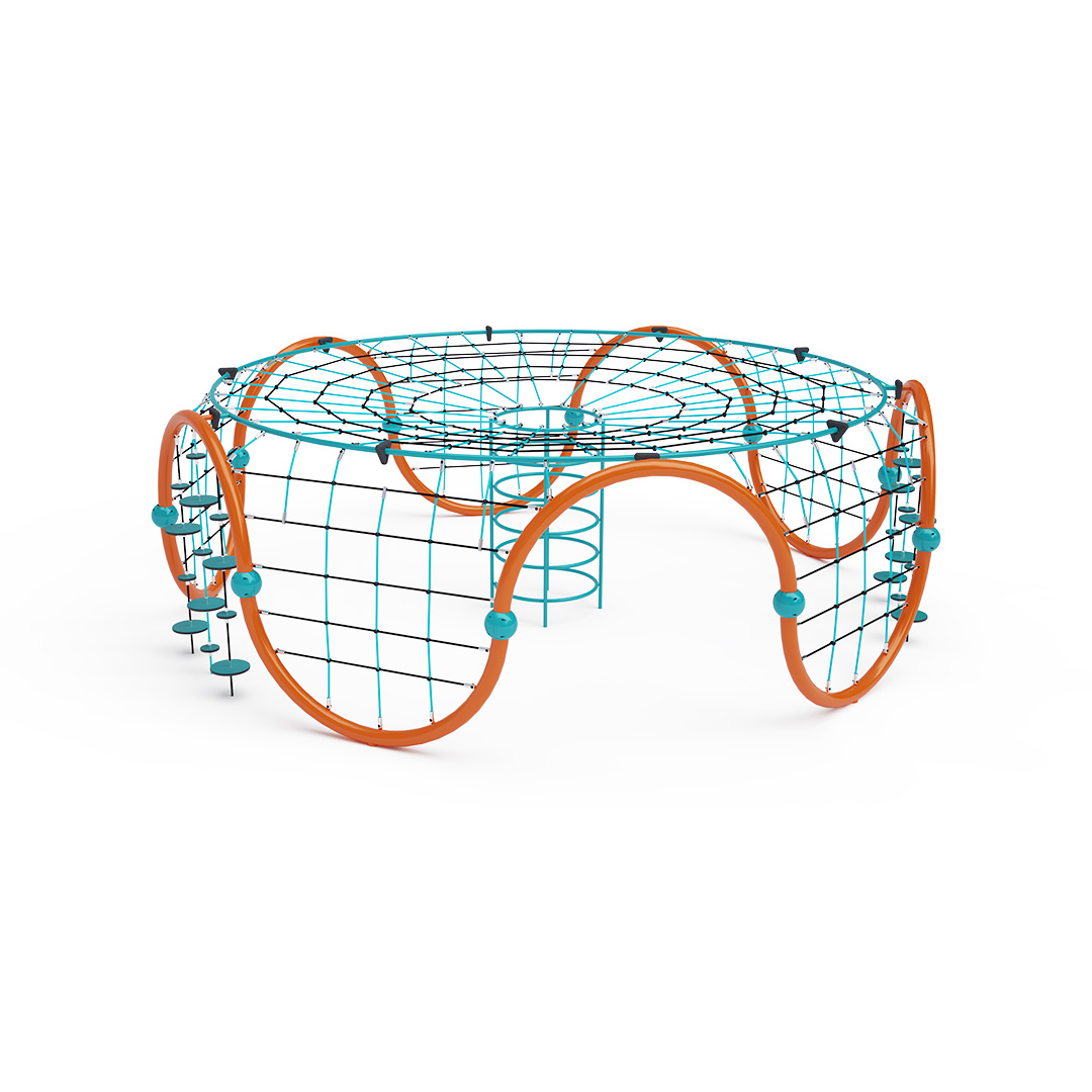 Ein großes Seil-Iglu mit fünf Kletternetzen und einem großen zentralen Tunnel wird durch zwei Sets hängender Balanciersteine ergänzt. Das Spielgerät besteht aus verzinktem Stahl mit einer hochwertigen Pulverbeschichtung. Die Verbindungen sind aus Edelstahl und mit Kunststoffkappen versehen, um die Sicherheit und Langlebigkeit zu erhöhen. Die Seile bestehen aus Polyesterfasern mit einem Stahlkern, der um den Kern gewickelt ist. Diese Konstruktion erhöht die Festigkeit und Widerstandsfähigkeit gegen mechanische Belastung. Polyester selbst besitzt viele positive Eigenschaften: Es ist resistent gegen Mikroorganismen und Witterungseinflüsse, trocknet schnell nach Regen, ist farbecht und zeichnet sich durch hohe Festigkeit aus.
