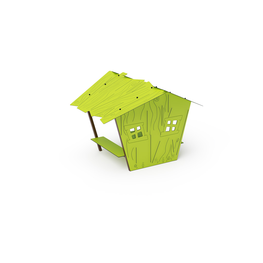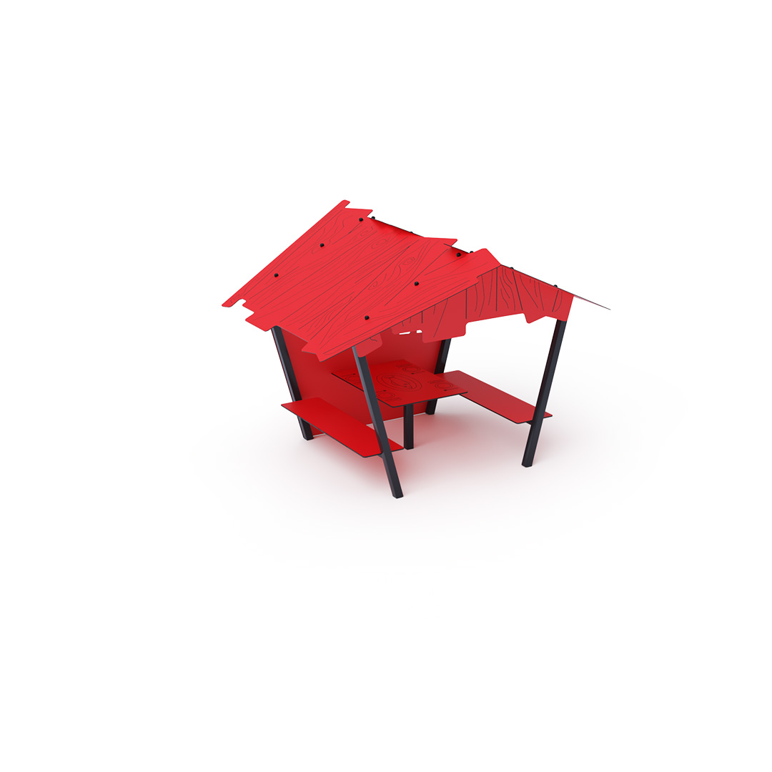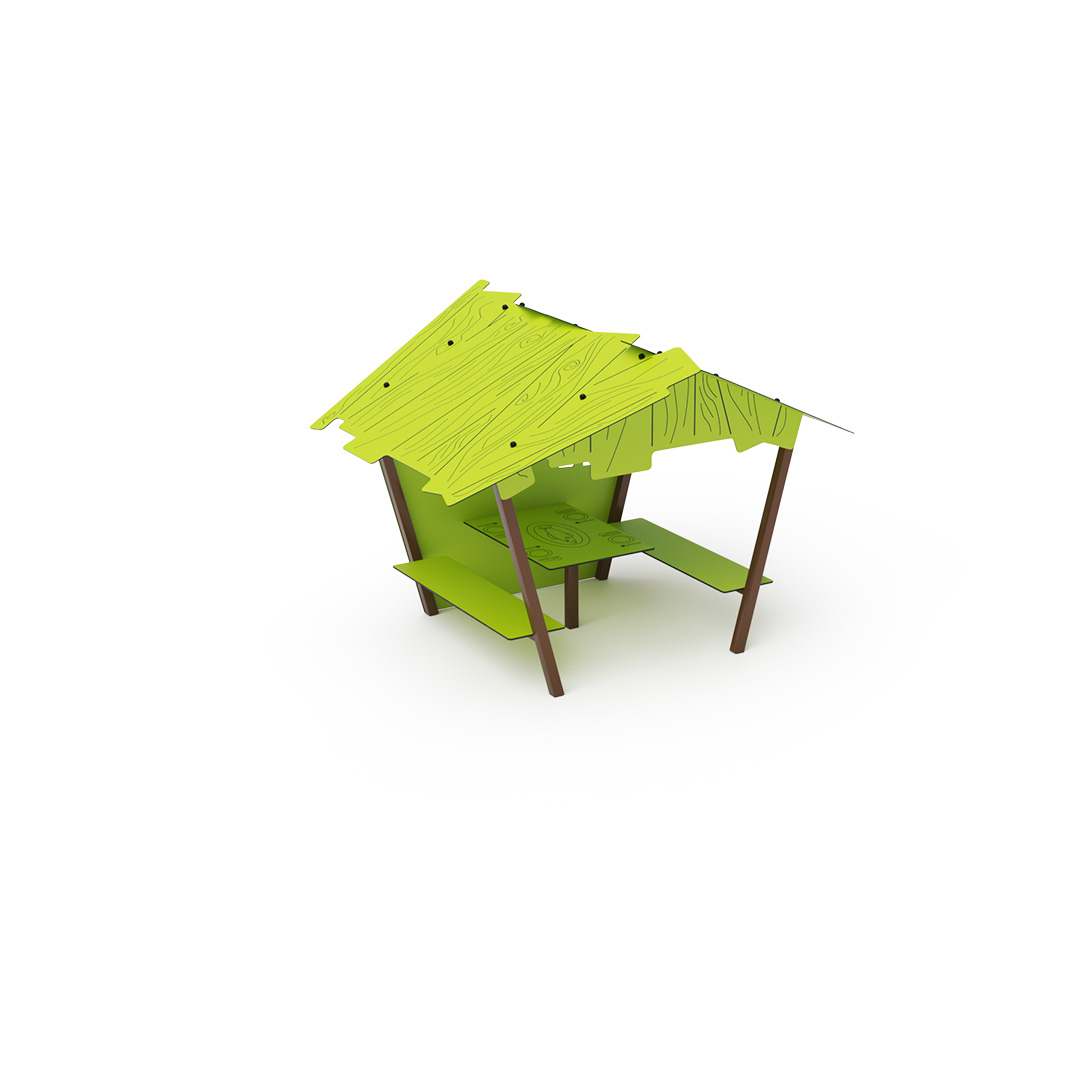 mit einem A-förmigen Dach in Holzoptik verbirgt zwei Sitzbänke, einen Tisch mit einem Essmotiv, an dem Kinder die Grundlagen des Essens lernen, und eine Rückwand mit einem Holzhausmotiv. Die Hauskonstruktion besteht aus verzinktem und pulverbeschichtetem Stahl. Alle Platten sind aus UV-beständigem HPL-Material gefertigt, das farbecht, ungiftig und bruchfest ist. Alle Verbindungen sind aus Edelstahl und mit Kunststoffkappen abgedeckt.