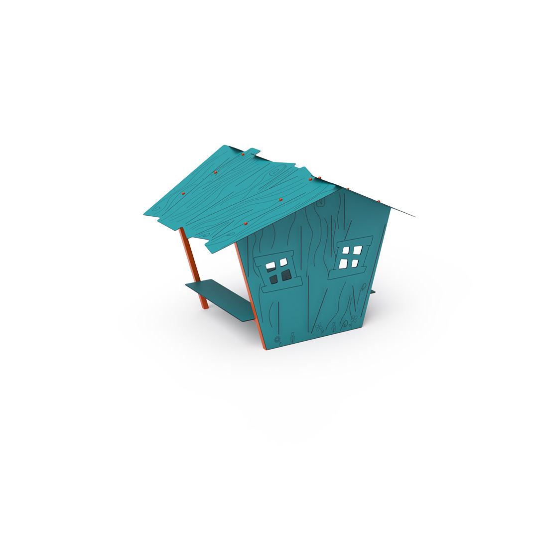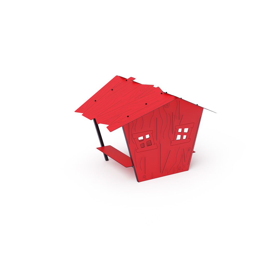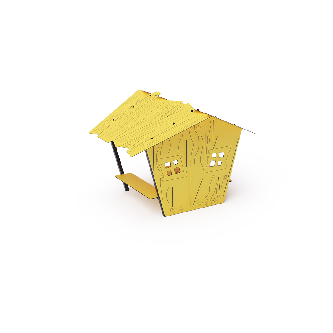 mit einem A-förmigen Dach in Holzoptik verbirgt zwei Sitzbänke, einen Tisch mit einem Essmotiv, an dem Kinder die Grundlagen des Essens lernen, und eine Rückwand mit einem Holzhausmotiv. Die Hauskonstruktion besteht aus verzinktem und pulverbeschichtetem Stahl. Alle Platten sind aus UV-beständigem HPL-Material gefertigt, das farbecht, ungiftig und bruchfest ist. Alle Verbindungen sind aus Edelstahl und mit Kunststoffkappen abgedeckt.