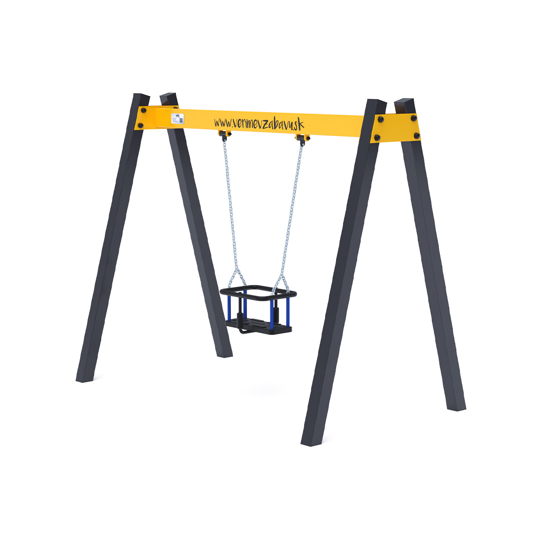 Die Hängeschaukel mit Babysitz für ein Kind ist aus feuerverzinktem Stahl gefertigt und pulverbeschichtet. Die Verbindungsstücke bestehen aus Edelstahl und sind mit Kunststoffkappen versehen, um Langlebigkeit und Sicherheit zu erhöhen. Als Landefläche wird eine Kunstrasenmatte empfohlen.