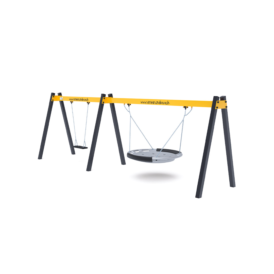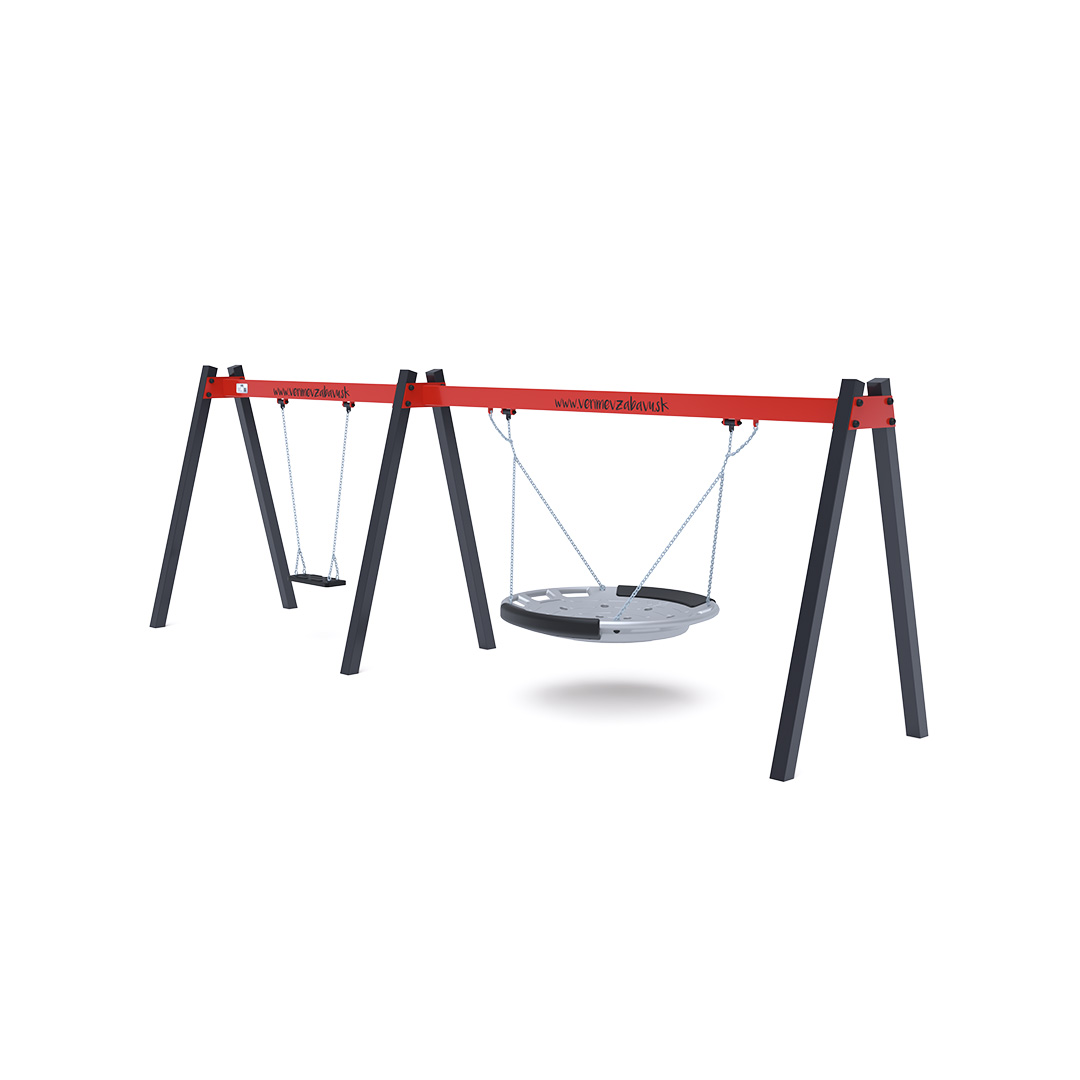 Hängeschaukel mit klassischem Sitz/Babysitz und Nestchen. Sie ist aus feuerverzinktem Stahl gefertigt und pulverbeschichtet. Die Verbindungsstücke bestehen aus Edelstahl und sind mit Kunststoffkappen versehen, um Langlebigkeit und Sicherheit zu erhöhen. Als Landefläche kann eine Grasmatte verwendet werden.