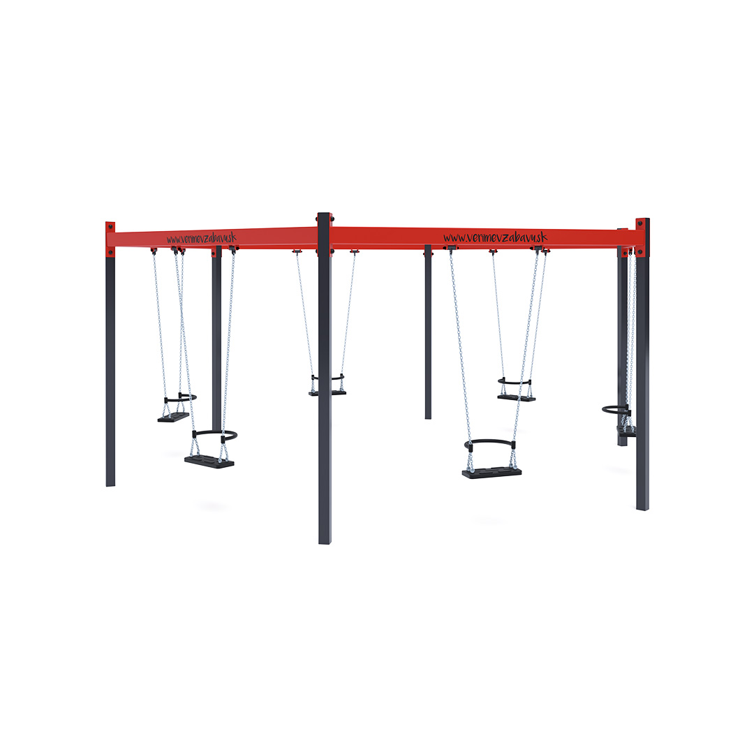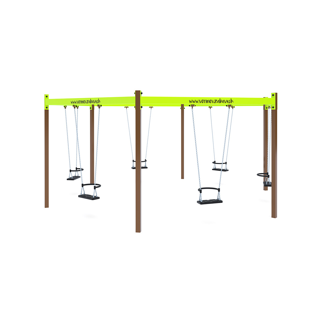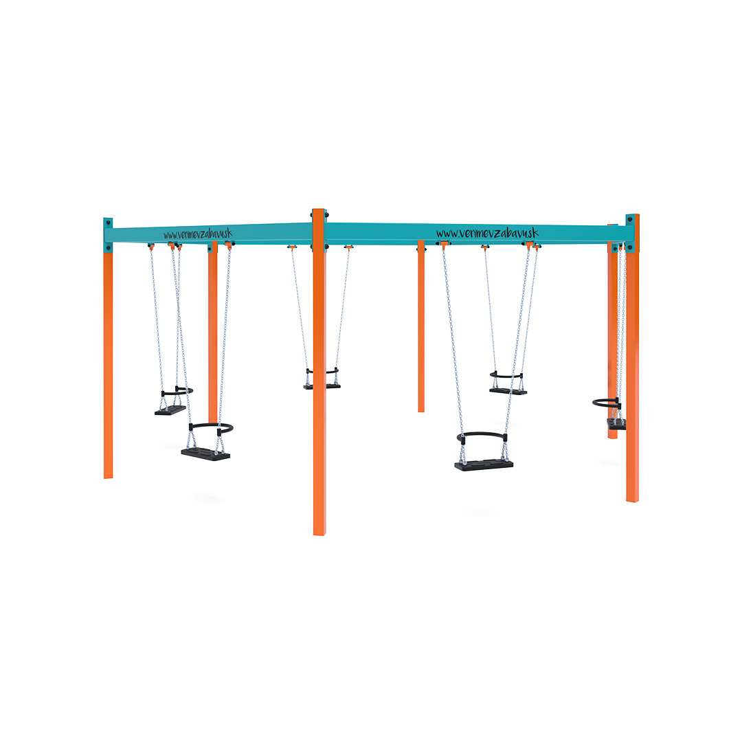 Eine Schaukelanlage in Sechseckform mit sechs hängenden Kettenschaukeln. Sie ist aus feuerverzinktem Stahl gefertigt und pulverbeschichtet. Die Verbindungsstücke bestehen aus Edelstahl und sind mit Kunststoffkappen versehen, um Langlebigkeit und Sicherheit zu erhöhen.