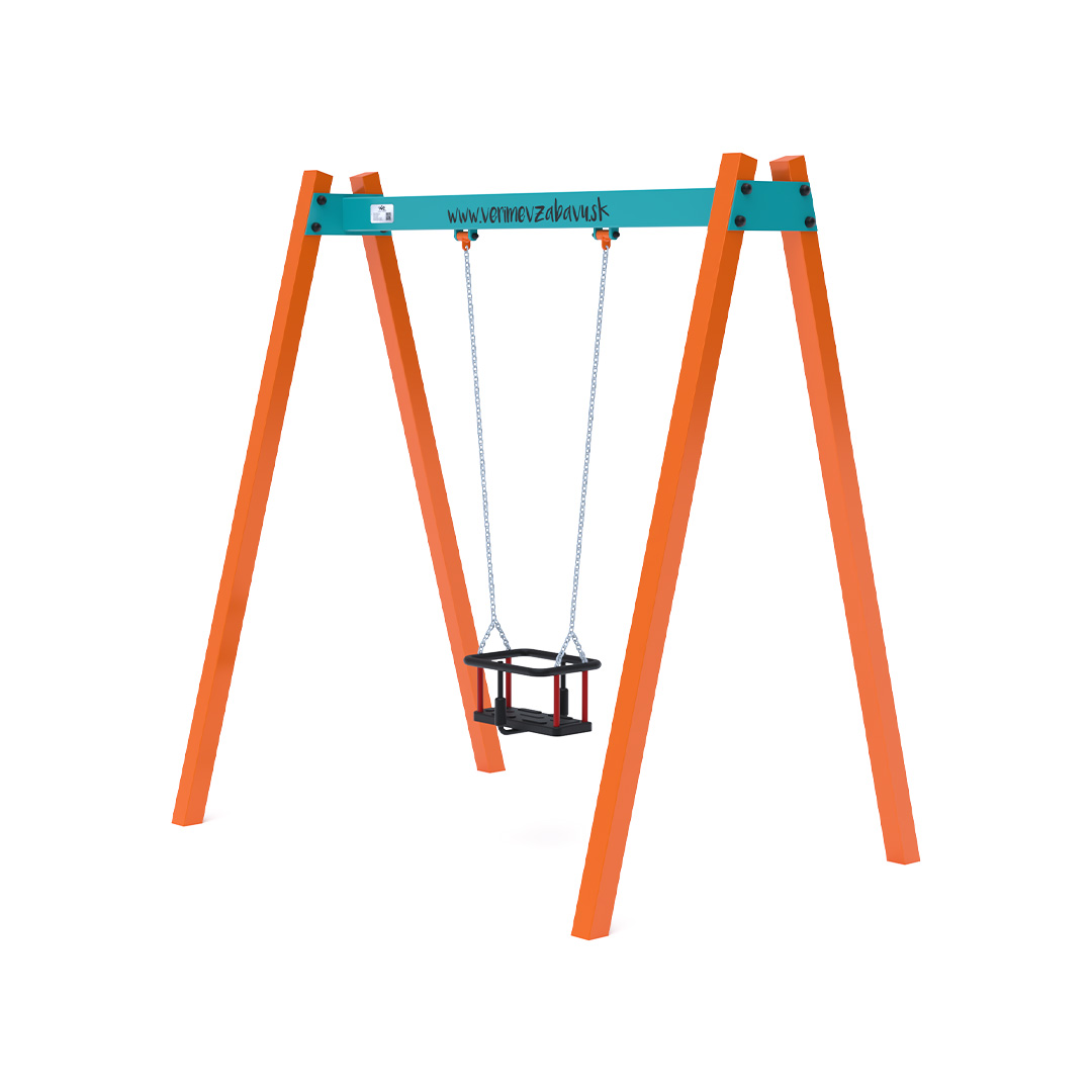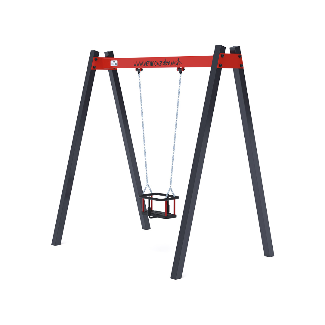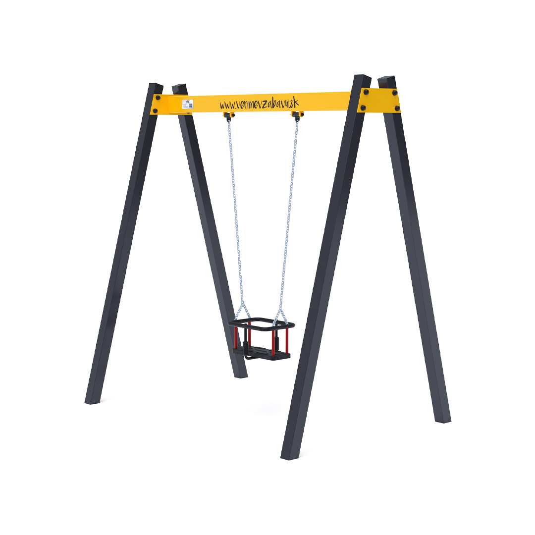 Hängeschaukel mit Kette Die Hängeschaukel mit Babysitz für ein Kind ist aus feuerverzinktem Stahl gefertigt und pulverbeschichtet. Die Verbindungsstücke bestehen aus Edelstahl und sind mit Kunststoffkappen versehen, um Langlebigkeit und Sicherheit zu erhöhen. Als Landefläche wird eine Grasmatte empfohlen.