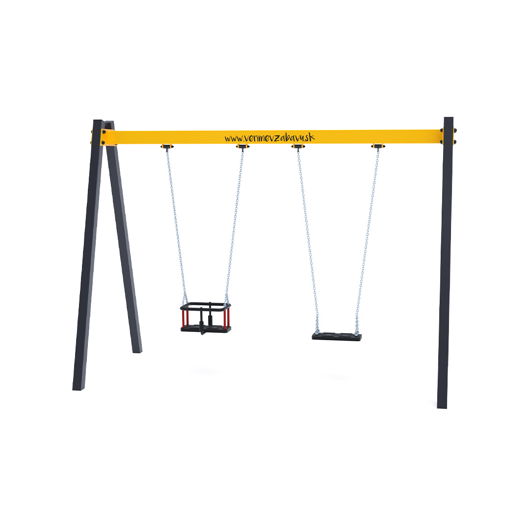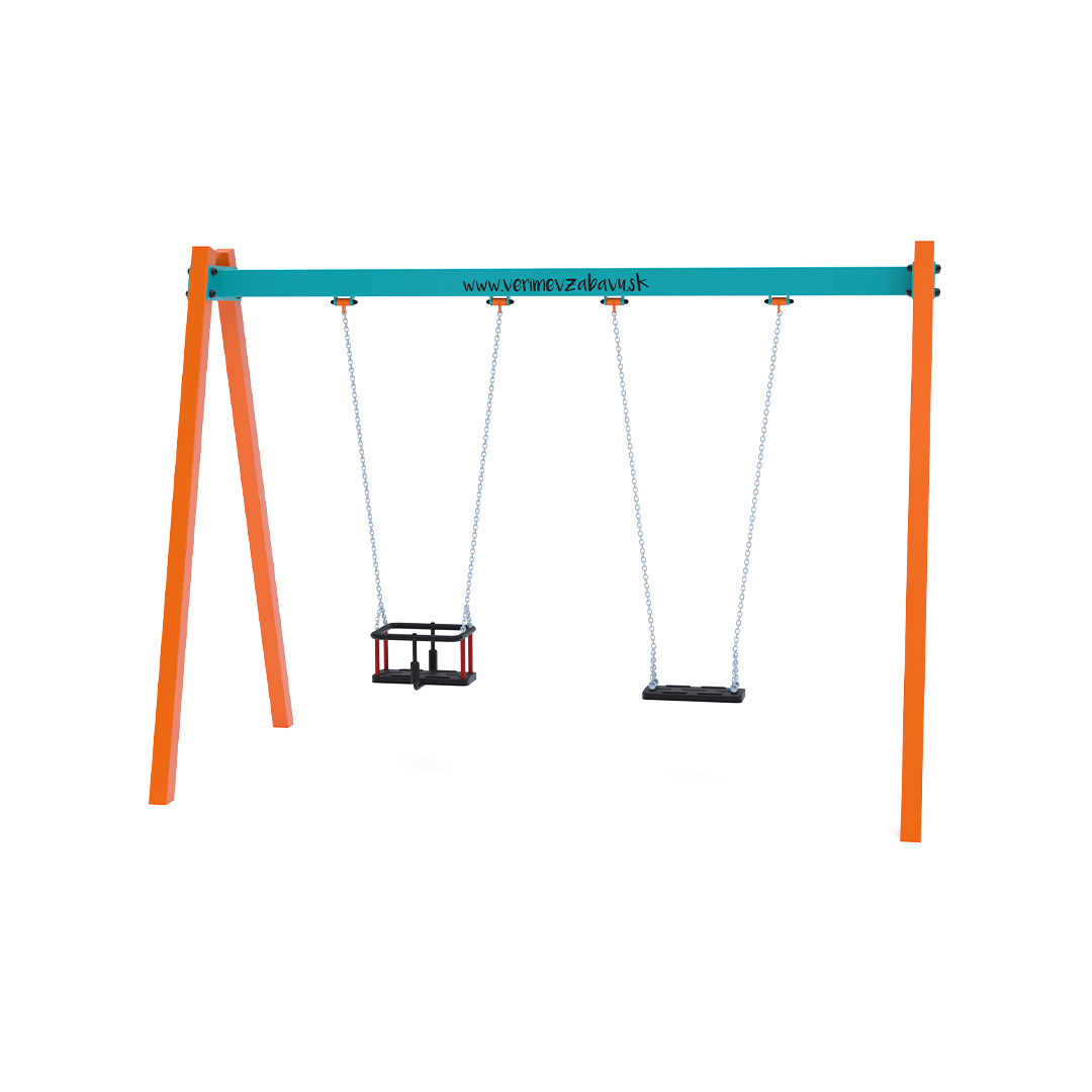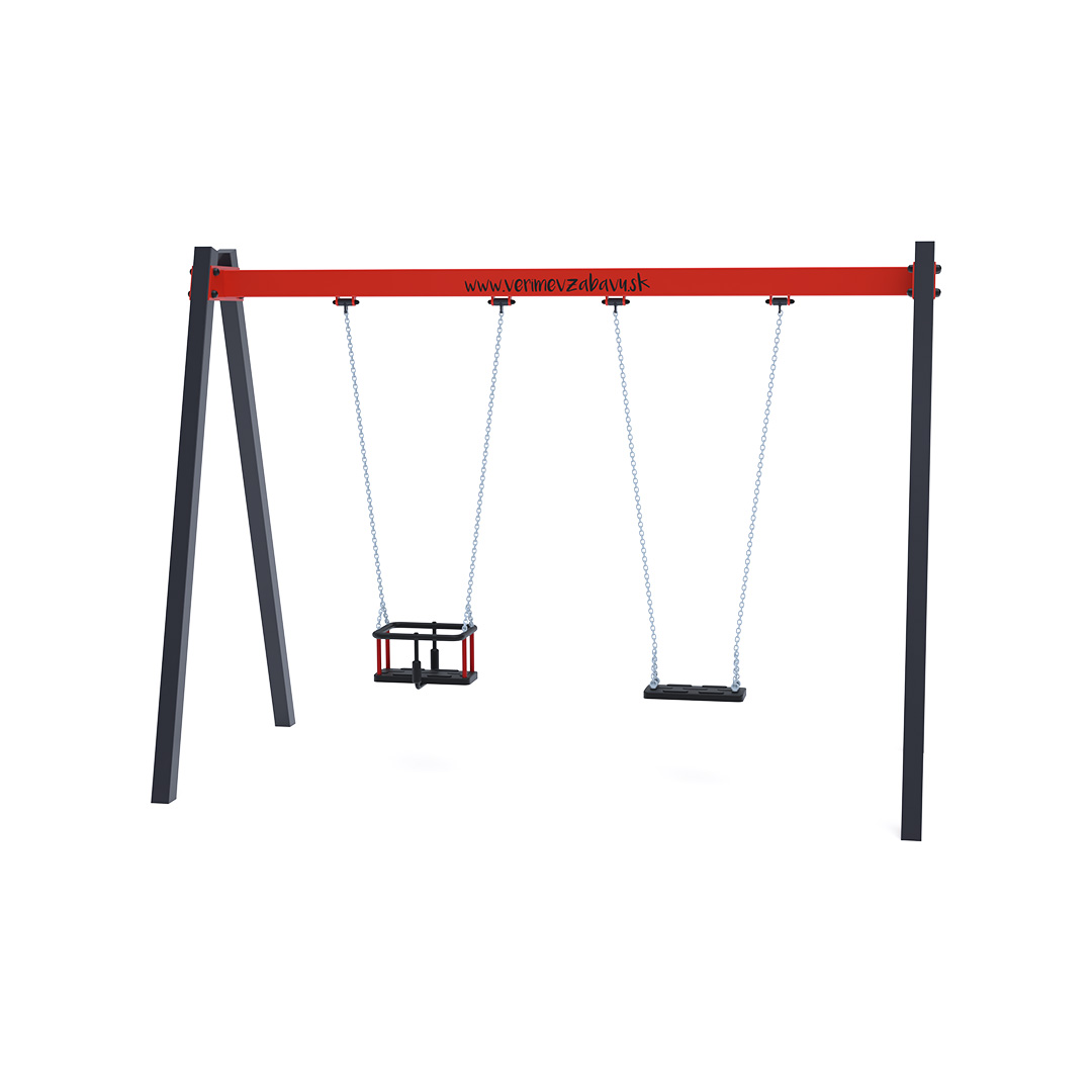 Hängeschaukel VVZ-VH007 Doppelhängeschaukel mit zwei Sitzen – einem klassischen Sitz und einem Babysitz. Sie ist aus feuerverzinktem Stahl gefertigt und pulverbeschichtet. Die Verbindungsstücke bestehen aus Edelstahl und sind mit Kunststoffkappen versehen, um Langlebigkeit und Sicherheit zu erhöhen. Als Fallschutz kann eine Grasmatte verwendet werden.
