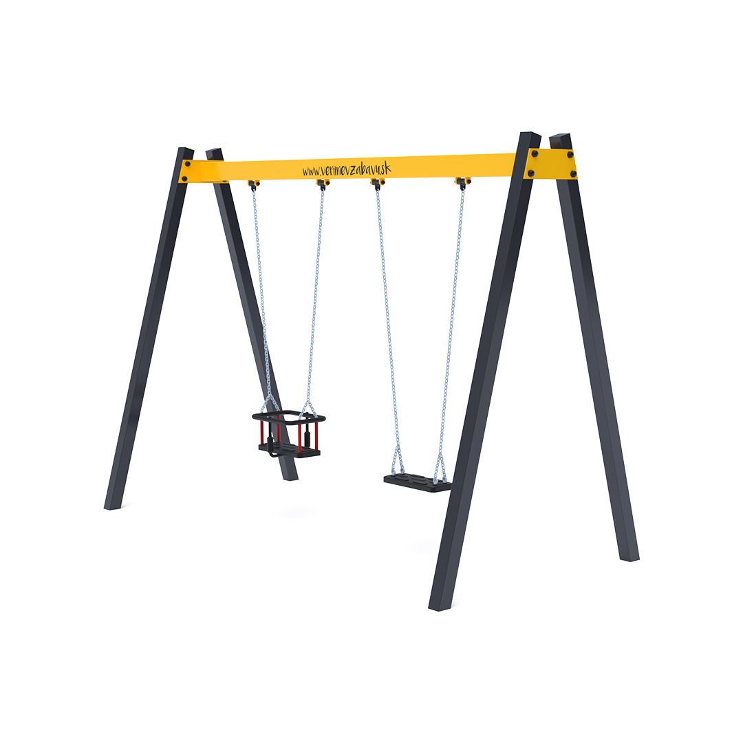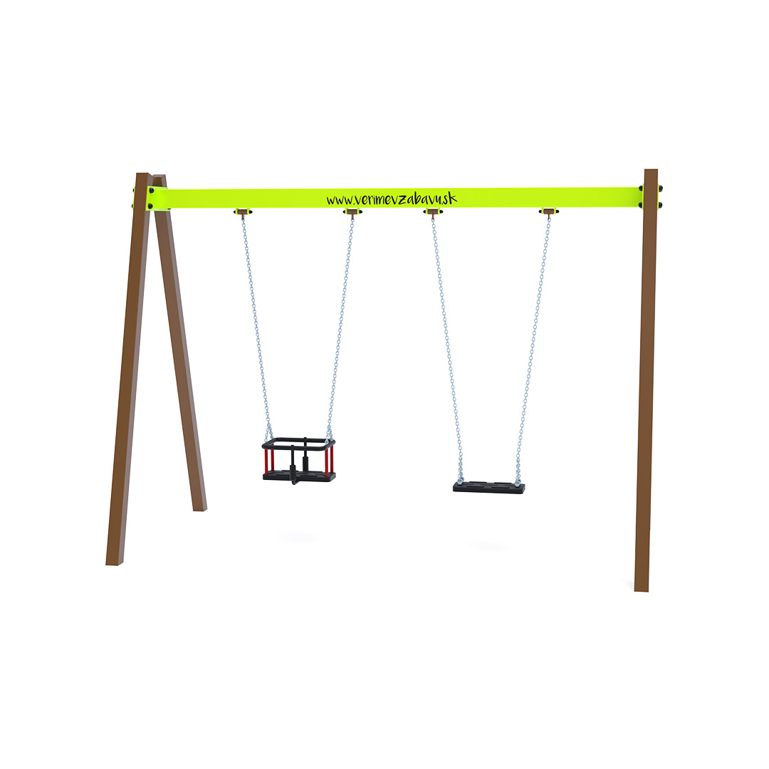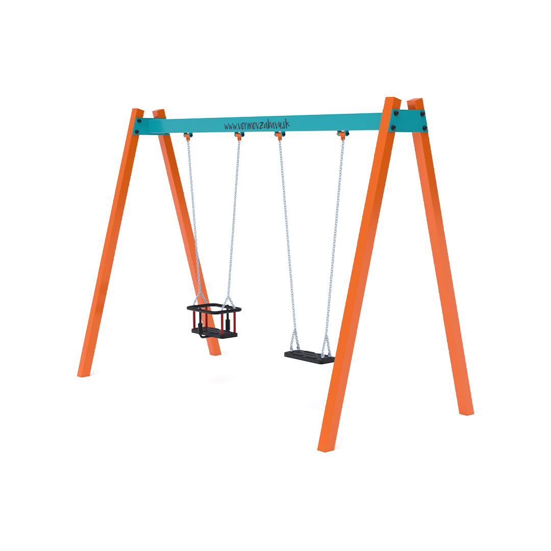 Hängeschaukel VVZ-VH007 Doppelhängeschaukel mit zwei Sitzen – einem klassischen Sitz und einem Babysitz. Sie ist aus feuerverzinktem Stahl gefertigt und pulverbeschichtet. Die Verbindungsstücke bestehen aus Edelstahl und sind mit Kunststoffkappen versehen, um Langlebigkeit und Sicherheit zu erhöhen. Als Fallschutz kann eine Grasmatte verwendet werden.