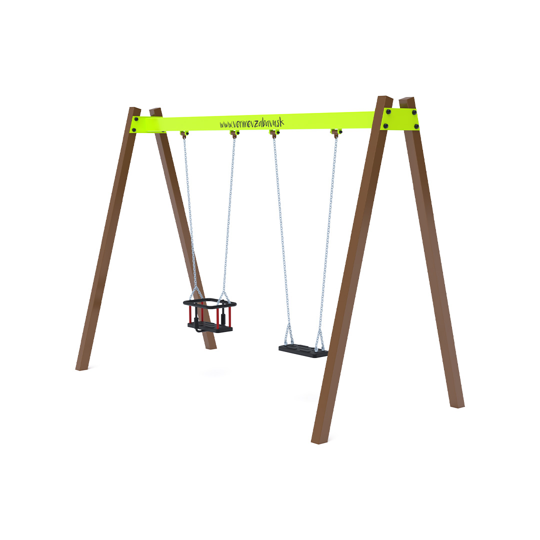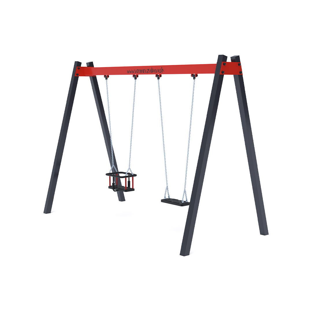 Doppelhängeschaukel mit zwei Sitzen – einem klassischen Sitz und einem Babysitz. Sie ist aus feuerverzinktem Stahl gefertigt und pulverbeschichtet. Die Verbindungsstücke bestehen aus Edelstahl und sind mit Kunststoffkappen versehen, um Langlebigkeit und Sicherheit zu erhöhen. Als Fallschutz kann eine Grasmatte verwendet werden.