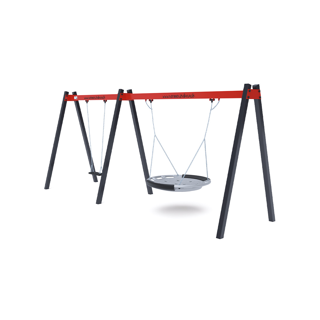 Hängeschaukel mit klassischem Sitz/Babysitz und Nestchen. Sie ist aus feuerverzinktem Stahl gefertigt und pulverbeschichtet. Die Verbindungsstücke bestehen aus Edelstahl und sind mit Kunststoffkappen versehen, um Langlebigkeit und Sicherheit zu erhöhen. Als Landefläche wird eine Grasmatte empfohlen.