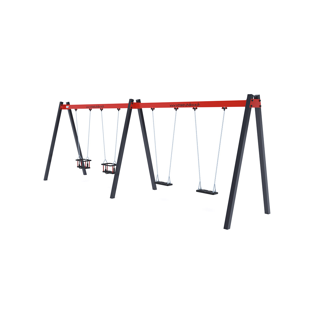 Hängeschaukel Die Hängeschaukel mit vier Sitzen (2 klassische und 2 Babysitze) ist aus feuerverzinktem Stahl gefertigt und pulverbeschichtet. Die Verbindungsstücke bestehen aus Edelstahl und sind mit Kunststoffkappen versehen, um Langlebigkeit und Sicherheit zu erhöhen. Als Landefläche wird eine Grasmatte empfohlen.