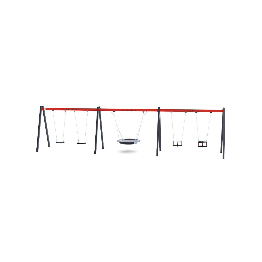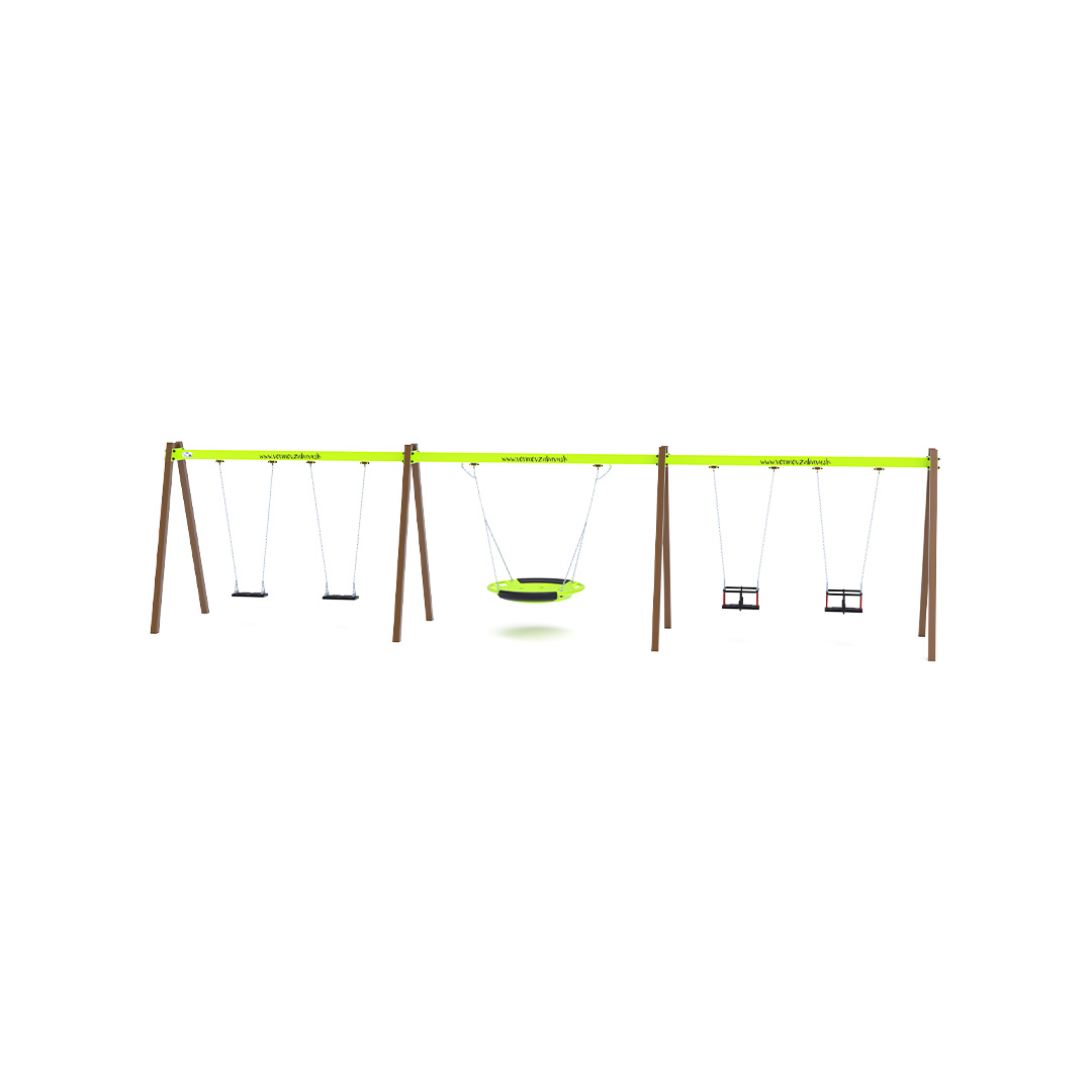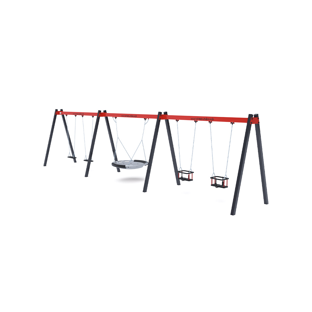 Die Hängeschaukel mit verschiedenen Sitzen – 2 klassische und 2 Babysitze – wird durch ein Nestchen ergänzt. Sie ist aus feuerverzinktem Stahl gefertigt und pulverbeschichtet. Die Verbindungsstücke bestehen aus Edelstahl und sind mit Kunststoffkappen versehen, um Langlebigkeit und Sicherheit zu erhöhen. Als Fallschutz kann eine Grasmatte verwendet werden.
