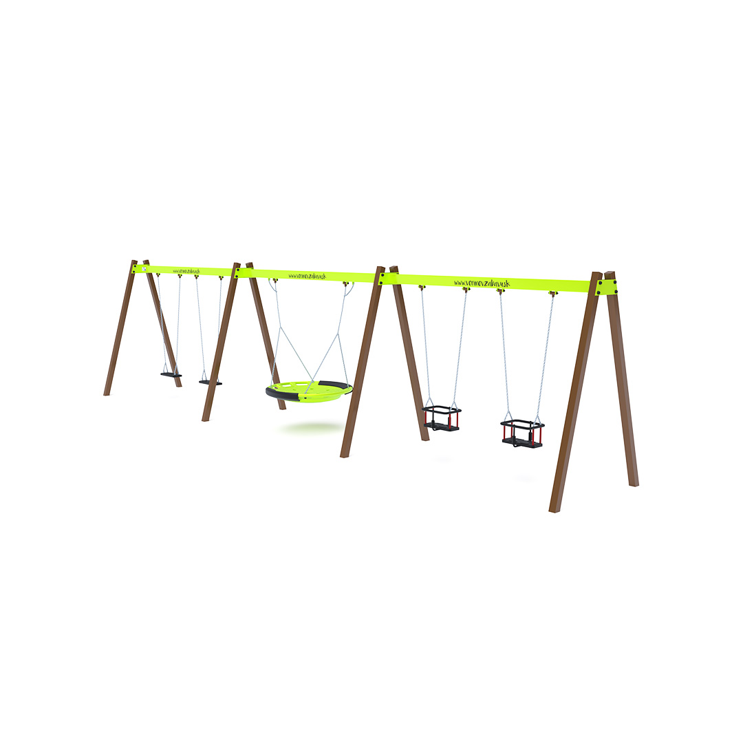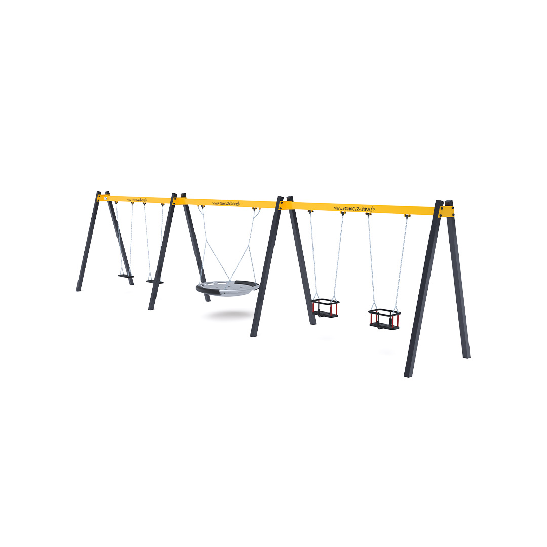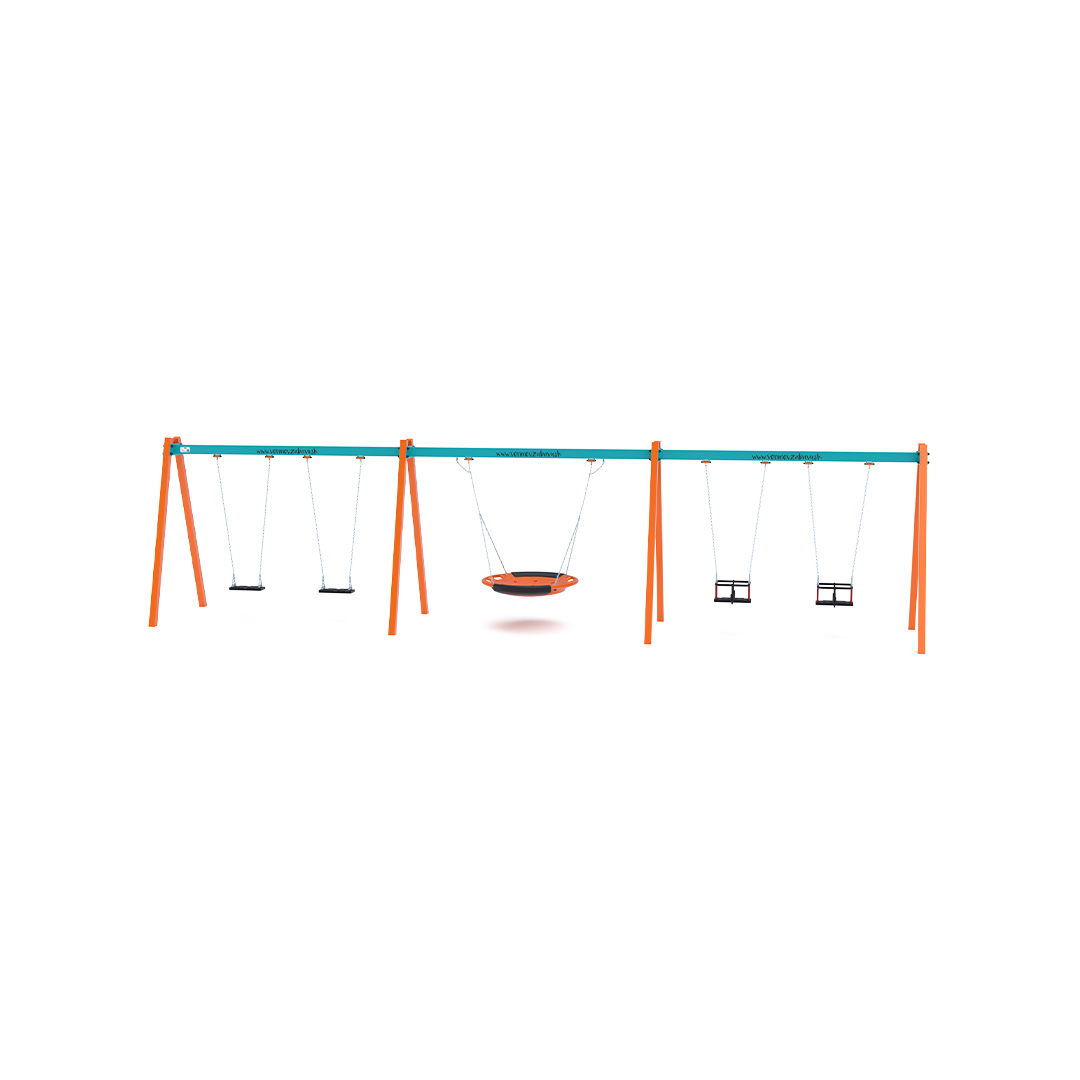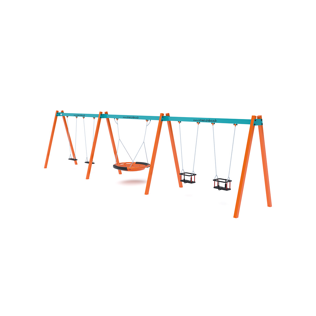 Die Hängeschaukel mit verschiedenen Sitzen – 2 klassische und 2 Babysitze – wird durch ein Nestchen ergänzt. Sie ist aus feuerverzinktem Stahl gefertigt und pulverbeschichtet. Die Verbindungsstücke bestehen aus Edelstahl und sind mit Kunststoffkappen versehen, um Langlebigkeit und Sicherheit zu erhöhen. Als Fallschutz kann eine Grasmatte verwendet werden.