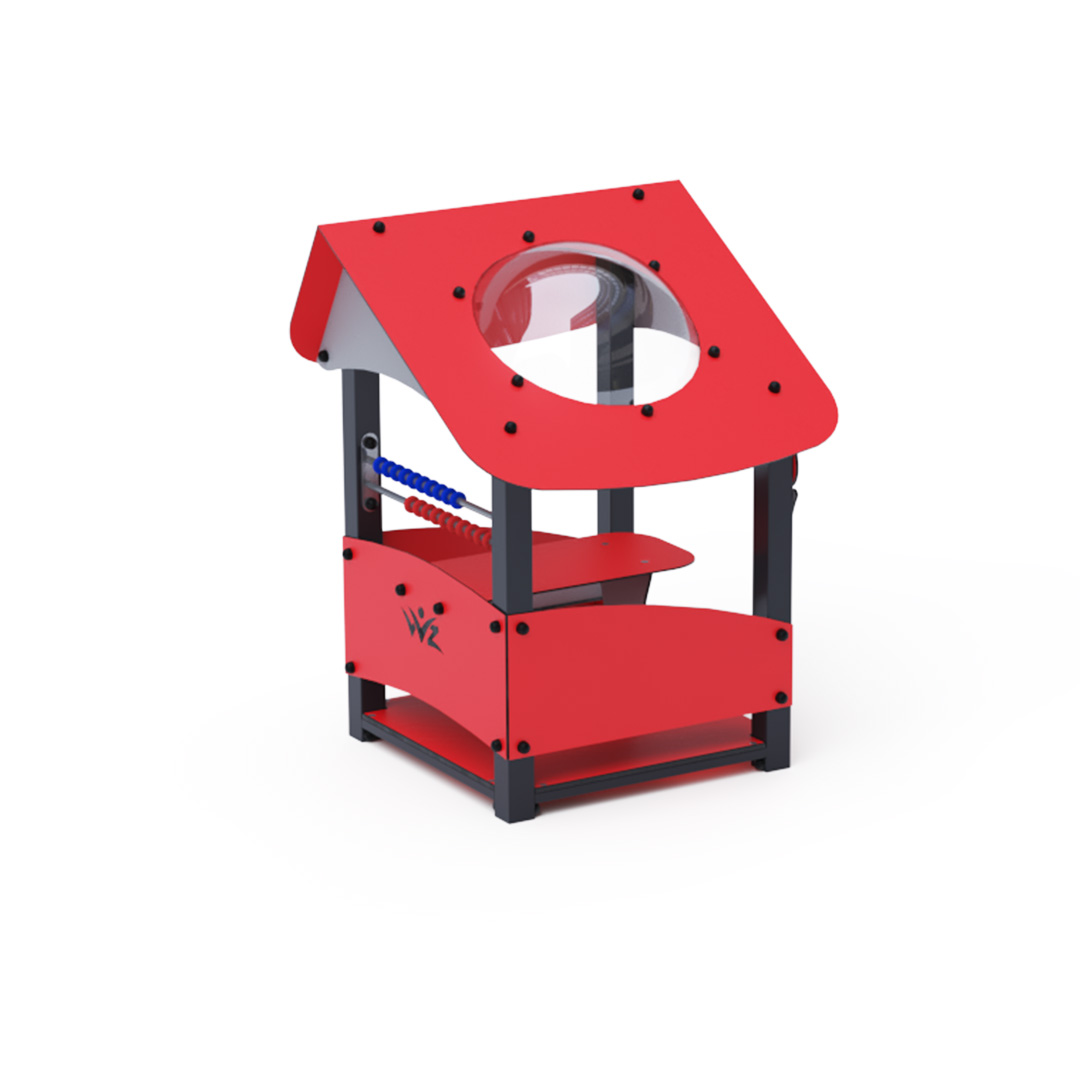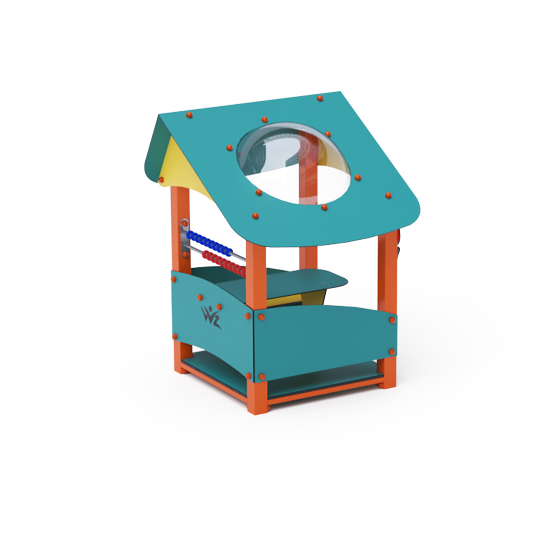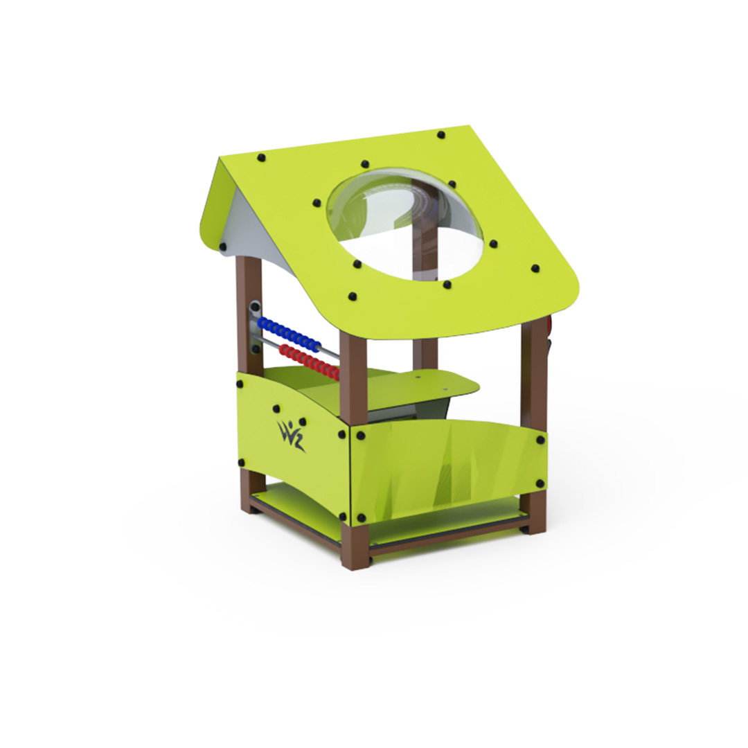 Ein kleines Haus mit schrägem Dach und kleiner Theke ist ein ideales Spielset für Kindergärten.