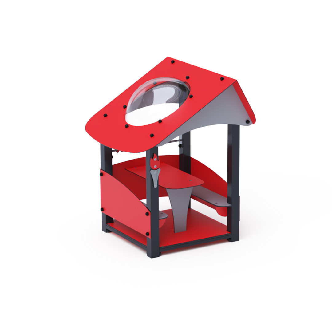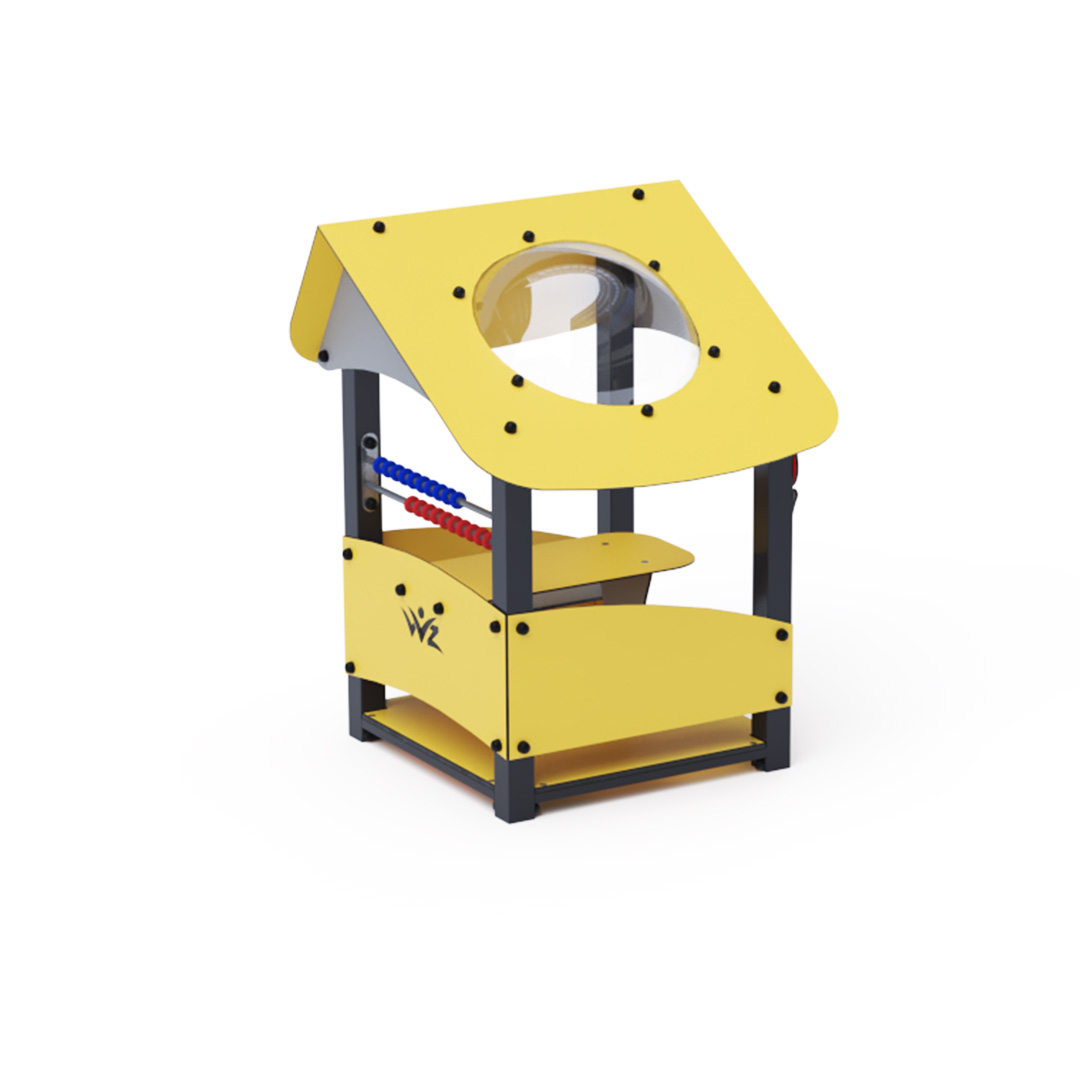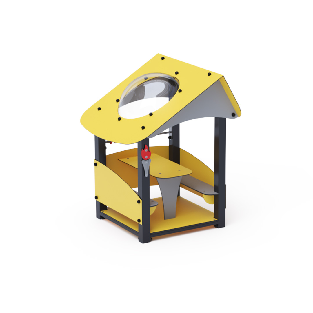 Ein kleines Haus mit schrägem Dach und kleiner Theke ist ein ideales Spielset für Kindergärten.