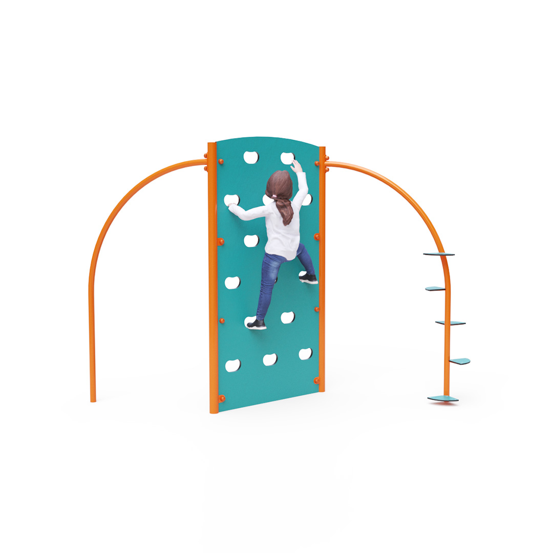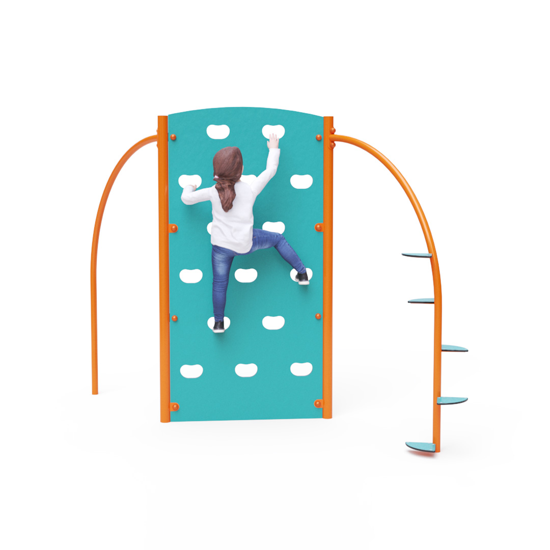 Doppelseitige Kletterwand mit Kletterstange und Kletterstufen. Obwohl dieses Spielgerät auf den ersten Blick eher für Kinder und Jugendliche gedacht und nicht unbedingt für Spielplätze geeignet erscheint, lieben Kinder Kletterwände. Die Konstruktion des Kletterturms besteht aus verzinktem Stahl mit Pulverbeschichtung. Sie ist auf Langlebigkeit und Sicherheit ausgelegt. Die Wände sind aus HPL-Material gefertigt. Klettergriffe sind in die Wand eingelassen. Es wird empfohlen, eine Grasmatte als Landefläche zu verwenden.