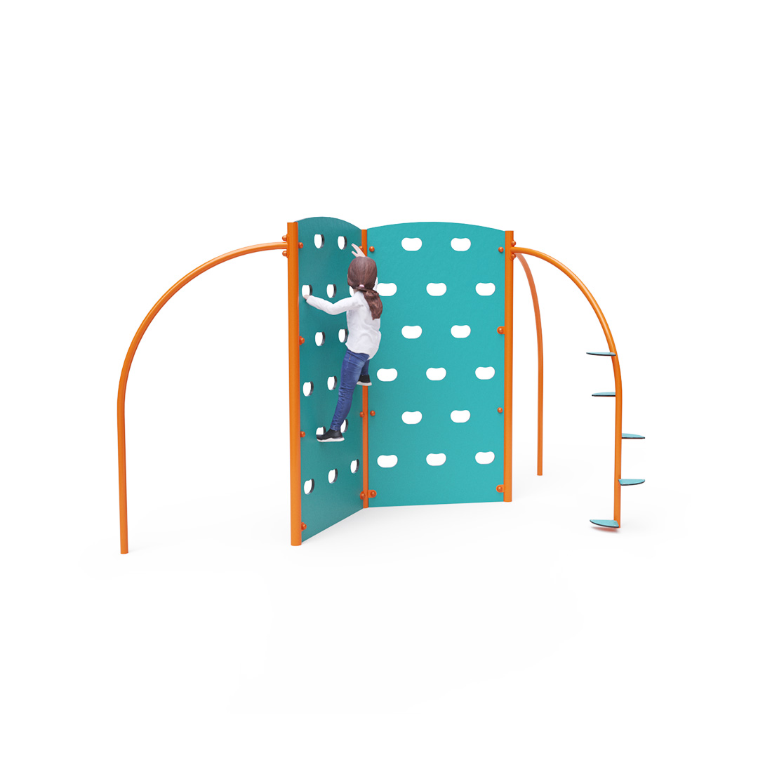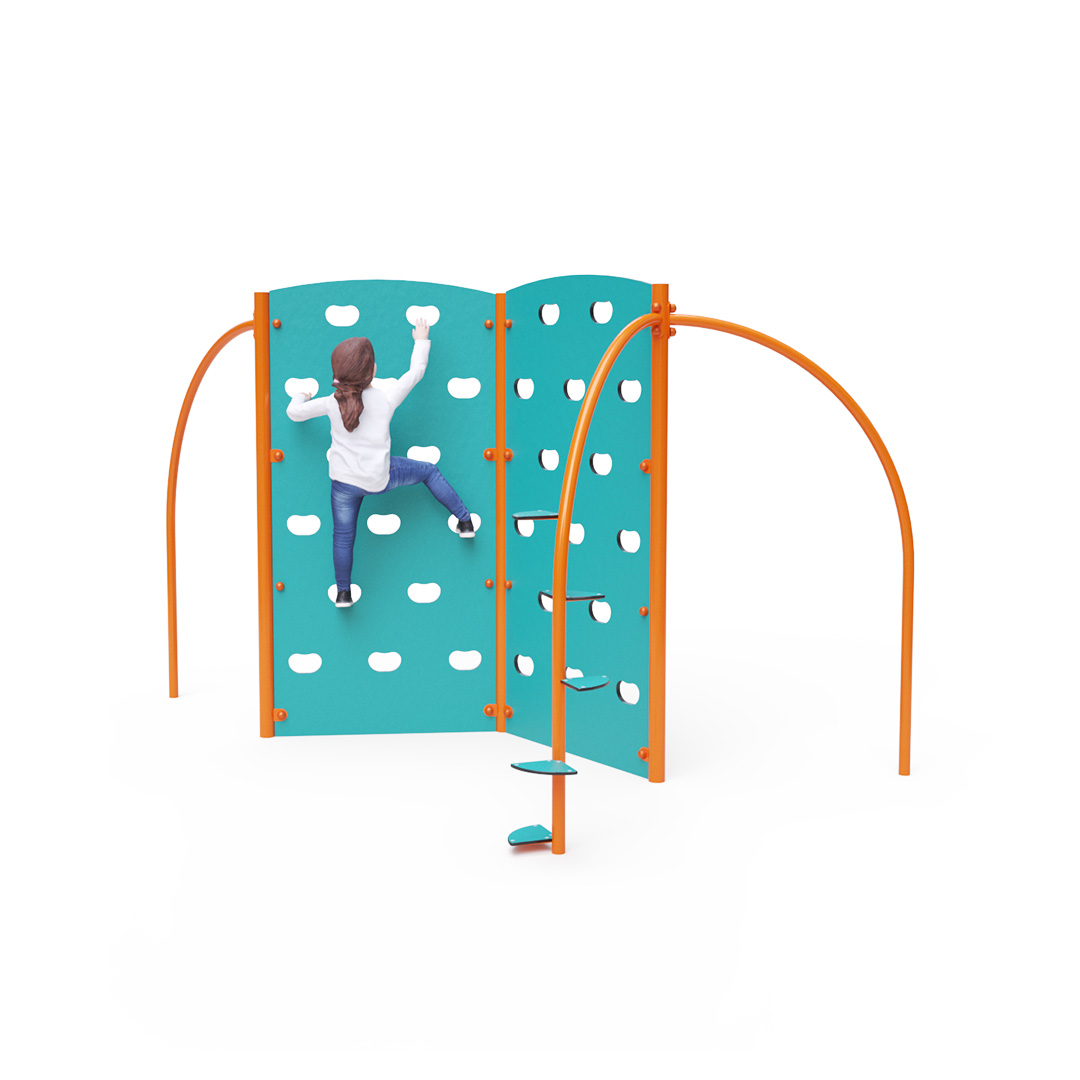 Doppelte Kletterwand mit Kletterstangen und Kletterstufen. Obwohl dieses Spielgerät auf den ersten Blick eher für Kinder und Jugendliche gedacht und nicht unbedingt für Spielplätze geeignet erscheint, lieben Kinder Kletterwände. Die Konstruktion des Kletterturms besteht aus verzinktem Stahl mit Pulverbeschichtung. Sie ist auf Langlebigkeit und Sicherheit ausgelegt. Die Wände sind aus HPL-Material gefertigt. Klettergriffe sind in die Wand eingelassen. Es wird empfohlen, eine Grasmatte als Landefläche zu verwenden.