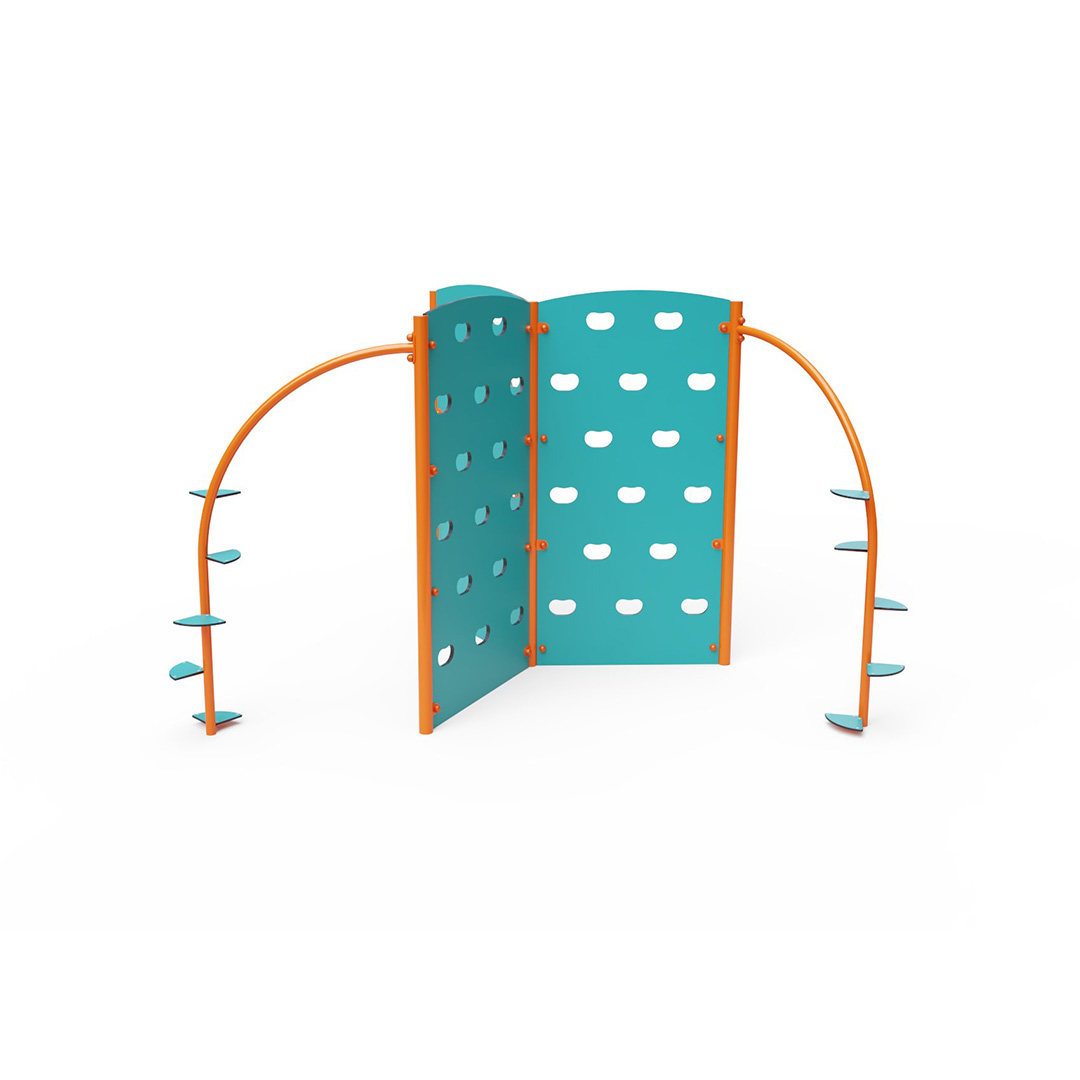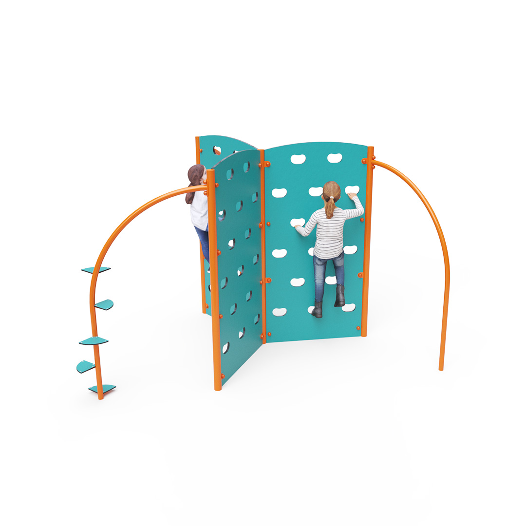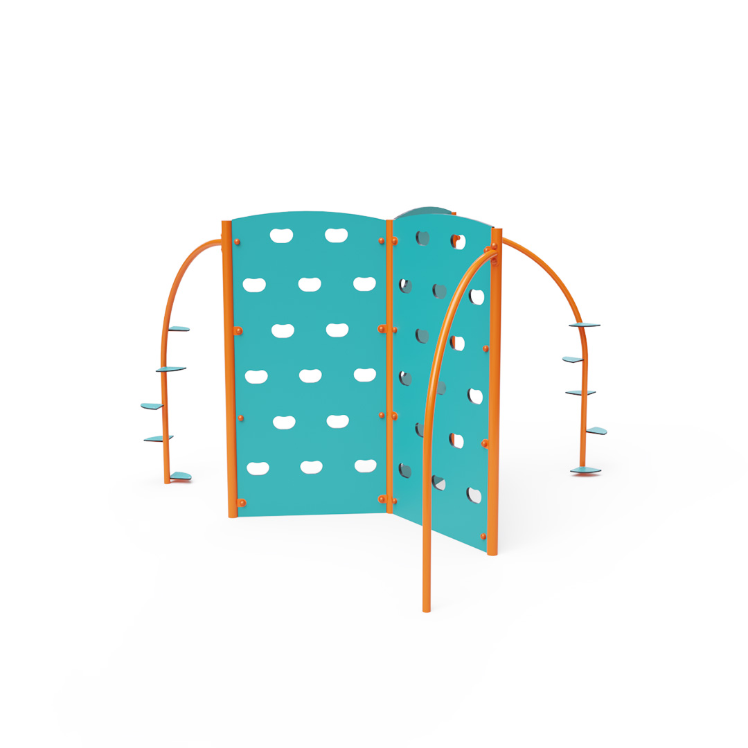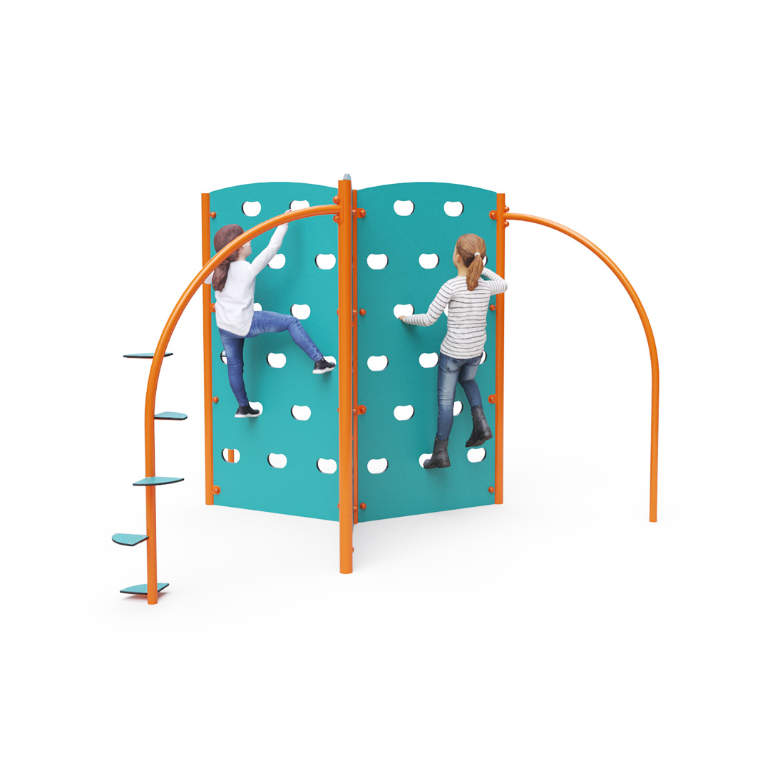 Dreifache Kletterwand mit Kletterstangen und Kletterstufen. Obwohl dieses Spielgerät auf den ersten Blick eher für Kinder und Jugendliche gedacht und nicht unbedingt für Spielplätze geeignet erscheint, lieben Kinder Kletterwände. Die Konstruktion des Kletterturms besteht aus verzinktem Stahl mit Pulverbeschichtung. Sie ist auf Langlebigkeit und Sicherheit ausgelegt. Die Wände sind aus HPL-Material gefertigt. Klettergriffe sind in die Wand eingelassen. Es wird empfohlen, eine Grasmatte als Landefläche zu verwenden.