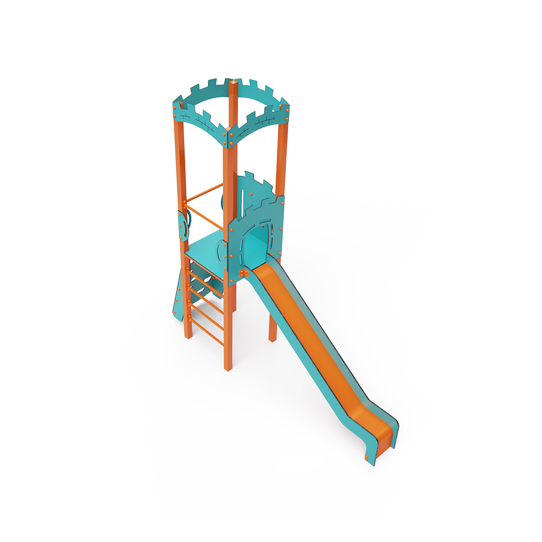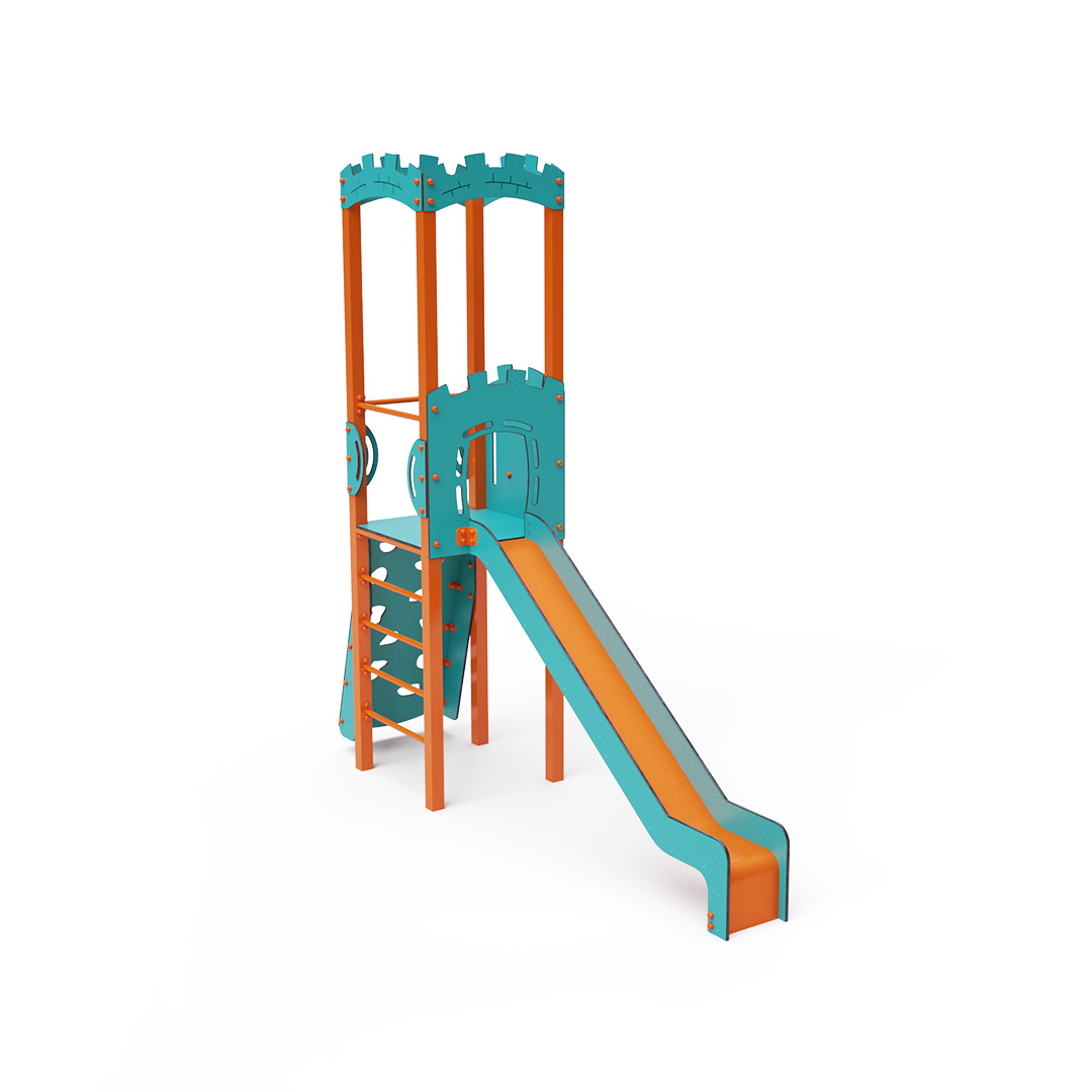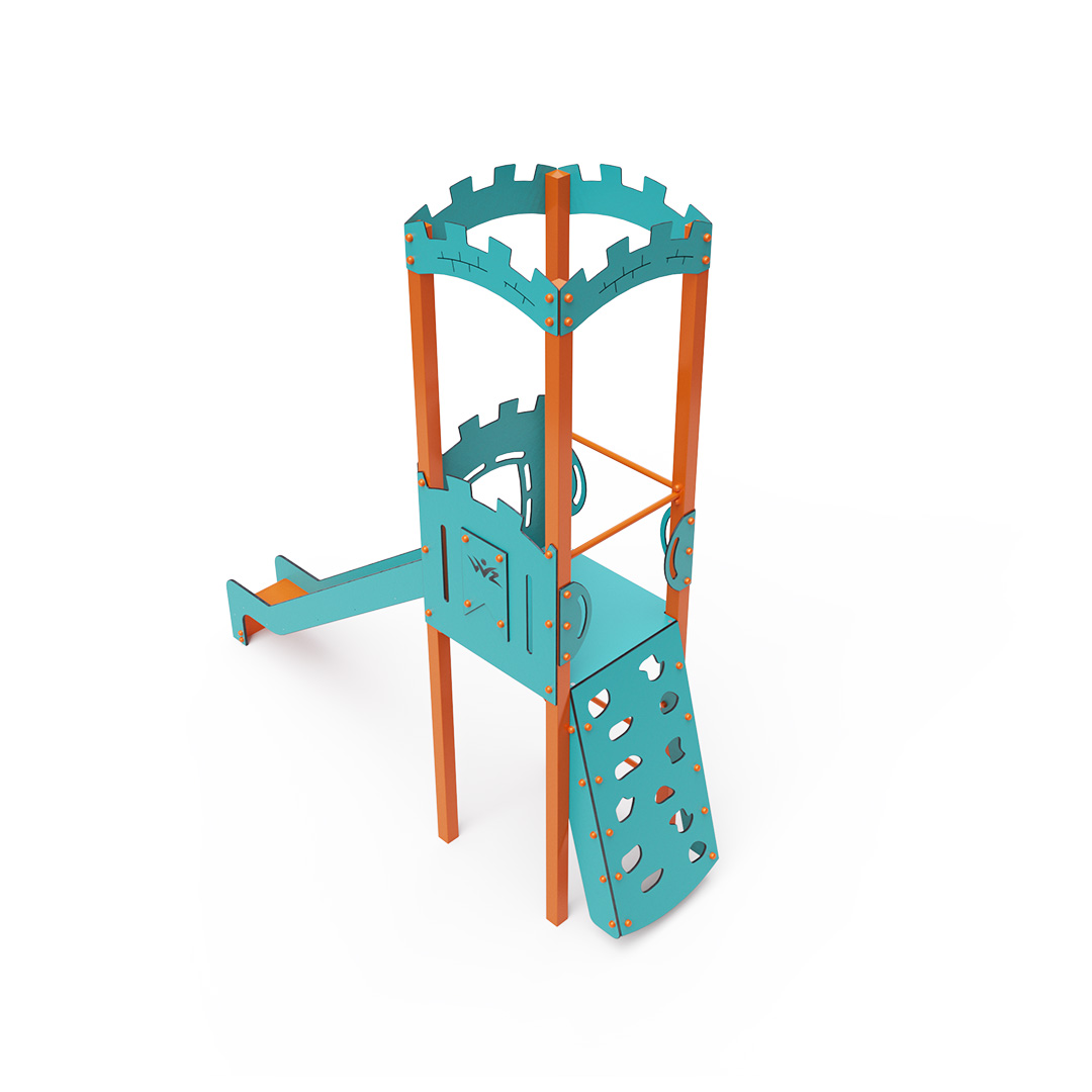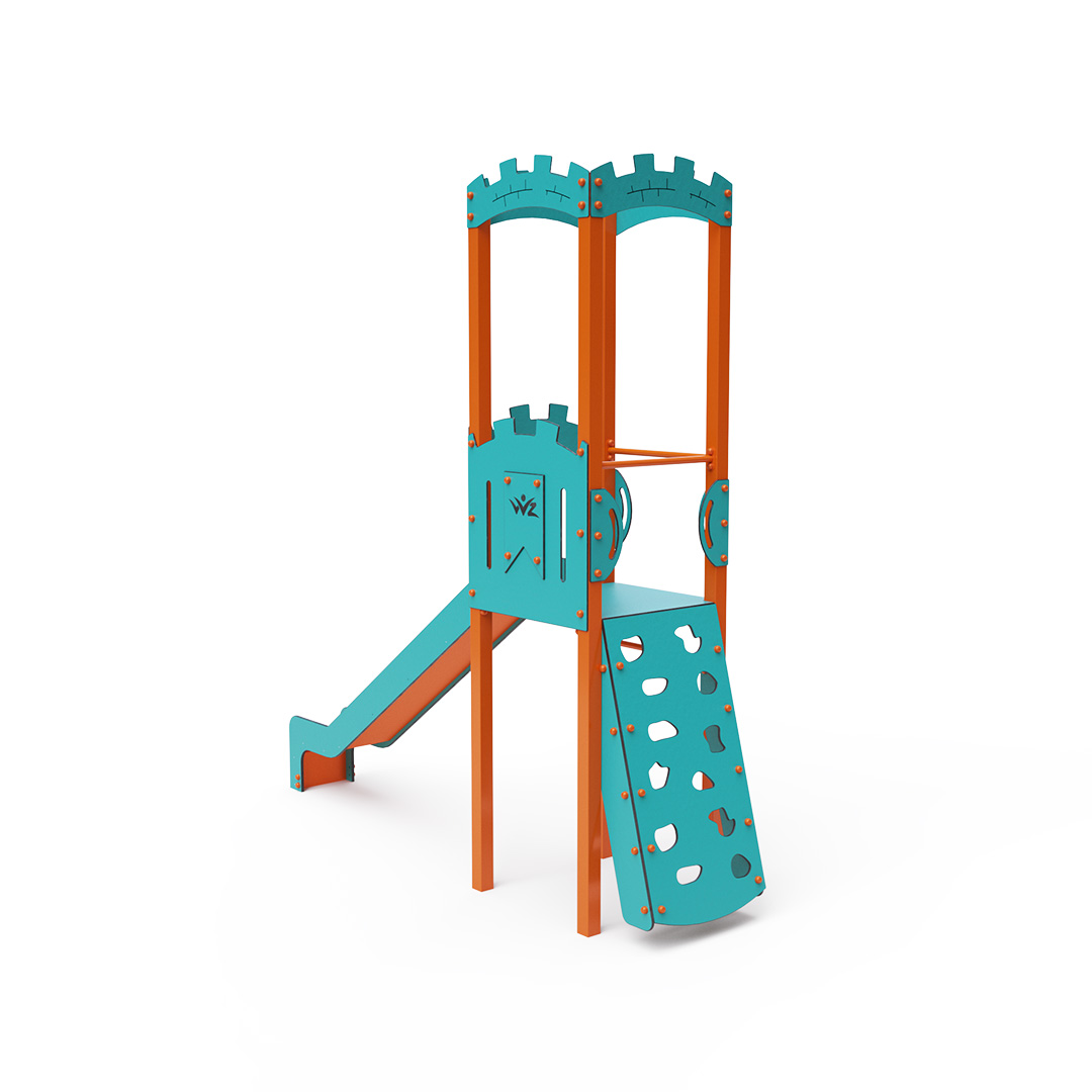 Kombiniertes Kletterturm-Set – ein Turm mit Wänden, an denen Kinder hochklettern oder eine geriffelte Kletterstruktur nutzen und anschließend eine Rutsche hinuntersausen können. Die Stahlkonstruktion ist dank Verzinkung und strapazierfähiger Pulverbeschichtung witterungsbeständig. Das verwendete HPL-Material ist chemikalienbeständig, UV-beständig, farbecht, ungiftig, recycelbar und bruchfest. Es besteht keine Verletzungsgefahr durch scharfe Kanten oder Splitter. Alle Verbindungen sind aus Edelstahl und mit Kunststoffkappen versehen, um Langlebigkeit und Sicherheit zu erhöhen.