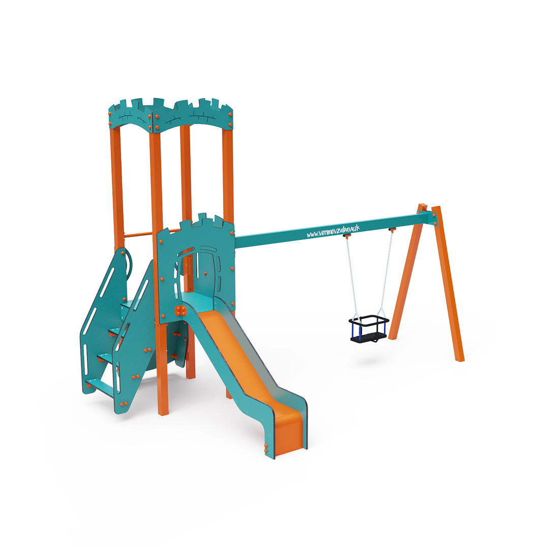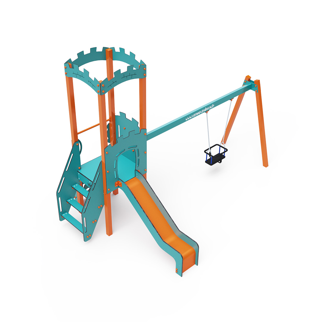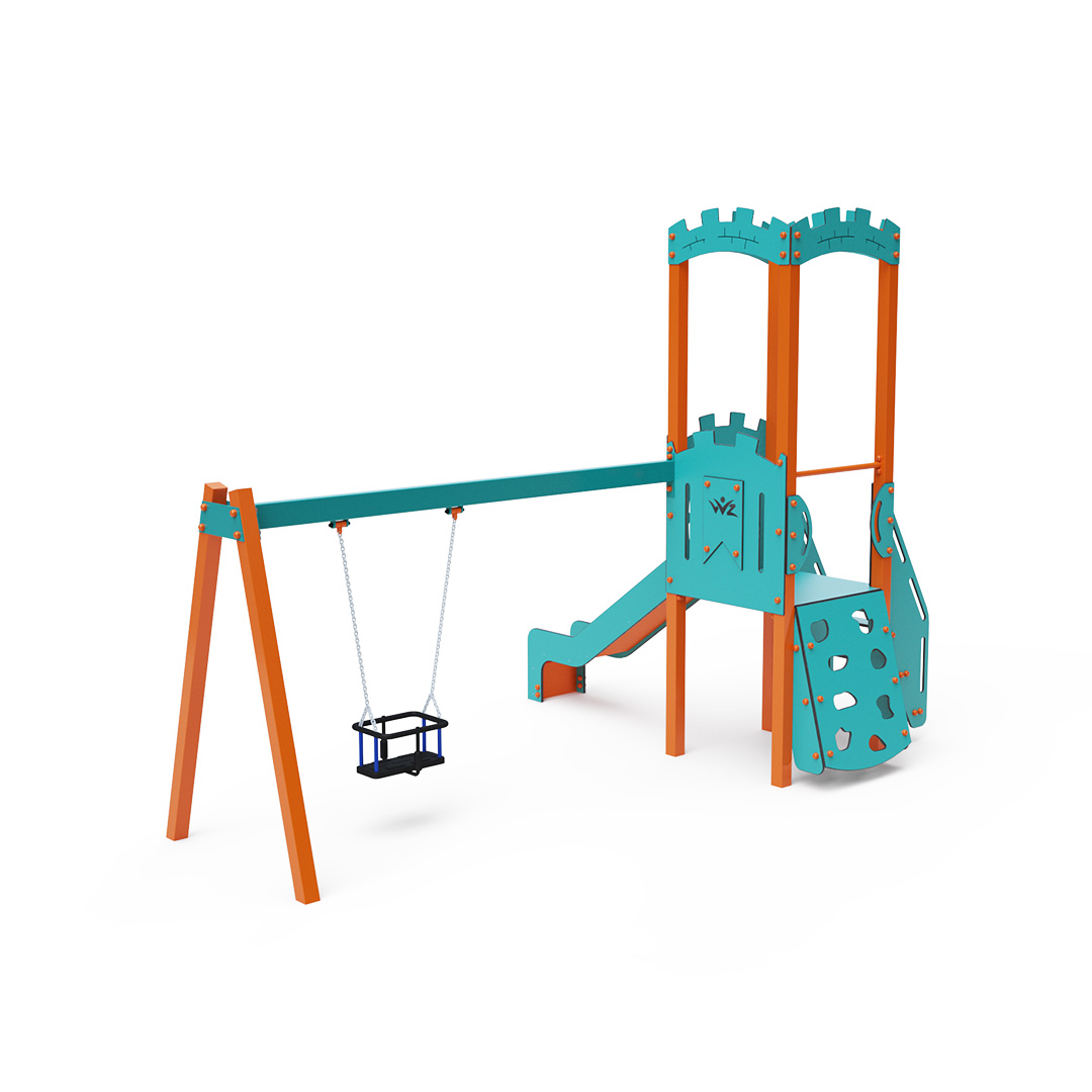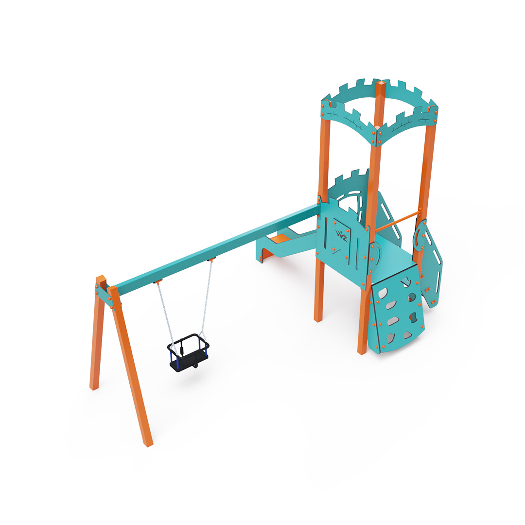 Kombiniertes Turm-Set – ein Turm mit Wänden, an denen Kinder über Stufen oder die Kletterwand mit Griffen hochklettern und die Rutsche hinuntersausen können. Das Spielset beinhaltet eine Schaukelstange mit einem klassischen oder Babysitz. Das türkis-orange Design zieht schon von Weitem die Blicke auf sich. Die Stahlkonstruktion ist dank Feuerverzinkung und strapazierfähiger Pulverbeschichtung witterungsbeständig. Das verwendete HPL-Material ist chemikalienbeständig, UV-beständig, farbecht, ungiftig, recycelbar und bruchfest. Es besteht keine Verletzungsgefahr durch scharfe Kanten oder Splitter. Alle Verbindungen sind aus Edelstahl und mit Kunststoffkappen versehen, um Langlebigkeit und Sicherheit zu erhöhen.