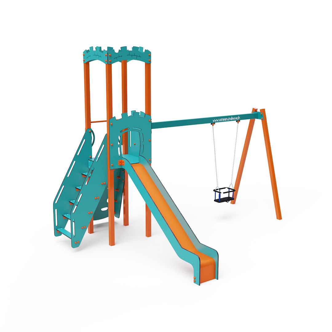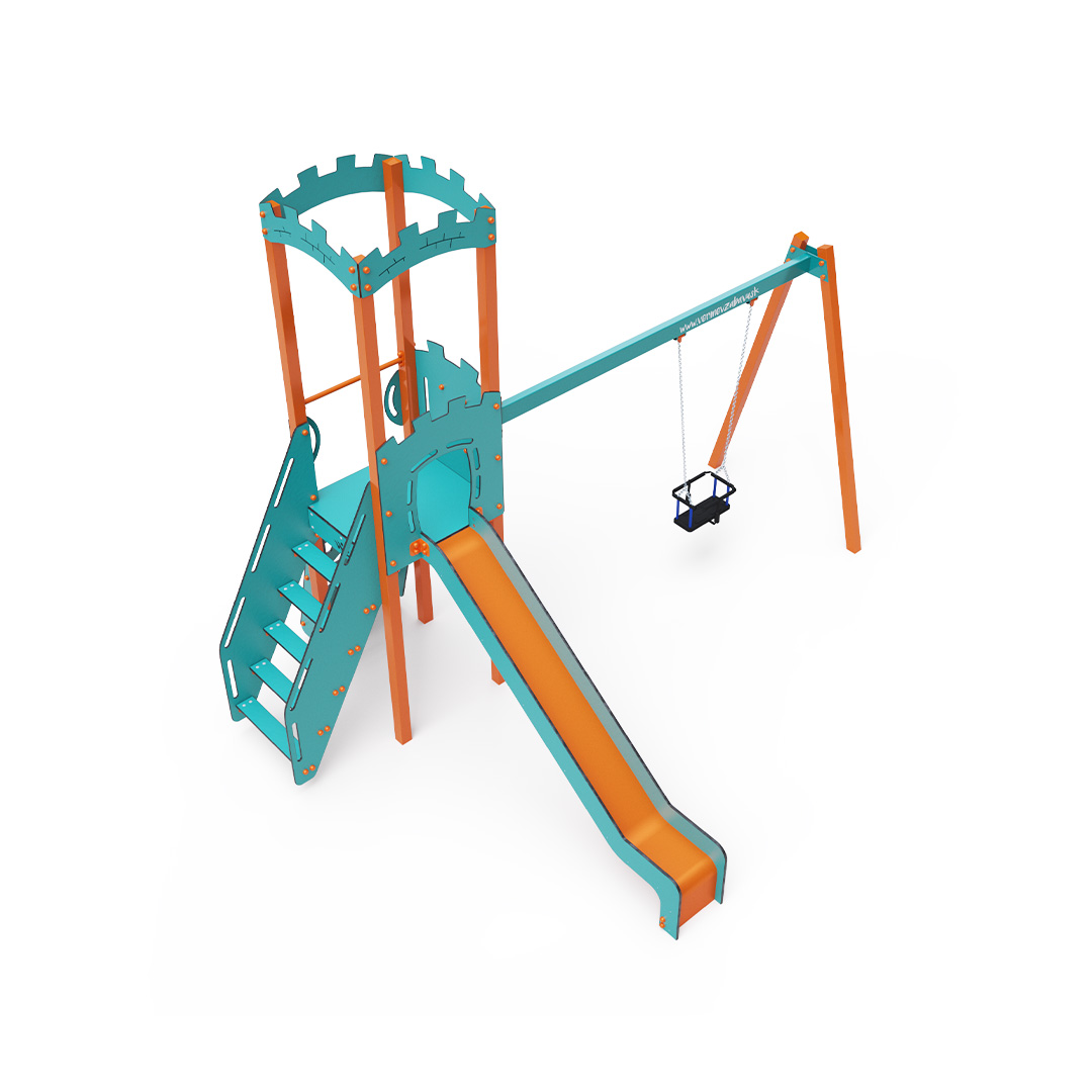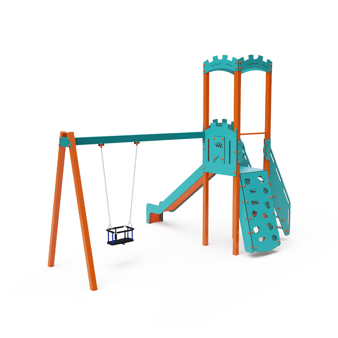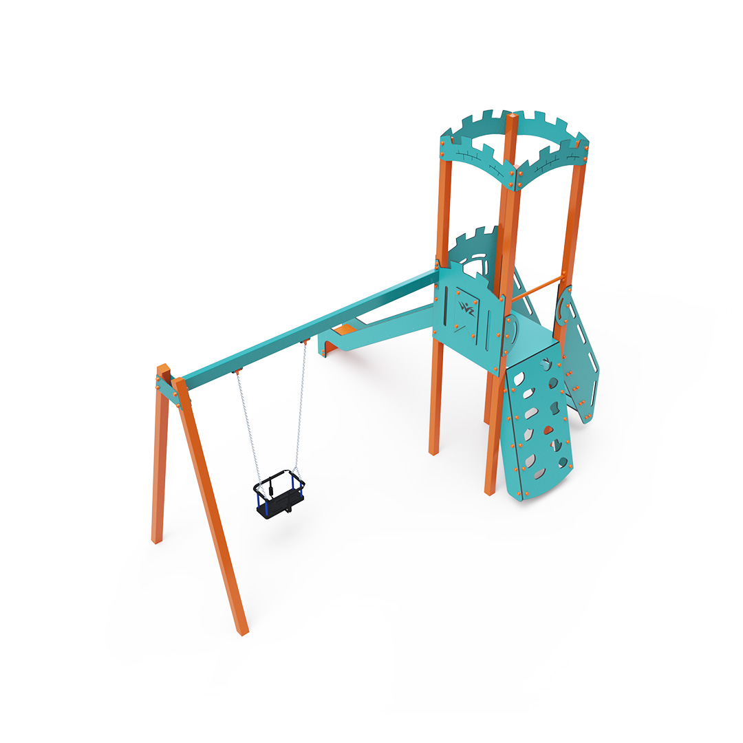 Kombiniertes Turm-Set – ein Turm mit Wänden, an denen Kinder über Stufen oder die Kletterwand mit Griffen hochklettern und die Rutsche hinuntersausen können. Das Spielset beinhaltet eine Schaukelstange mit einem klassischen oder Babysitz. Das türkis-orange Design zieht schon von Weitem die Blicke auf sich. Die Stahlkonstruktion ist dank Feuerverzinkung und strapazierfähiger Pulverbeschichtung witterungsbeständig. Das verwendete HPL-Material ist chemikalienbeständig, UV-beständig, farbecht, ungiftig, recycelbar und bruchfest. Es besteht keine Verletzungsgefahr durch scharfe Kanten oder Splitter. Alle Verbindungen sind aus Edelstahl und mit Kunststoffkappen versehen, um Haltbarkeit und Sicherheit zu erhöhen.